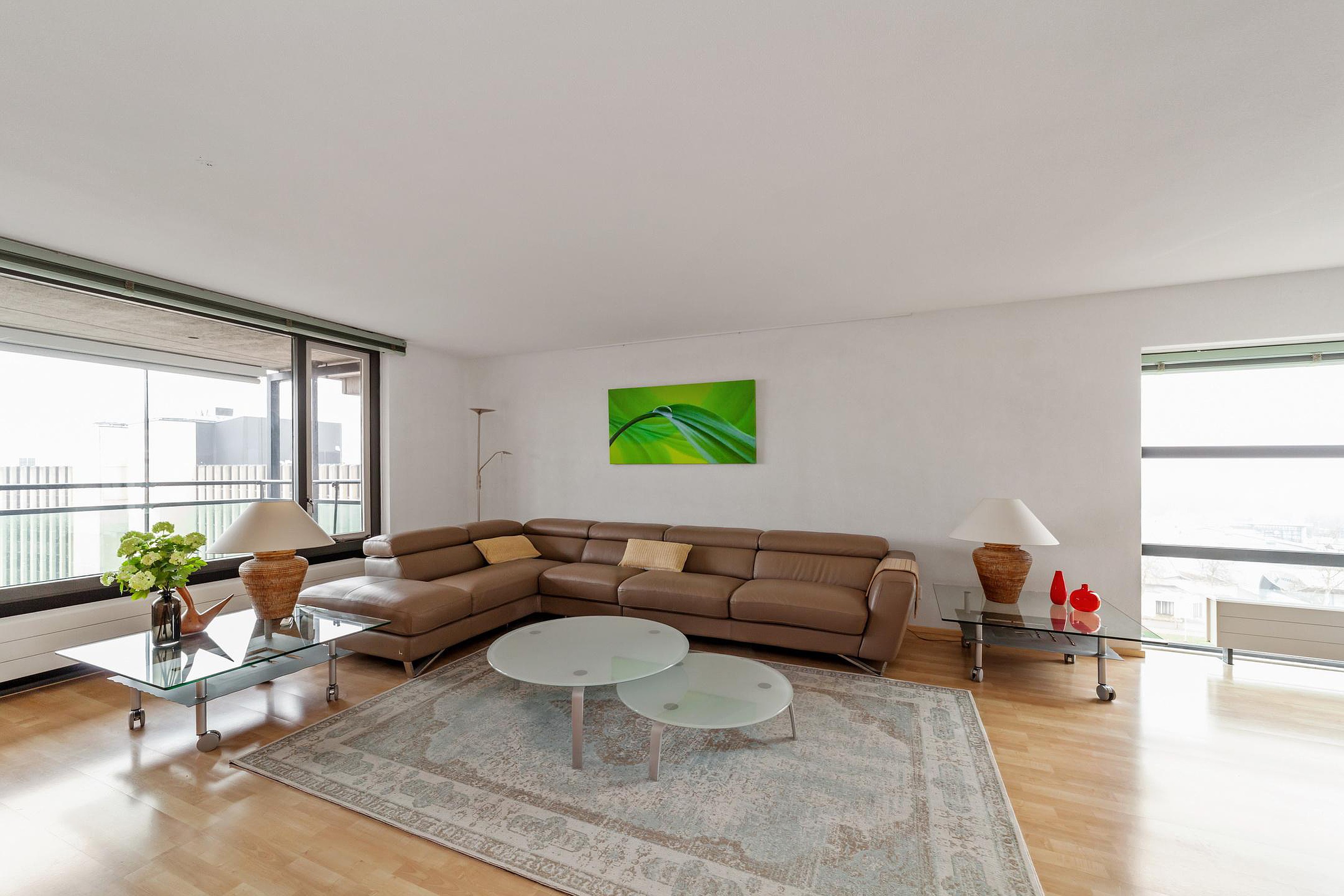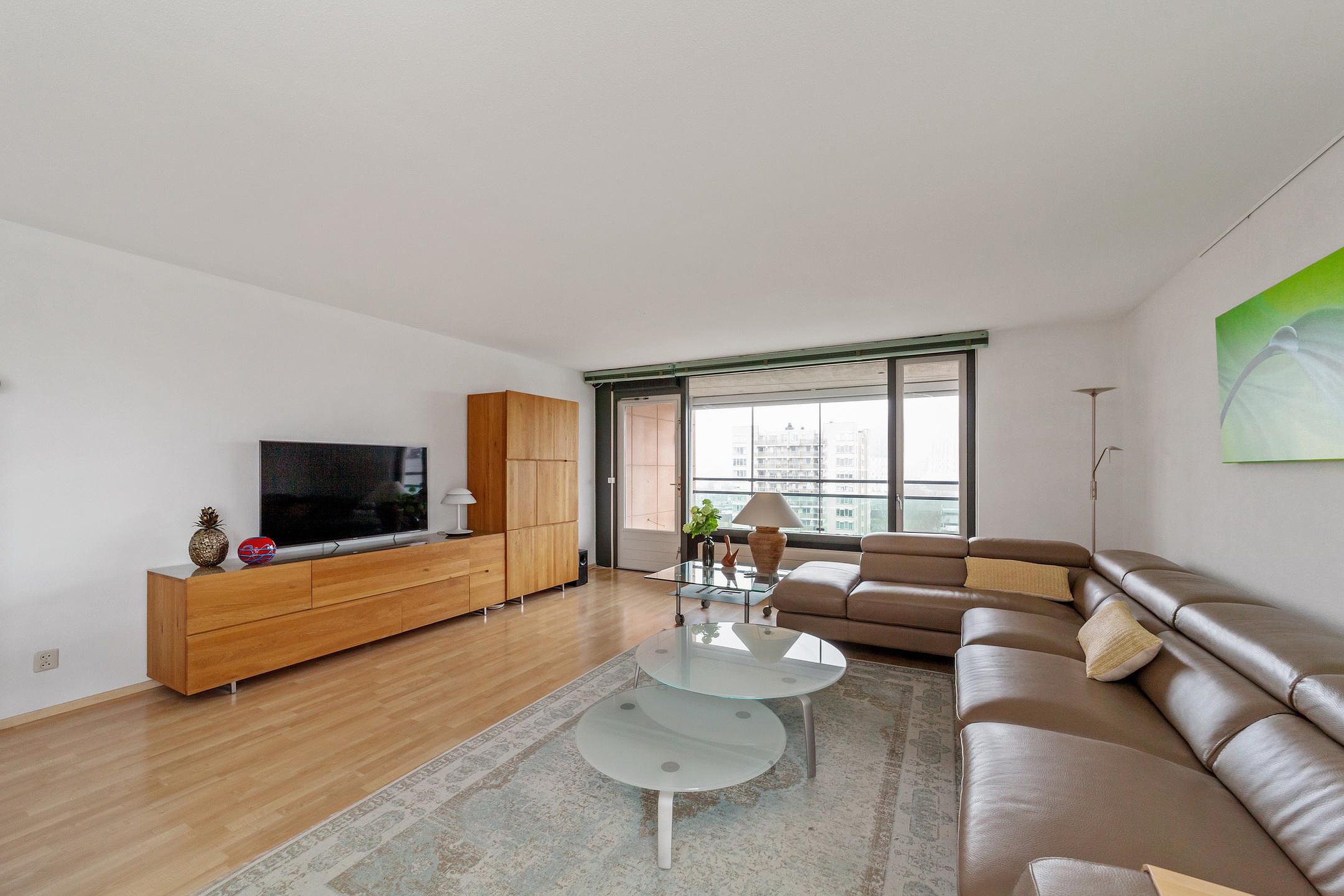 Lichte woonkamer met ruim zicht over de stad en toegang tot het afsluitbare balkon,