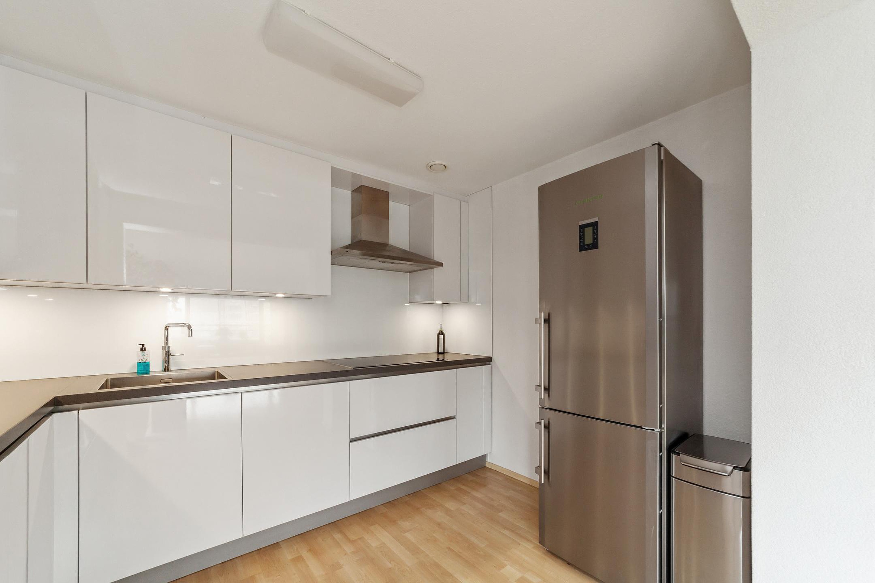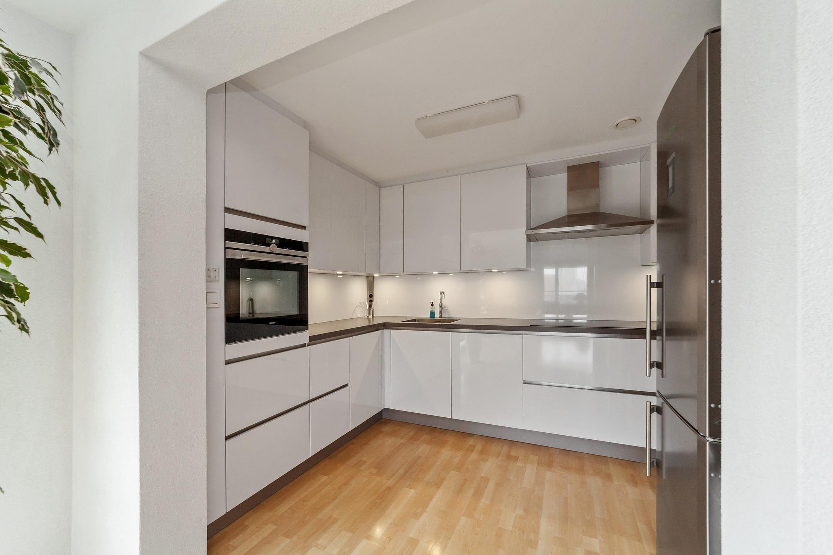 The neutral-colored kitchen is equipped with the following built-in appliances: combination oven, dishwasher, extra-large induction cooktop, extractor hood, Quooker, and small pantry cupboard.