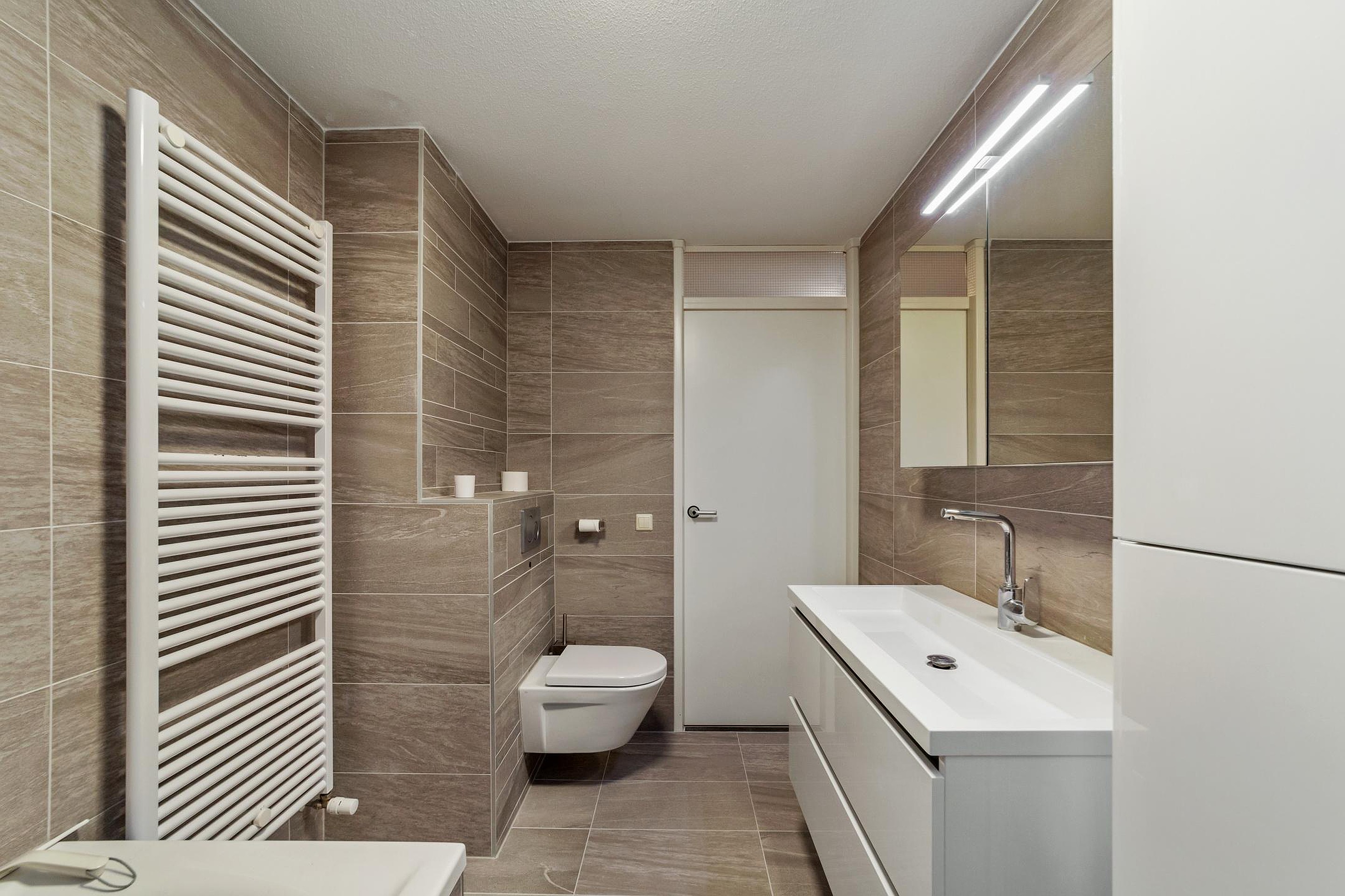 De moderne badkamer is compleet uitgevoerd met een ligbad, inloop (regen)douche, hangend (2e) toilet en wastafelmeubel met spiegelkast.