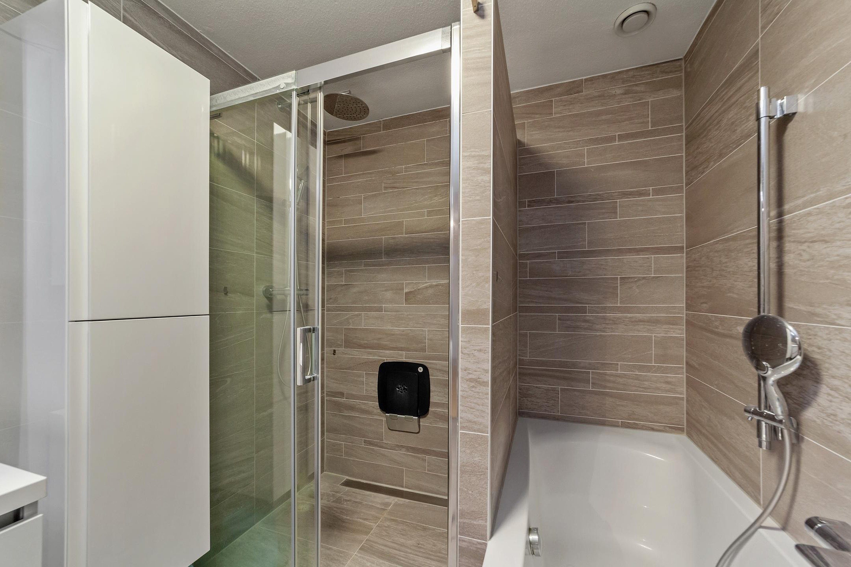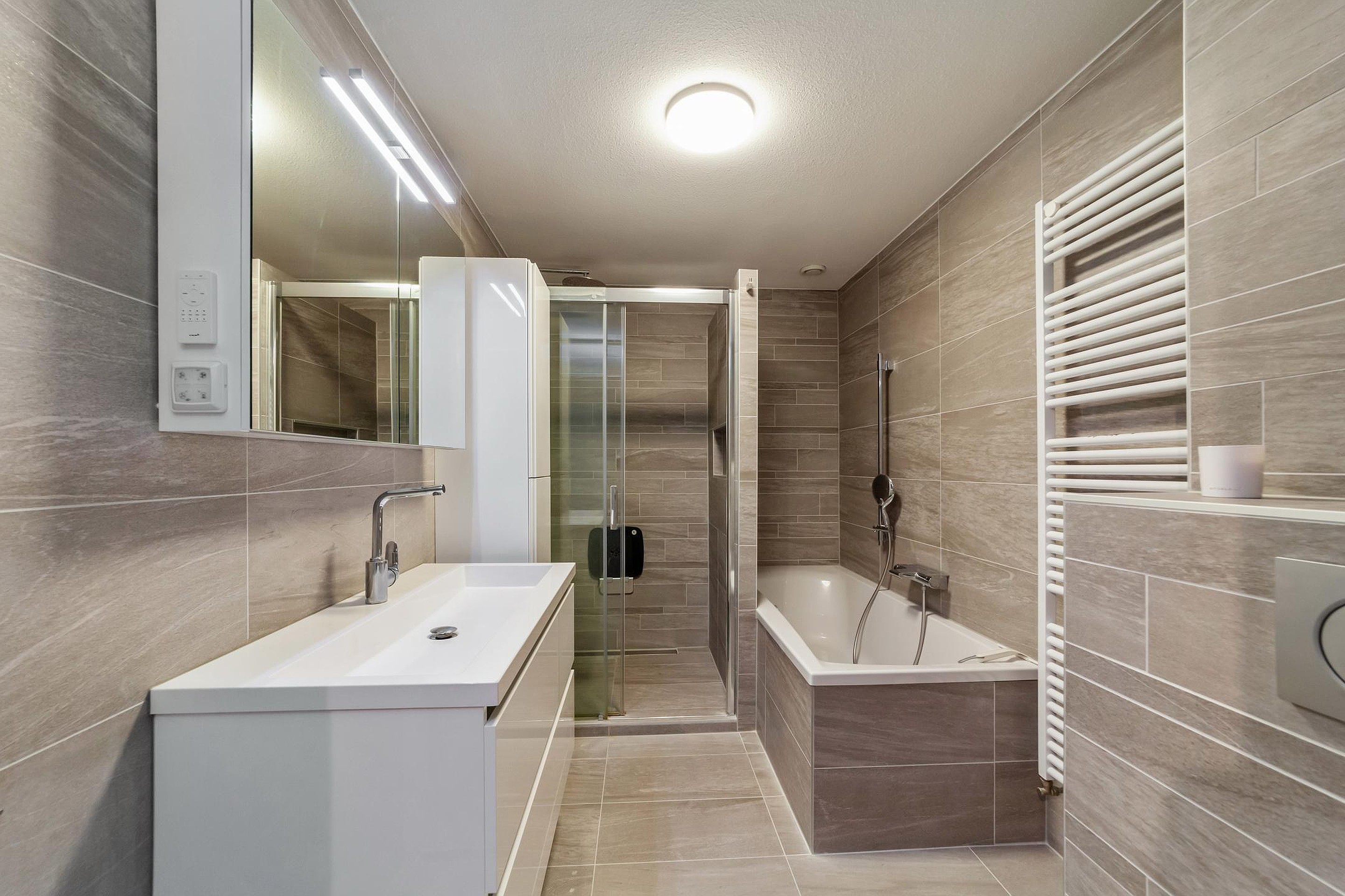 The modern bathroom is fully equipped with a bathtub, walk-in (rain) shower, wall-hung (second) toilet, and vanity with a mirrored cabinet.