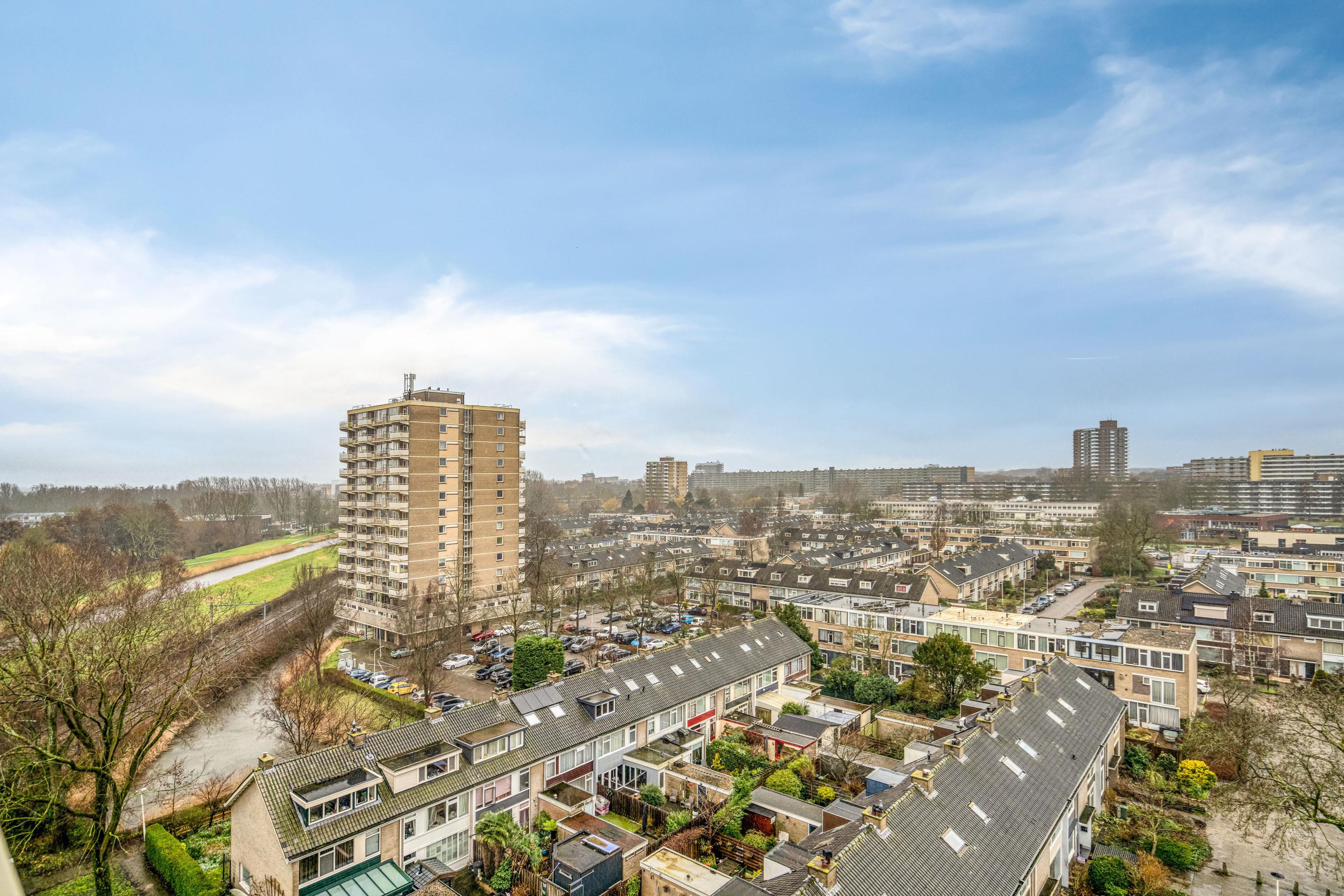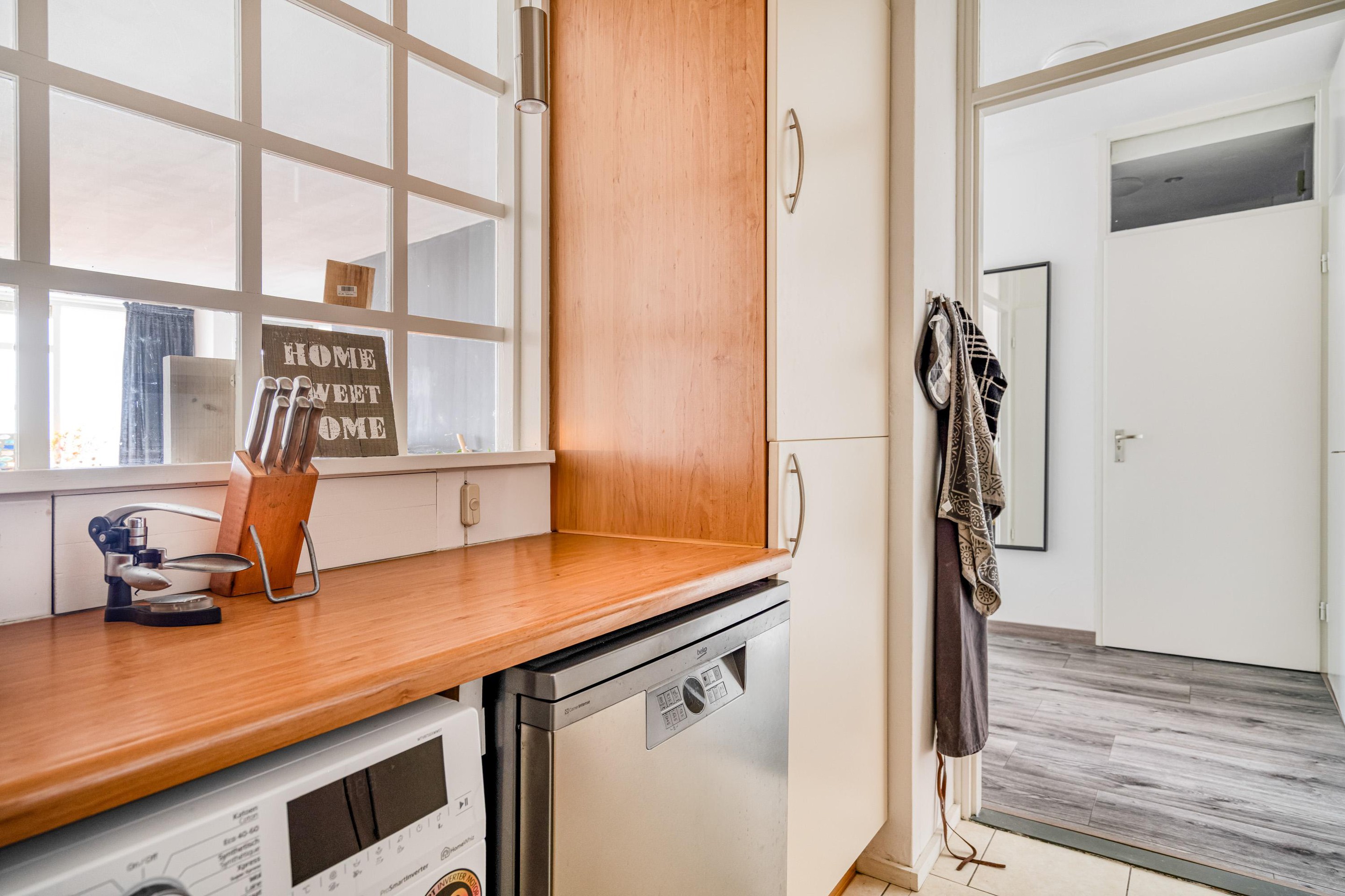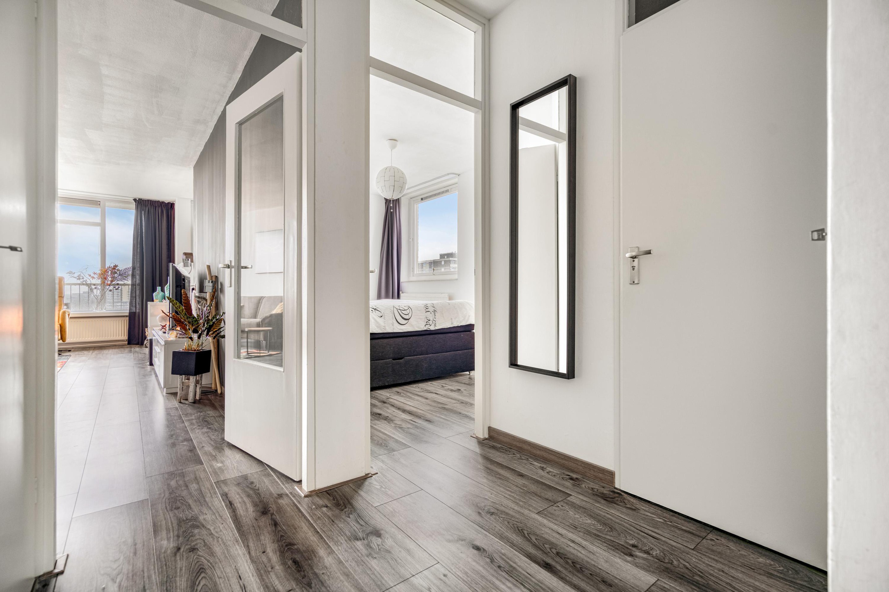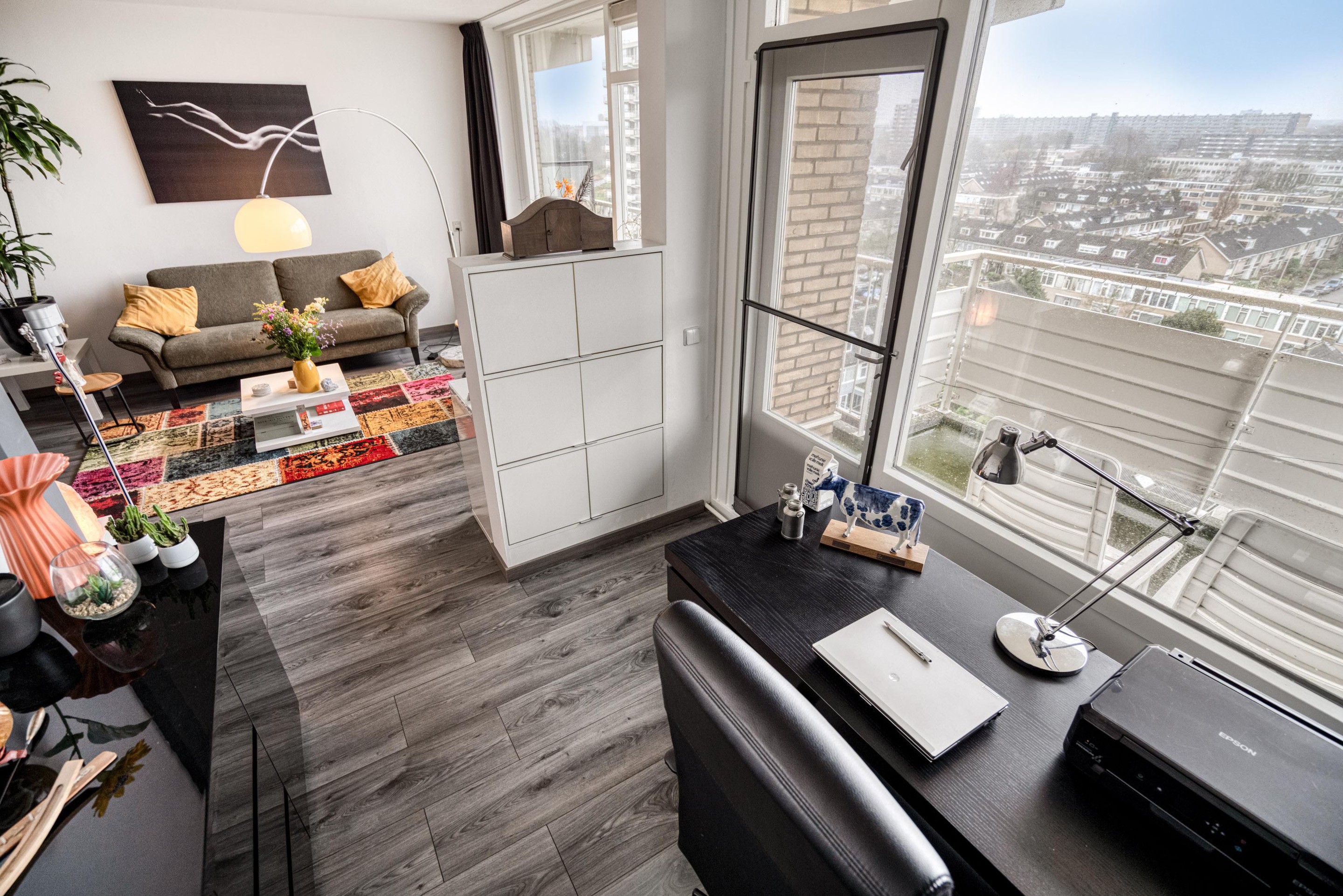 Entreehal met bergkast, meterkast en intercom. De royale L-vormige woonkamer biedt, net als het balkon, vrij uitzicht over Zoetermeer. De semi-open keuken heeft een parallelopstelling en is uitgerust met een kookplaat, oven, magnetron, koel-/vriescombinatie en een vaatwasser.