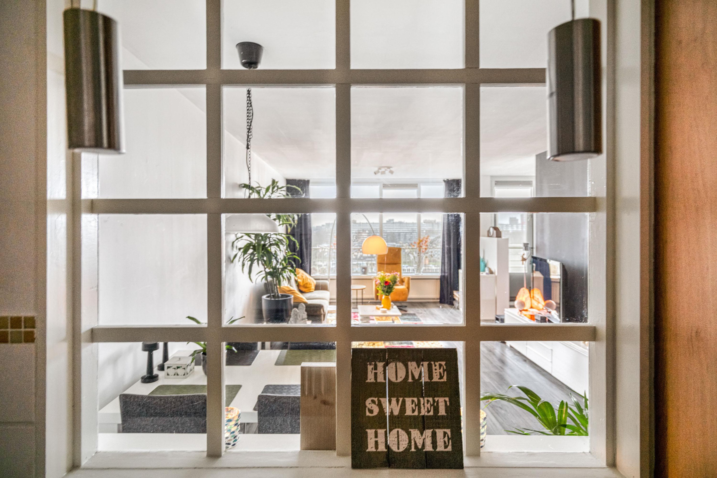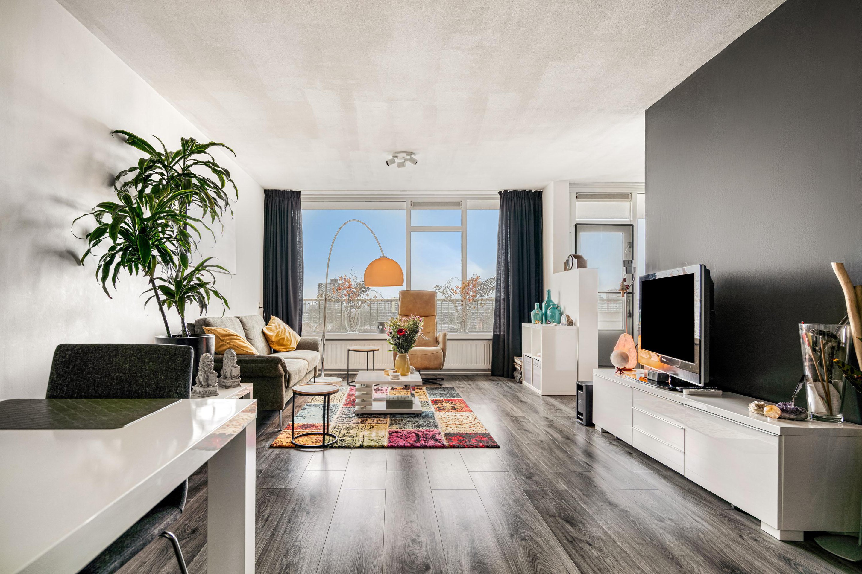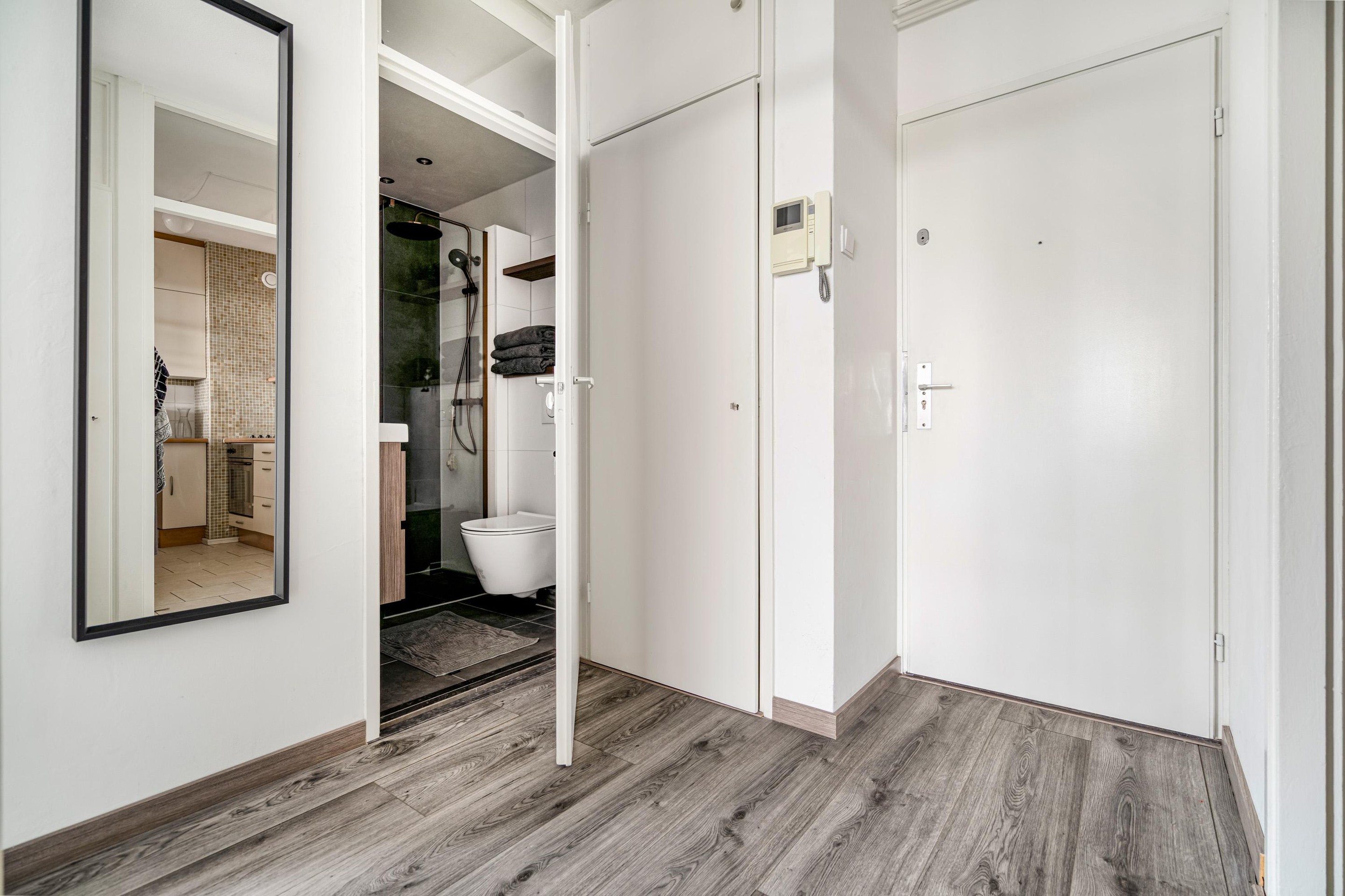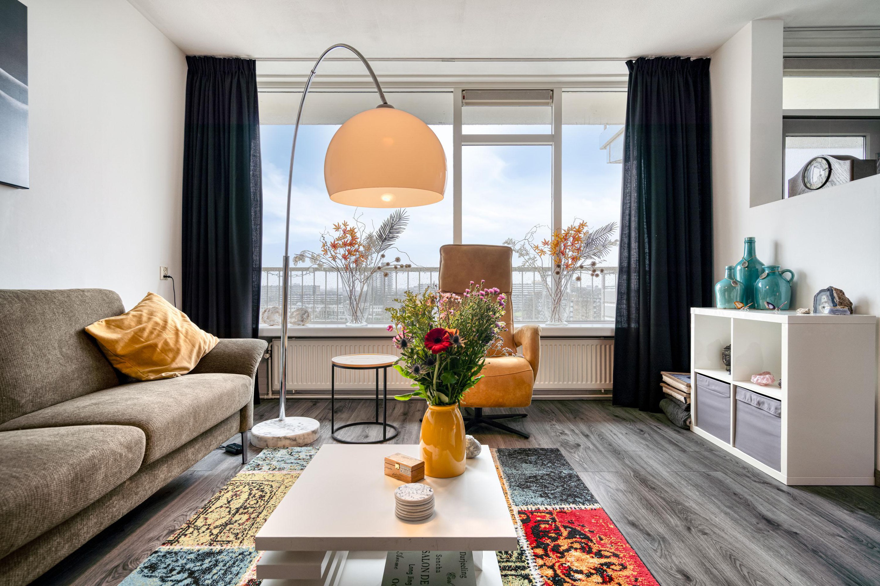 Entreehal met bergkast, meterkast en intercom. De royale L-vormige woonkamer biedt, net als het balkon, vrij uitzicht over Zoetermeer. De semi-open keuken heeft een parallelopstelling en is uitgerust met een kookplaat, oven, magnetron, koel-/vriescombinatie en een vaatwasser.