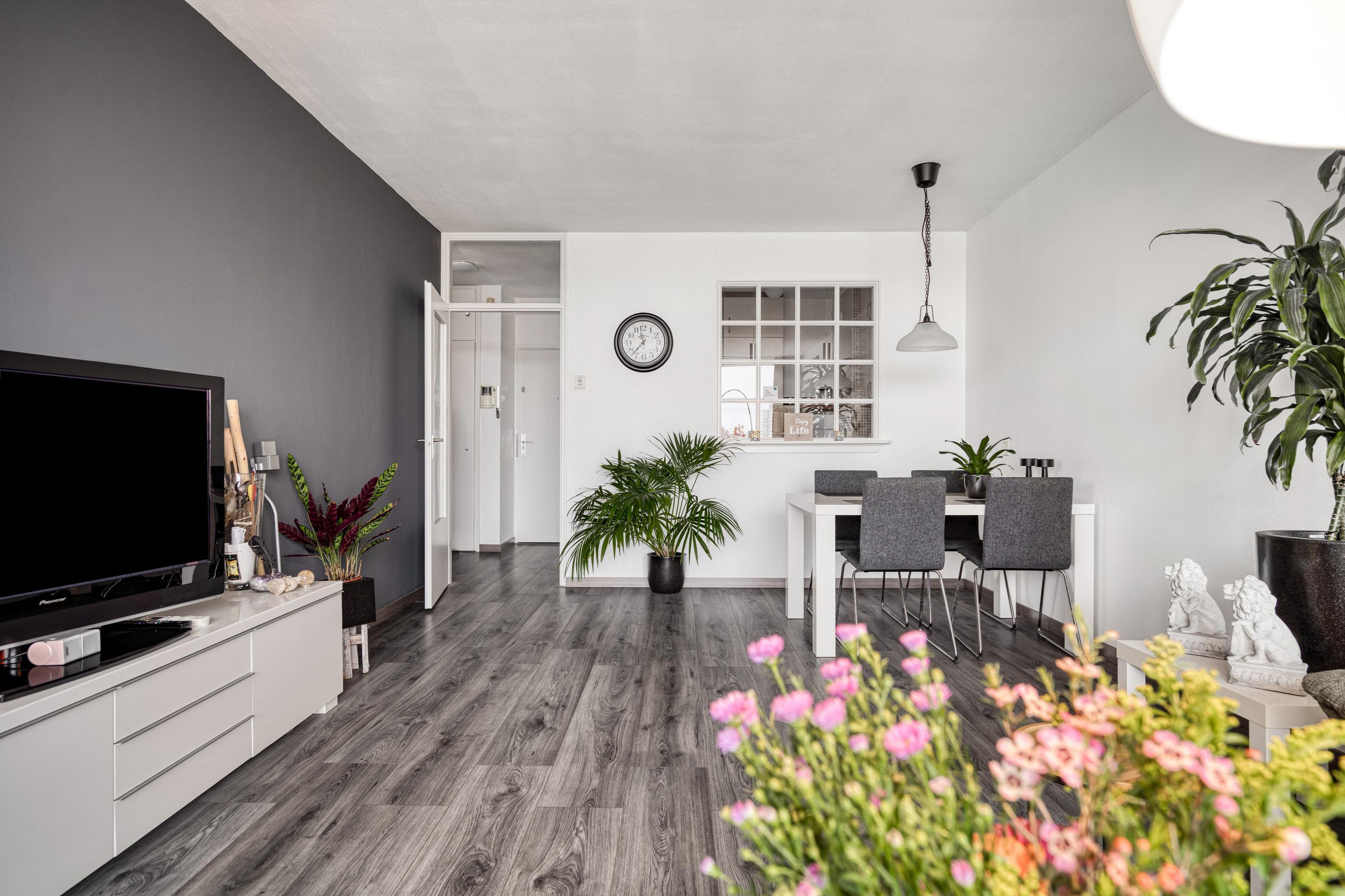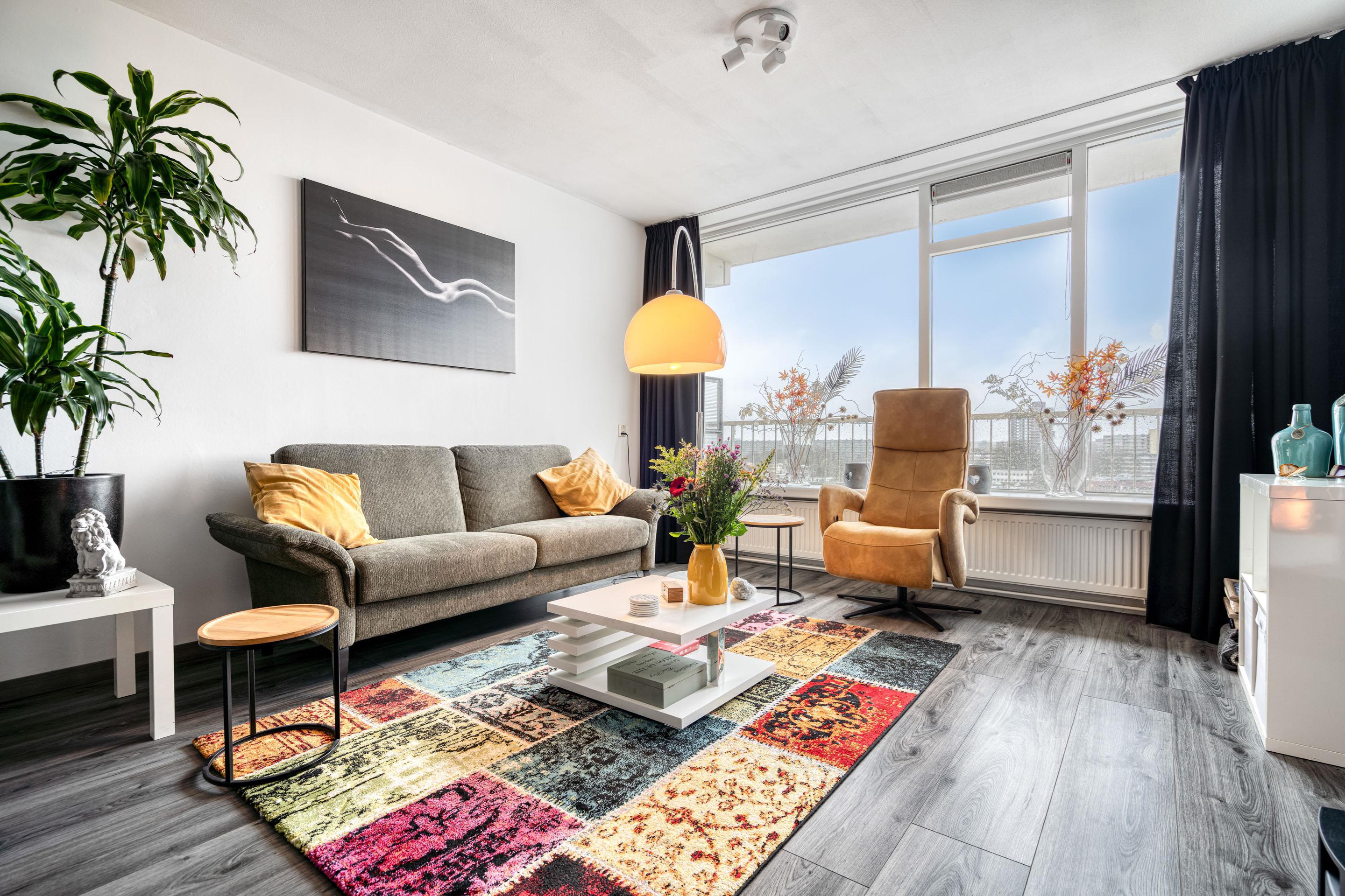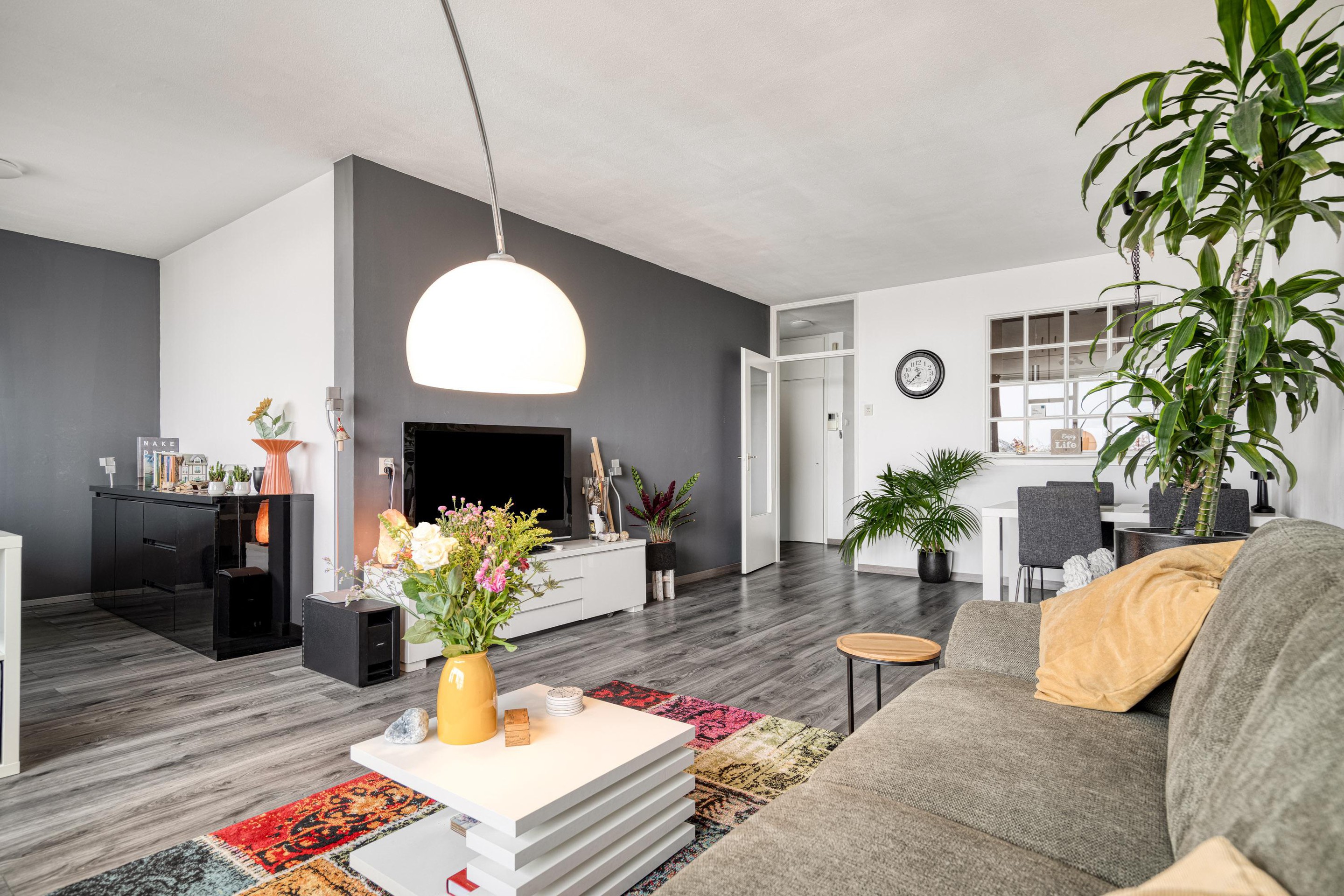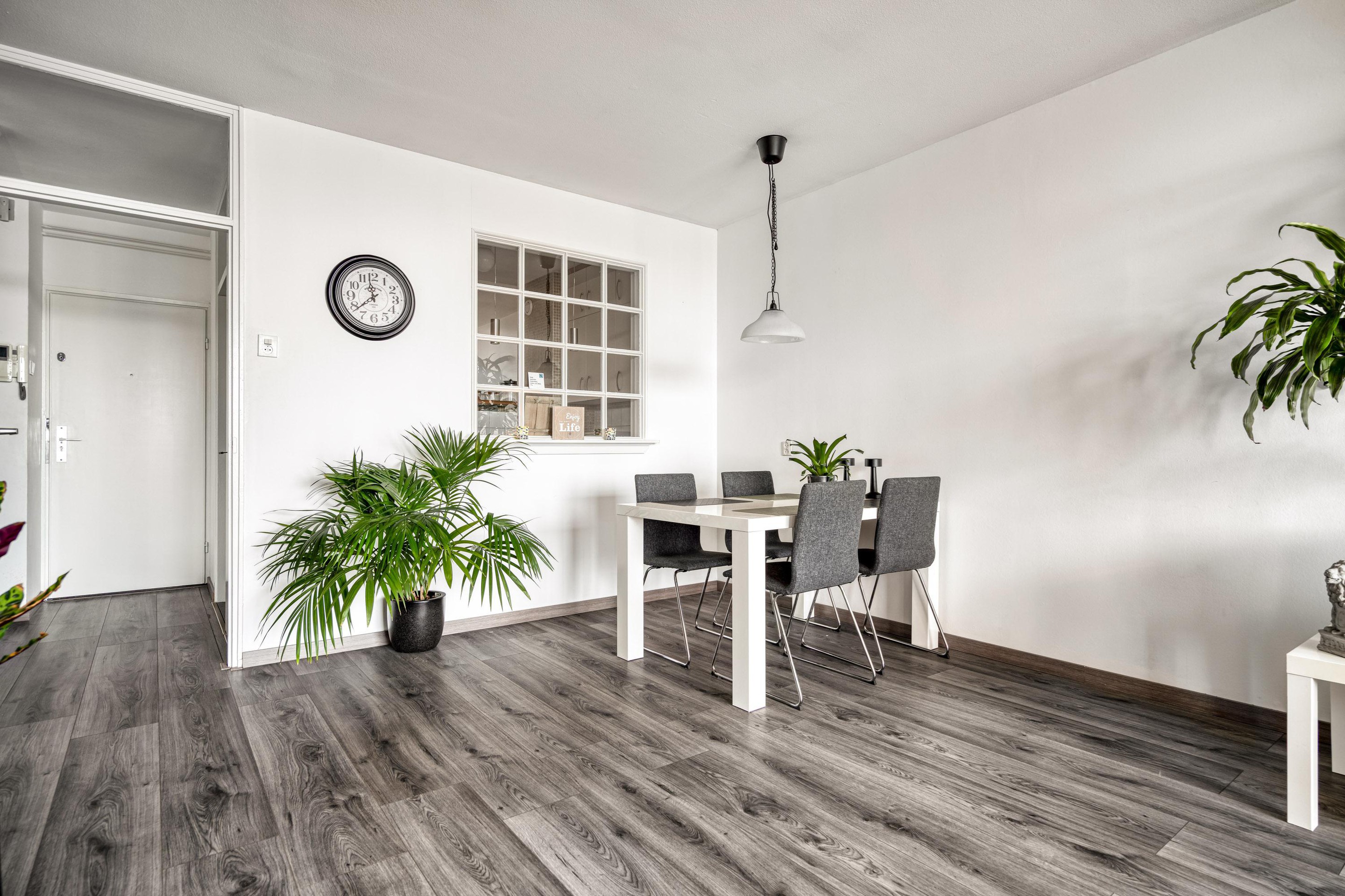 Entreehal met bergkast, meterkast en intercom. De royale L-vormige woonkamer biedt, net als het balkon, vrij uitzicht over Zoetermeer. De semi-open keuken heeft een parallelopstelling en is uitgerust met een kookplaat, oven, magnetron, koel-/vriescombinatie en een vaatwasser.