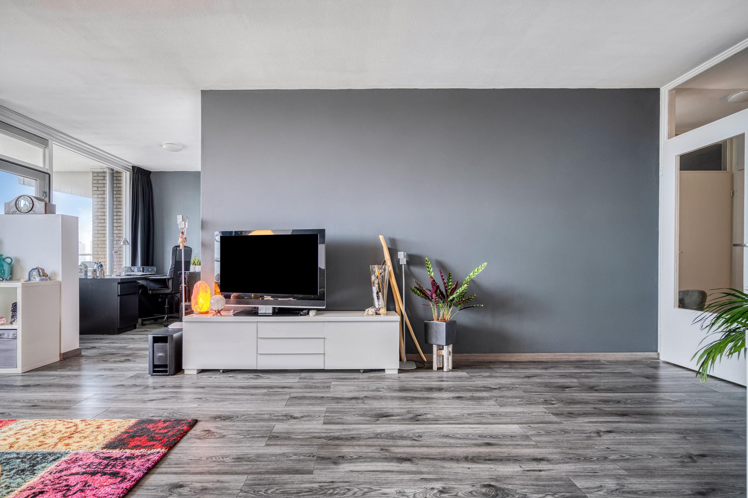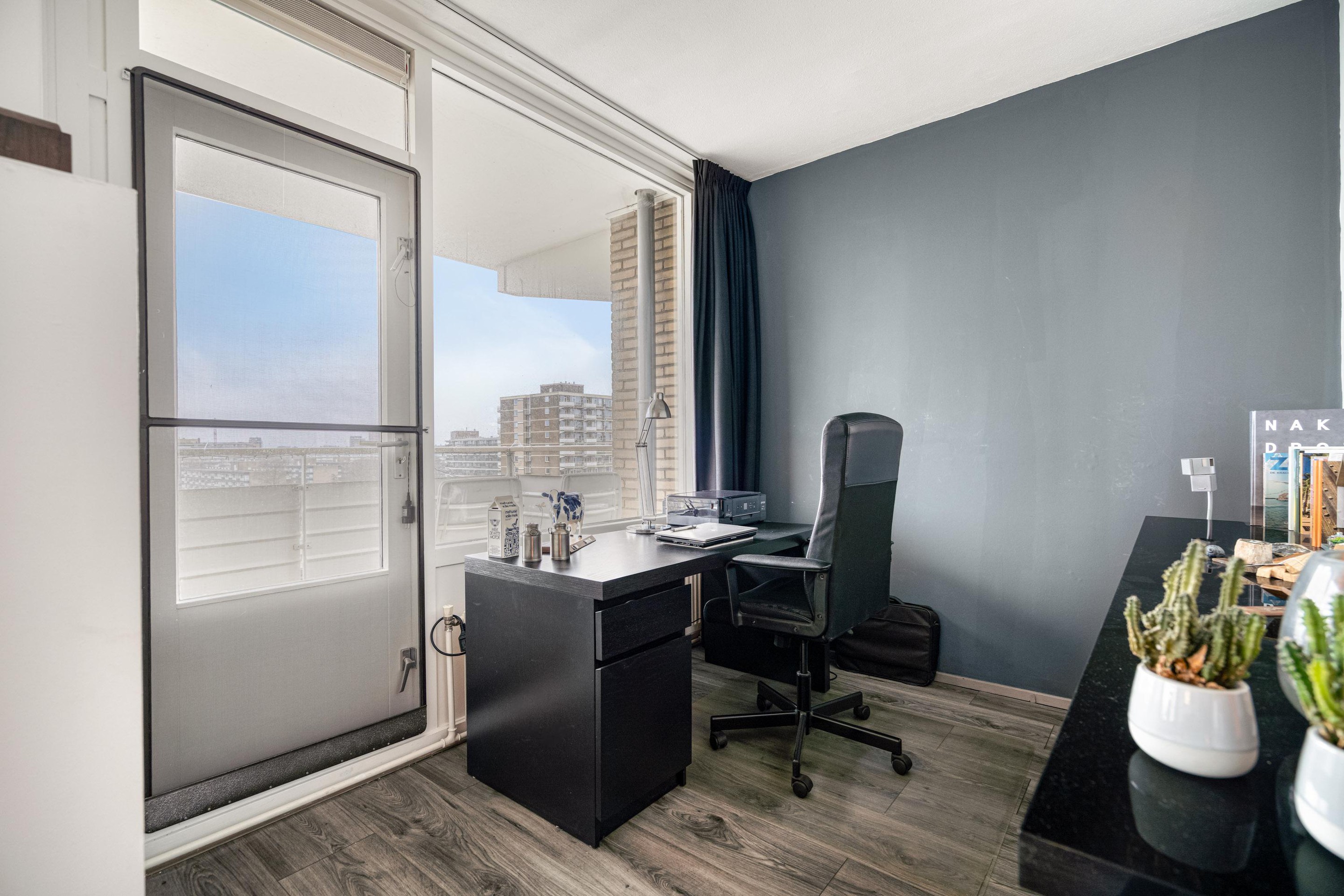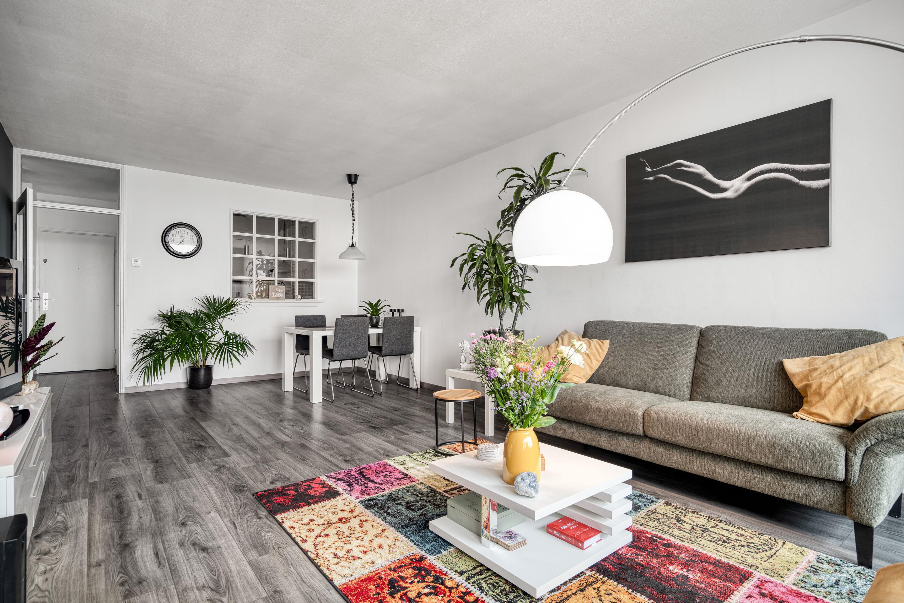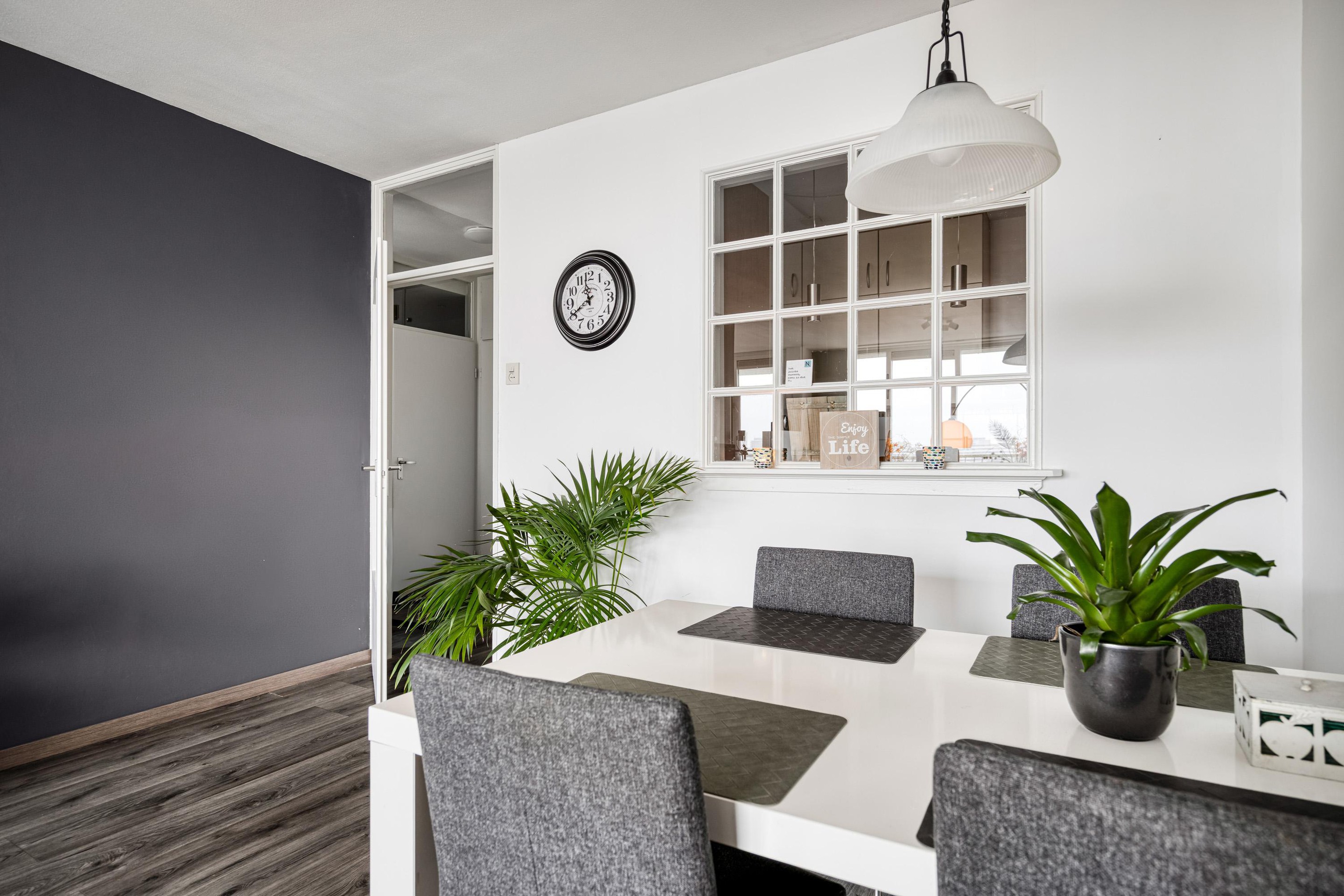 Entreehal met bergkast, meterkast en intercom. De royale L-vormige woonkamer biedt, net als het balkon, vrij uitzicht over Zoetermeer. De semi-open keuken heeft een parallelopstelling en is uitgerust met een kookplaat, oven, magnetron, koel-/vriescombinatie en een vaatwasser.