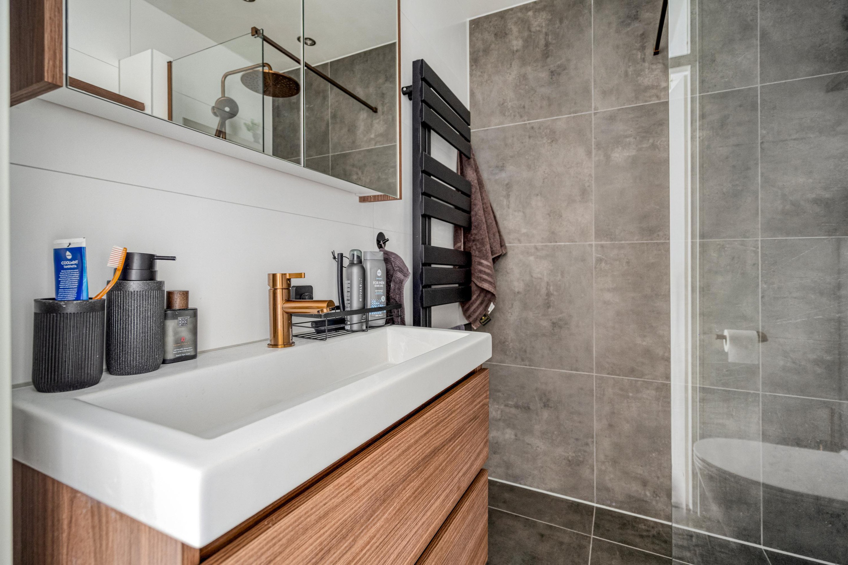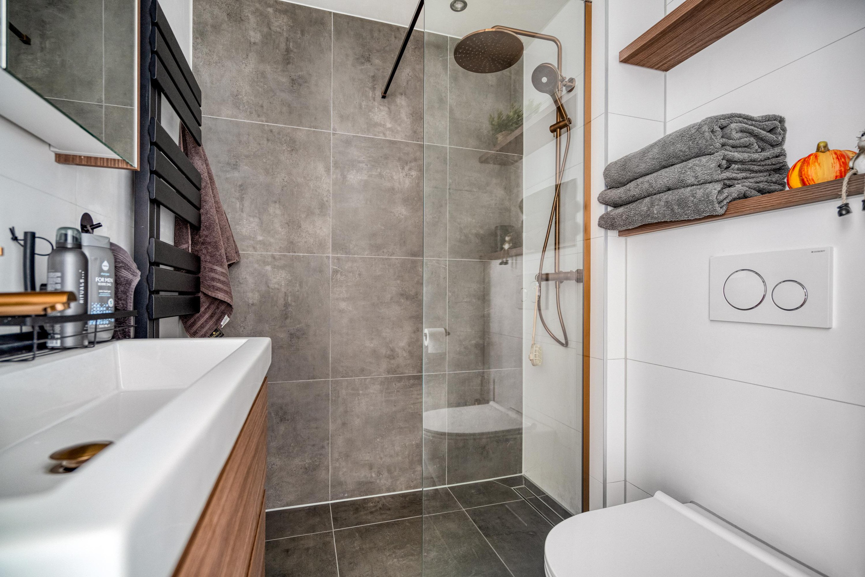 De luxe badkamer (2025) welke volledig is betegeld is voorzien van een wastafel, inloopdouche met drain en stortdouche, designradiator, hangend toilet en heeft een verlaagd plafond met inbouwspots.