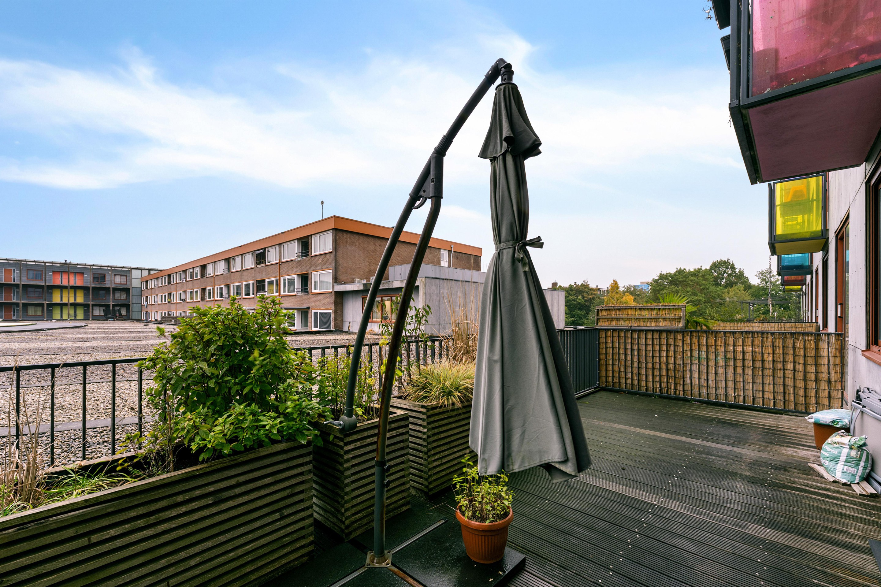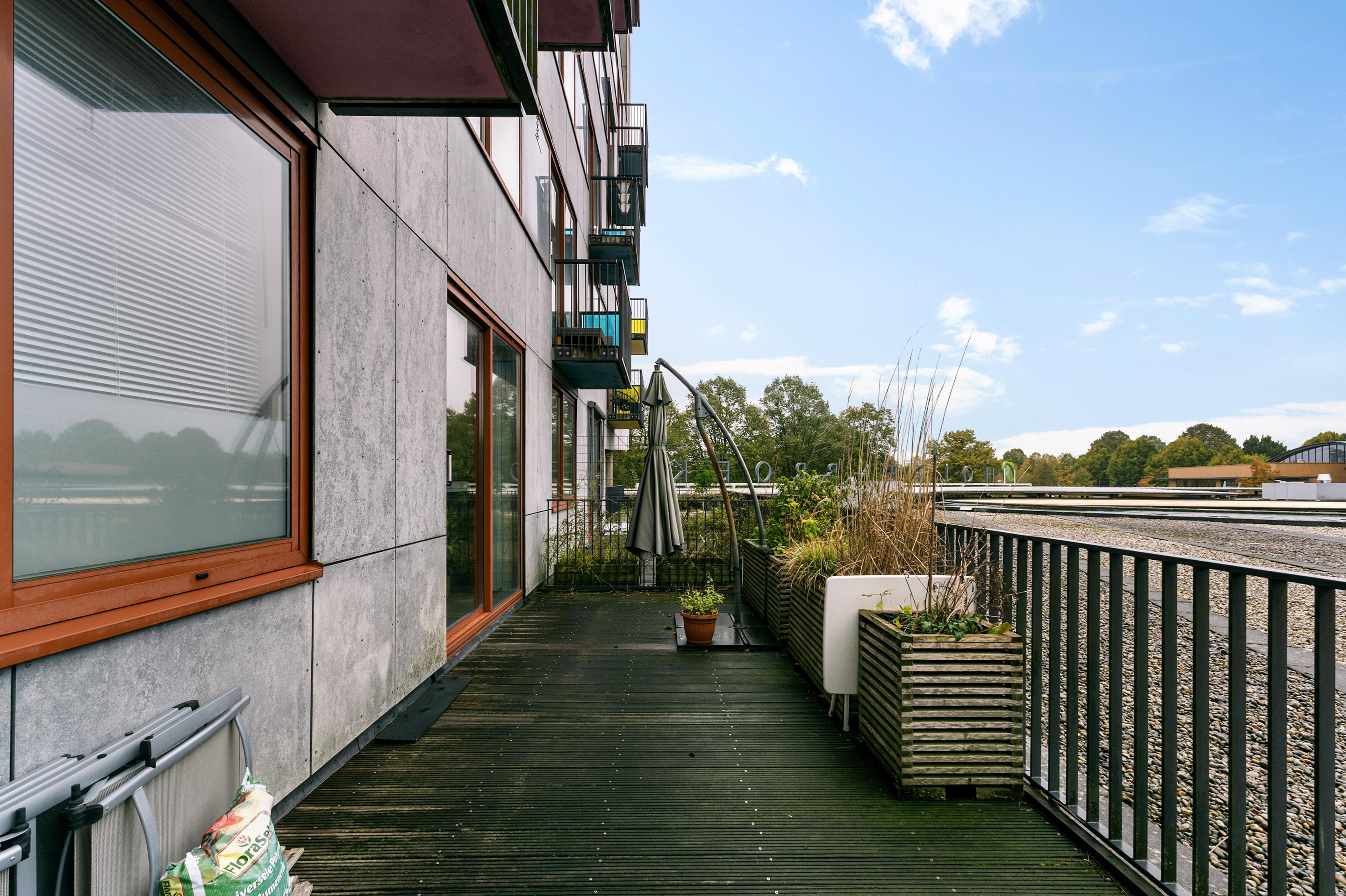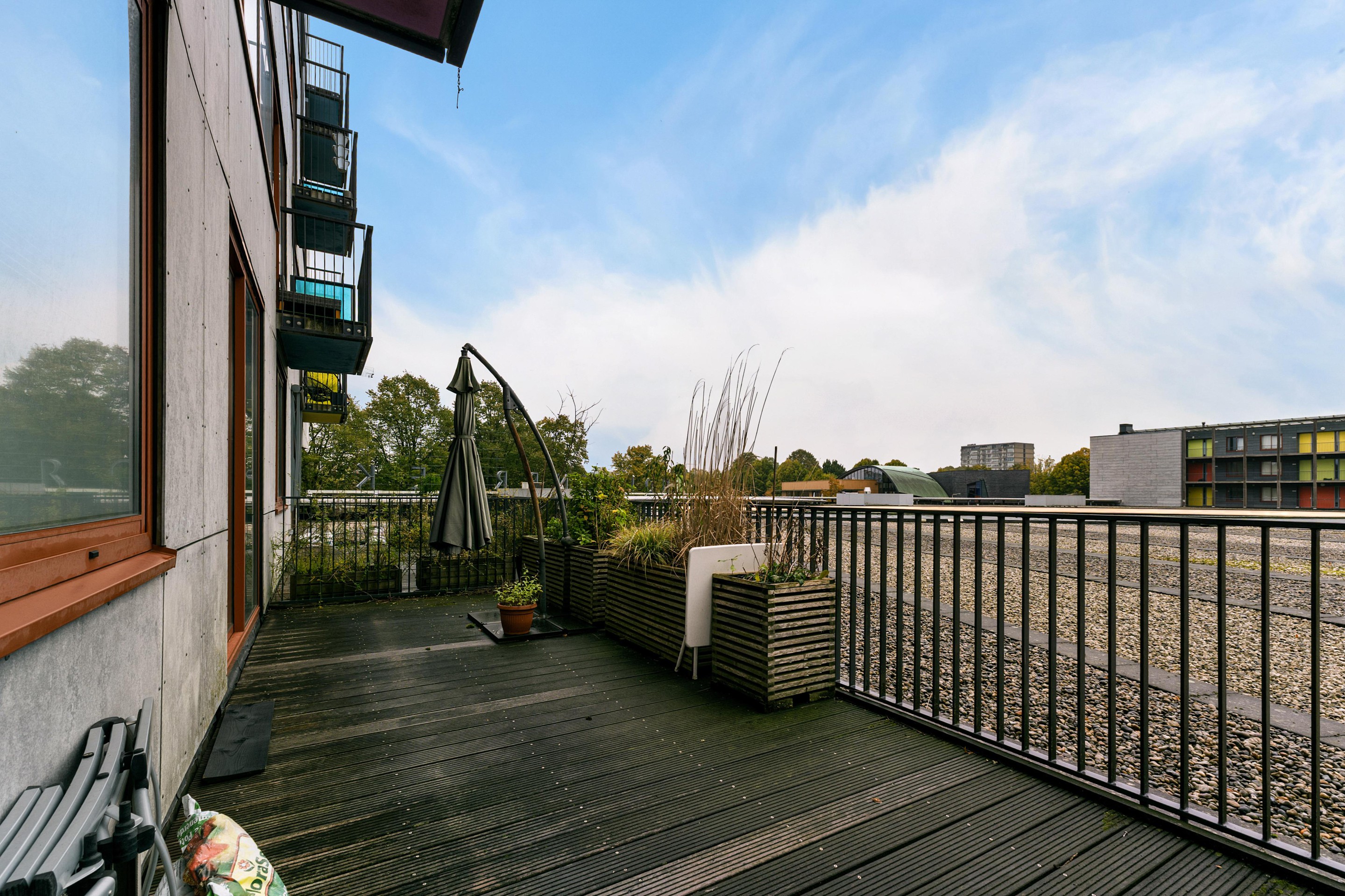Zodra je de woonkamer instapt, valt het oog direct op de schuifpui naar het brede dakterras. Met een perfecte ligging op het zuidwesten is dit dé plek om te ontspannen in de zon, te borrelen met vrienden of gewoon even tot rust te komen. De buitenruimte strekt zich uit over de volledige breedte van het appartement, waardoor binnen en buiten naadloos in elkaar overlopen.
