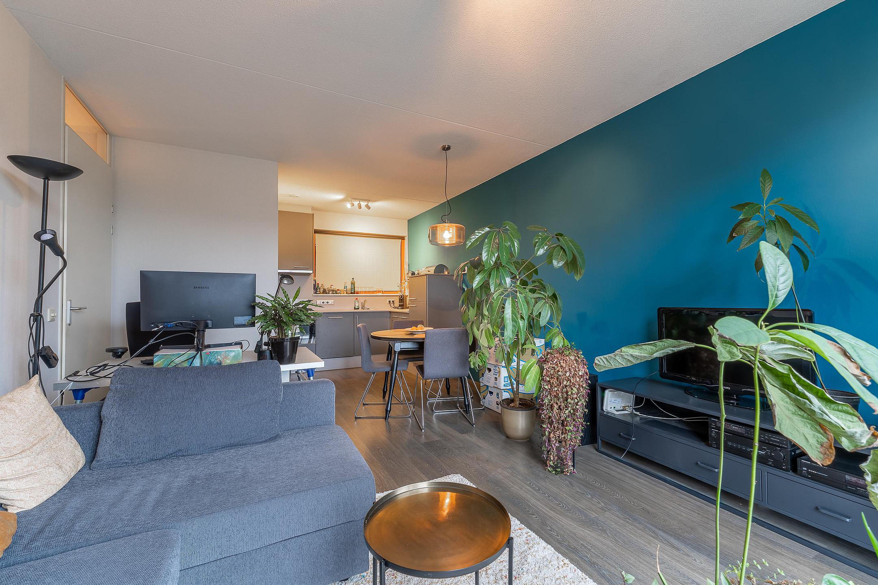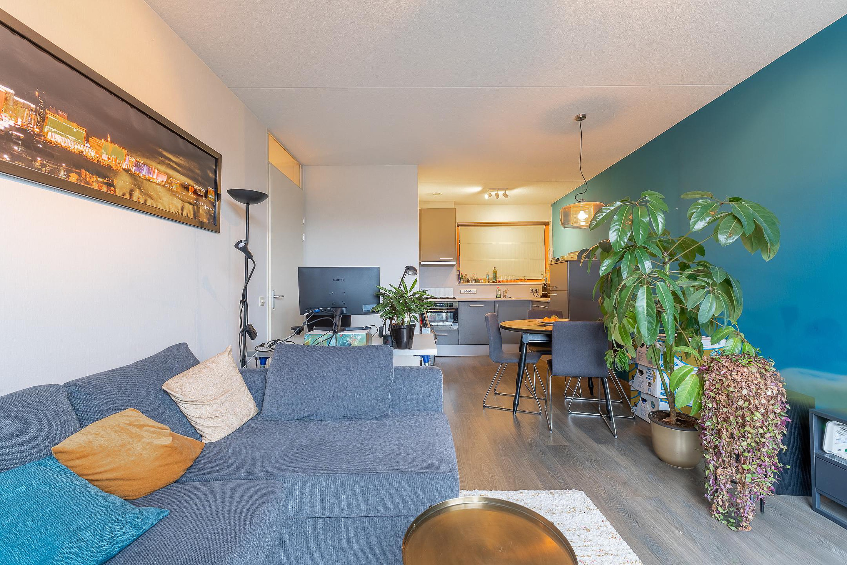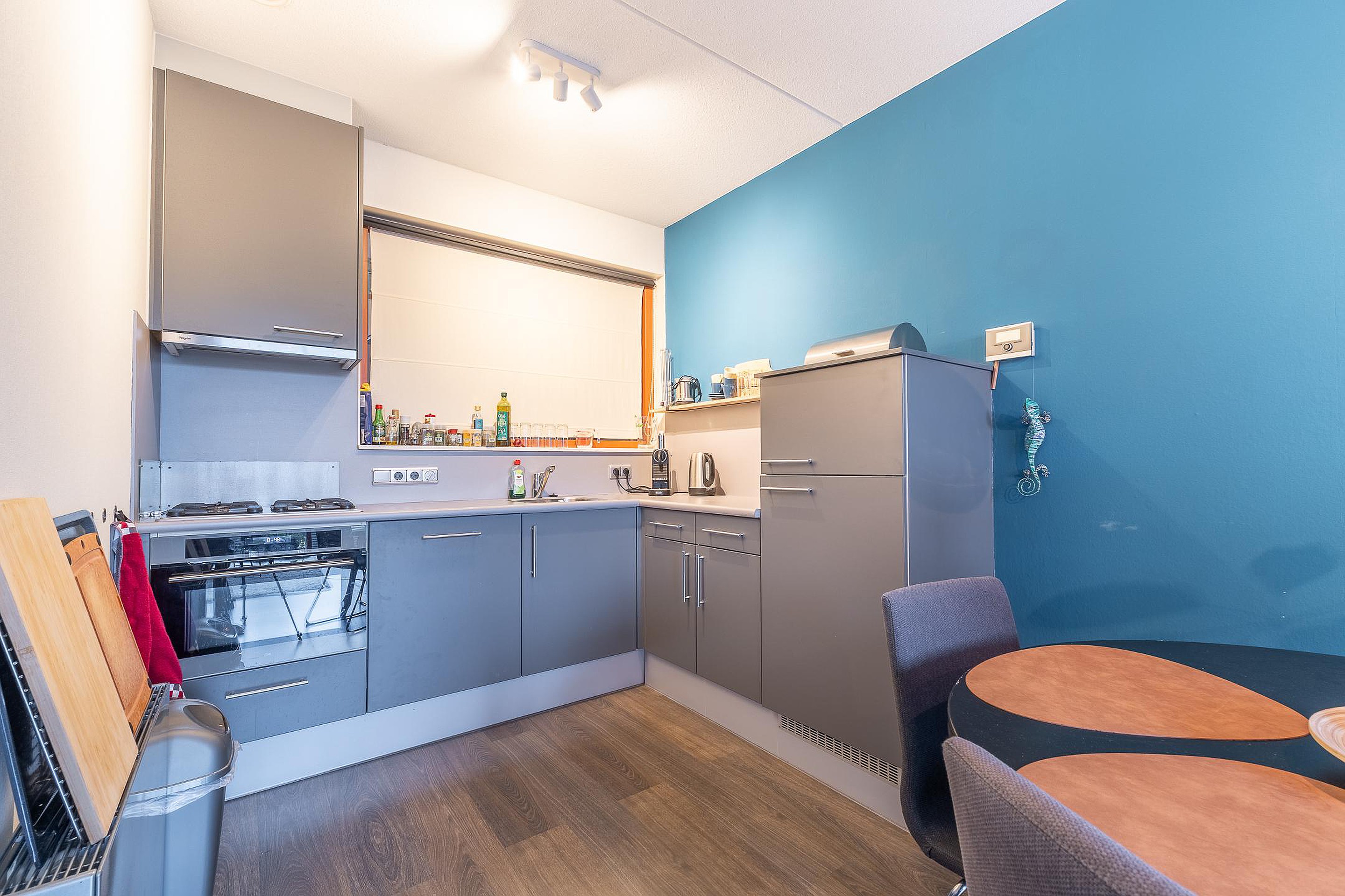 Via de centrale entree met lift en trappenhuis bereik je het appartement. De hal biedt toegang tot het toilet, de badkamer en de leefruimtes. De lichte woonkamer heeft een frisse uitstraling en een open keuken in hoekopstelling, compleet met gaskookplaat, koel-vriescombinatie, vaatwasser en een recente combimagnetron. De badkamer is stijlvol betegeld en voorzien van een douchecabine, wastafel, twee wandmeubels en een designradiator. De slaapkamer bevindt zich aan de terraszijde.
