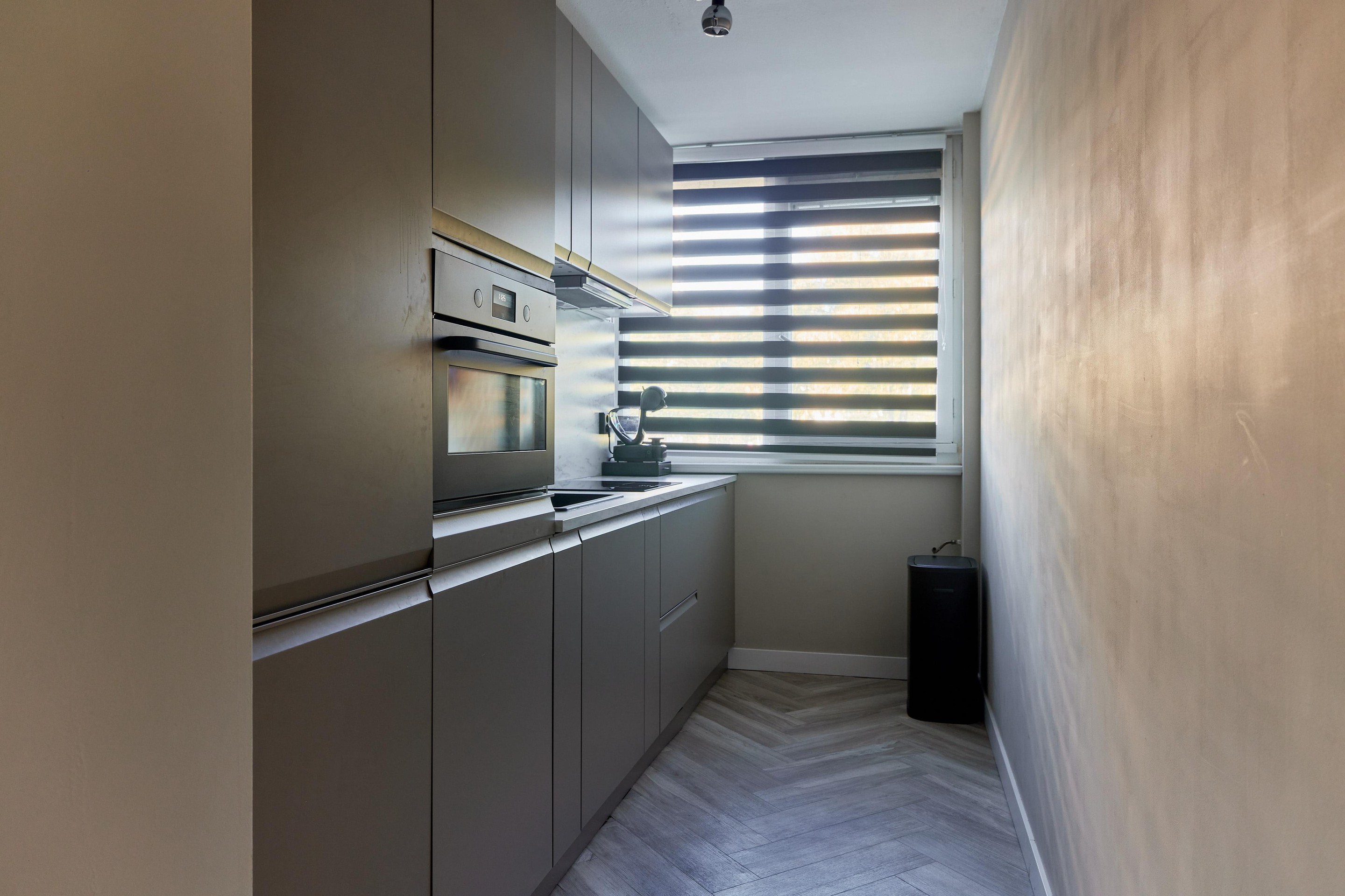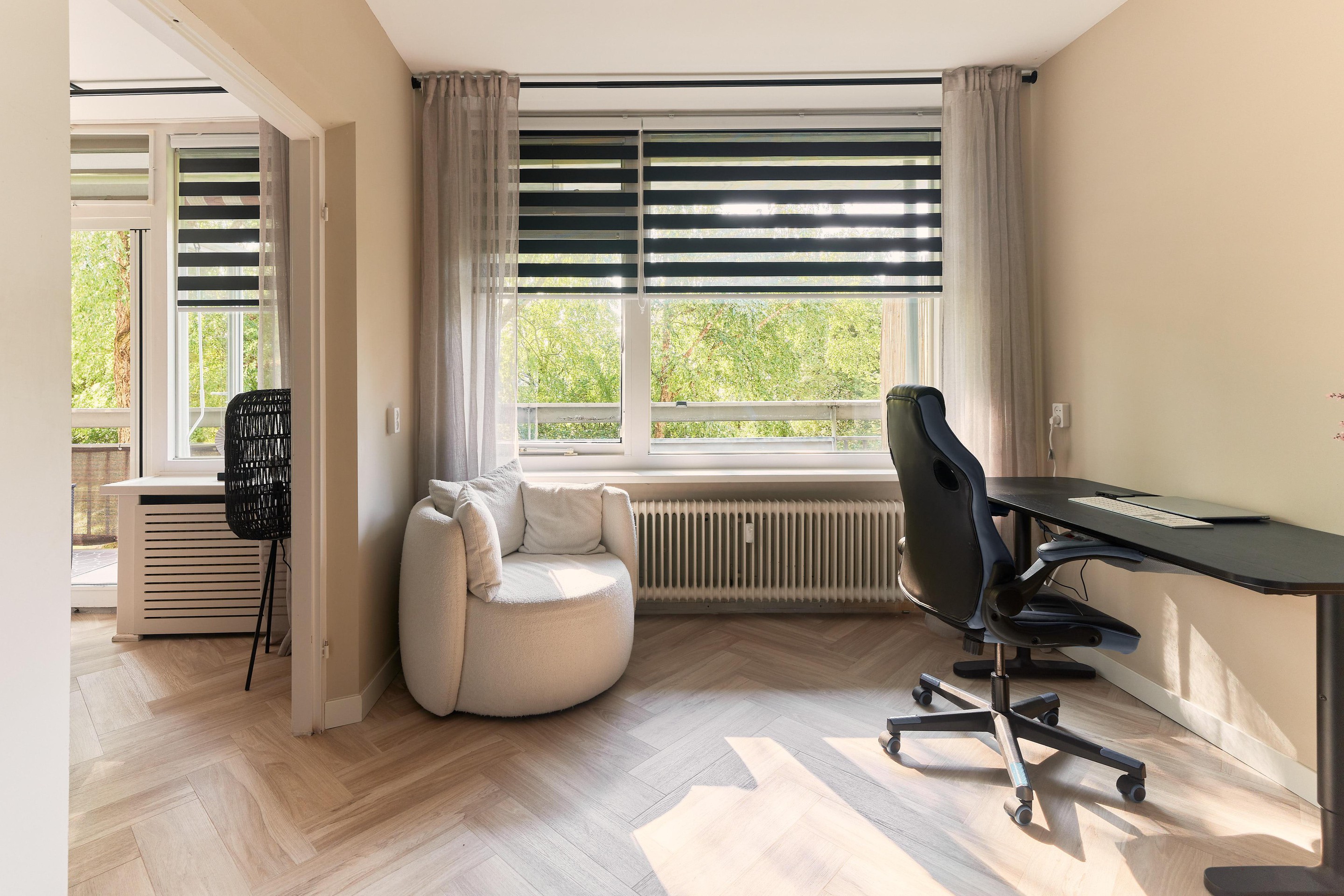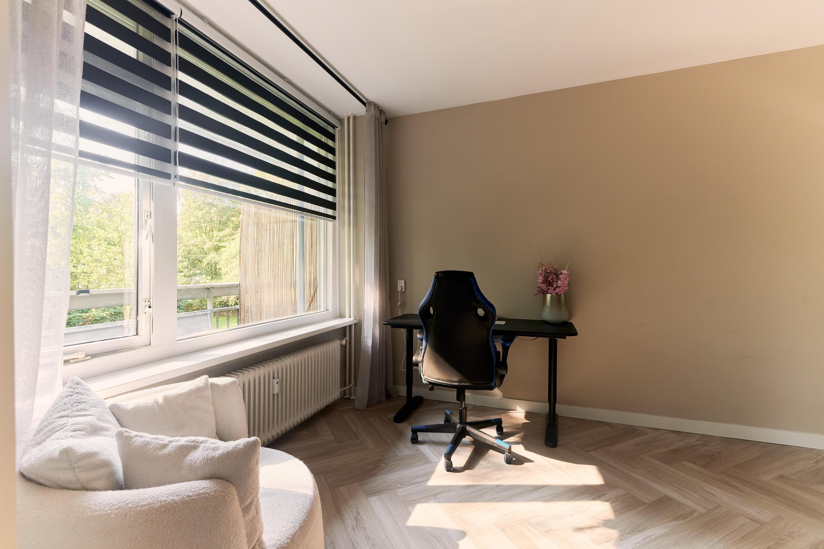 Begane grond Via de centrale entree op de begane grond, met intercom en brievenbussen, stap je het verzorgde complex binnen. Het appartement op de eerste verdieping bereik je eenvoudig met de trap of de lift – ideaal voor wie gemak en toegankelijkheid belangrijk vindt. Achter de voordeur wacht een verrassend licht en goed onderhouden appartement, waar de strakke afwerking en de warme sfeer je meteen zullen aanspreken. De ruime hal biedt plaats aan je garderobe en geeft toegang tot alle vertrekken. De woonkamer is heerlijk licht dankzij de grote raampartijen en het vrije uitzicht. De moderne PVC-vloer loopt door het hele appartement en alle gordijnen, rolgordijnen en rails blijven achter. Vanuit de woonkamer stap je bovendien zo het balkon op, gelegen op het zonnige zuiden – een fijne plek om in alle rust te genieten van de middag- en avondzon. Grenzend aan de woonkamer ligt een van de twee slaapkamers, momenteel ingericht als werkkamer maar ook zeer geschikt als eetkamer of hobbyruimte. De tweede slaapkamer ligt aan de andere zijde van de hal en is eveneens licht en netjes afgewerkt. De keuken is in 2024 volledig vernieuwd: strak vormgegeven in een rustige kleurstelling met een stijlvolle marmerlook achterwand en uitgerust met moderne inbouwapparatuur zoals een 4-pits inductiekookplaat, afzuigkap, combimagnetron, vaatwasser, koelkast en vriezer. De badkamer is modern betegeld en voorzien van een inloopdouche, wastafelmeubel en verwarmde spiegel. Het toilet bevindt zich apart, naast de badkamer. Een groot pluspunt is de aanwezigheid van twee bergingen: één direct naast de voordeur, met elektra en aansluitingen voor de wasmachine en droger – handig dat ze niet in de badkamer staan – en een tweede, ruime berging op de begane grond, ideaal voor fietsen en grotere spullen. De verwarming verloopt via blokverwarming. De maandelijkse bijdrage bedraagt in totaal € 269,90, bestaande uit € 164,90 aan servicekosten en een voorschot van € 105,- voor de stookkosten.