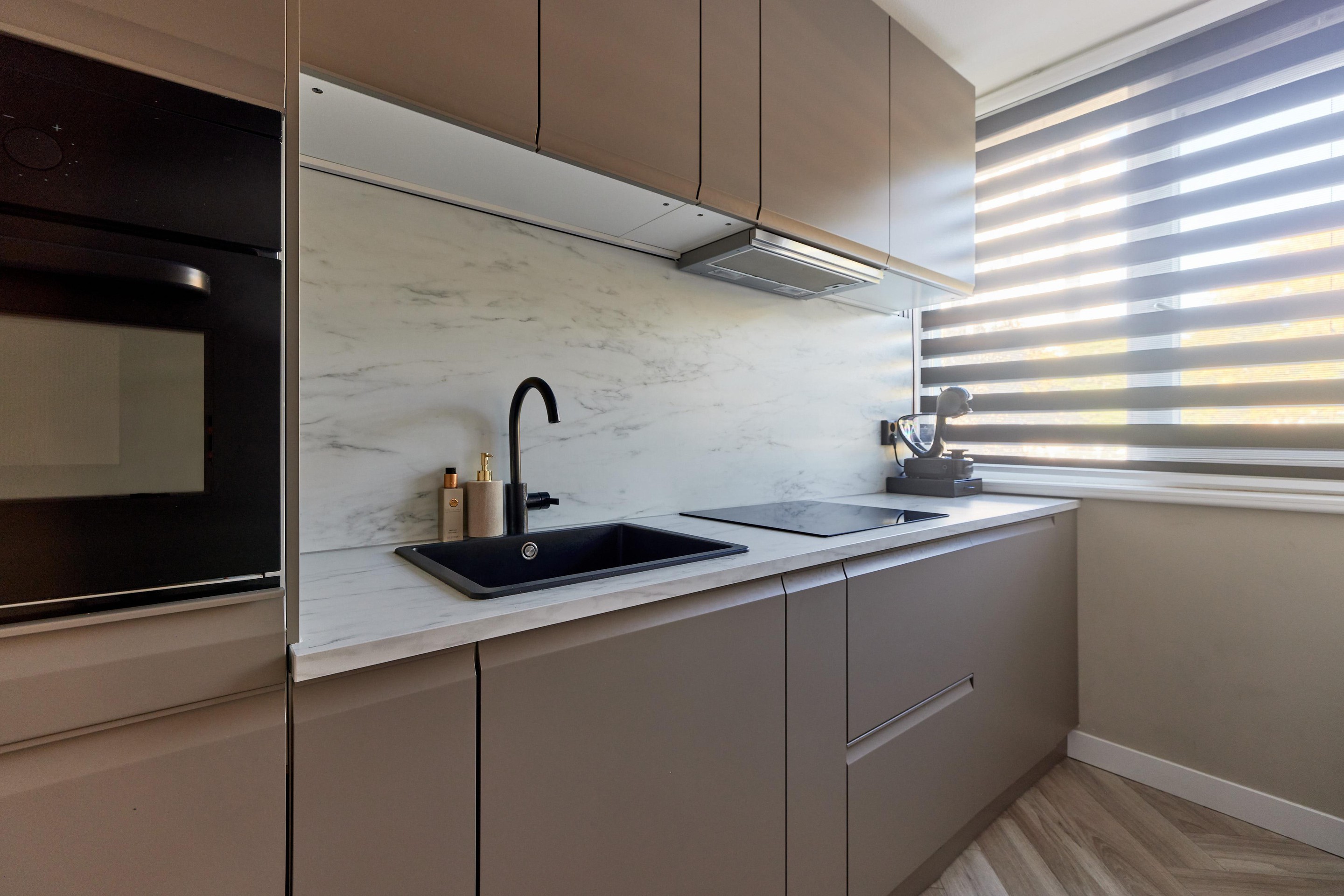 - PVC-vloer door het hele appartement, gordijnen, rolgordijnen en rails blijven achter