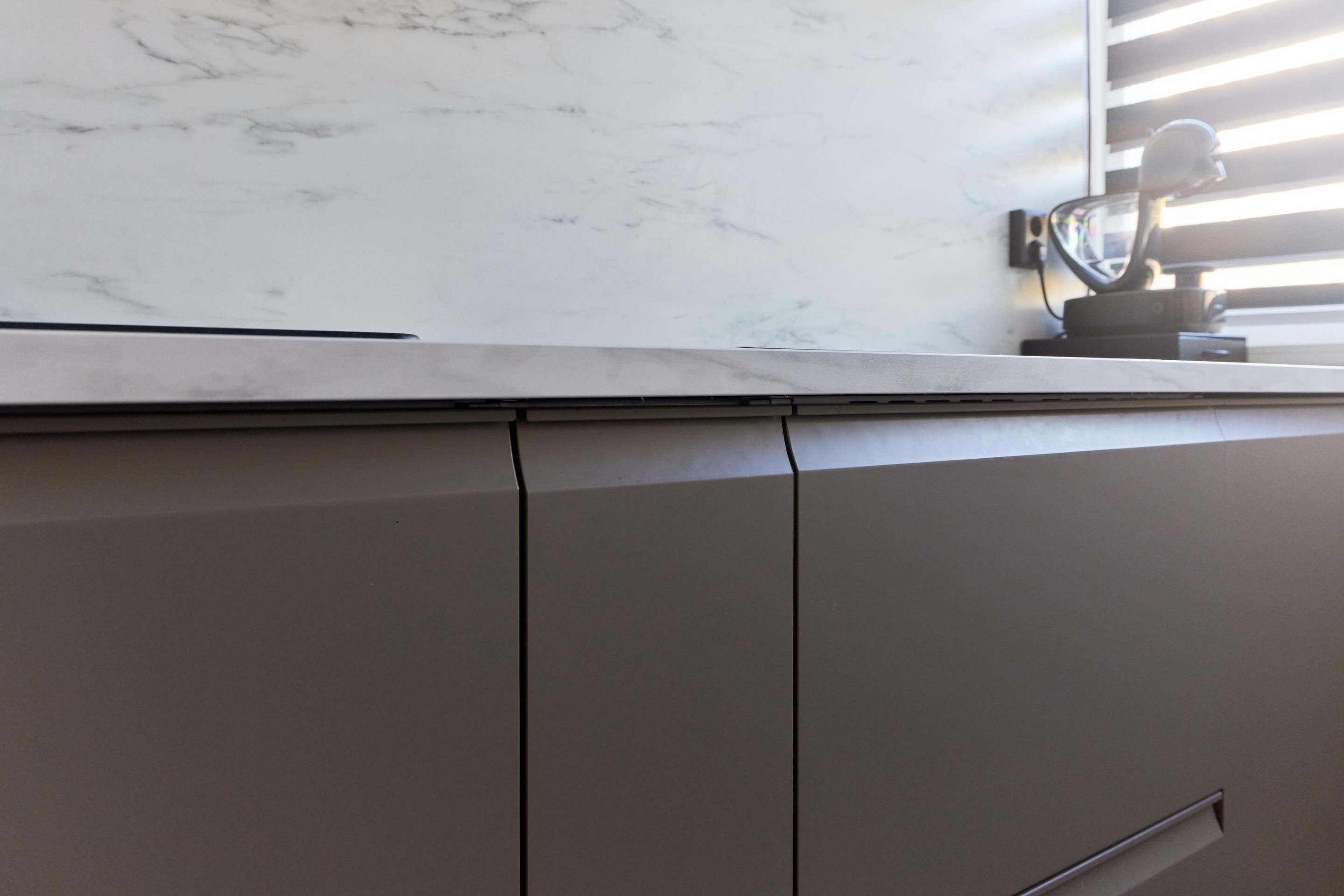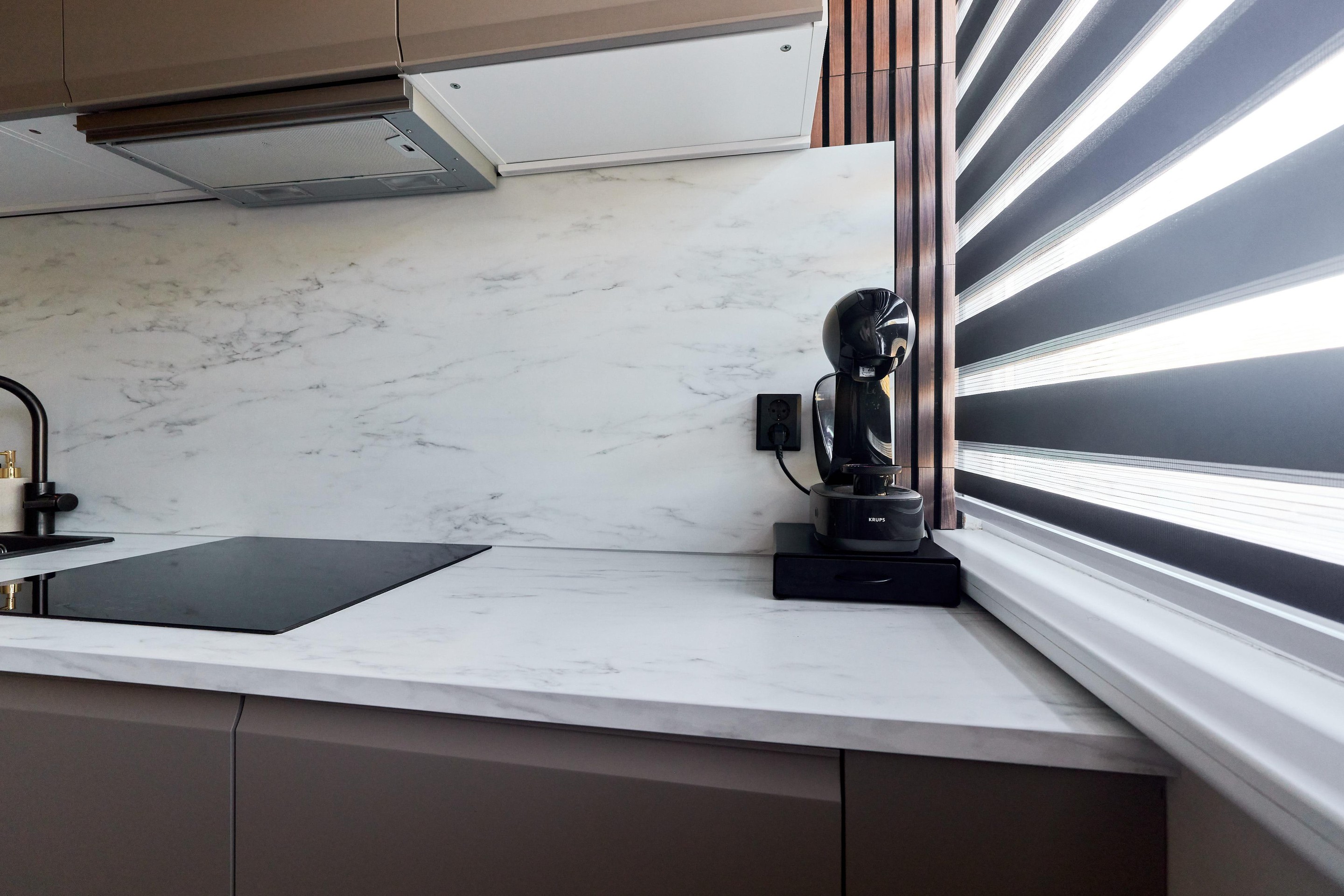 - De aansluiting voor de wasmachine is praktisch weggewerkt in de keuken, achter een kastje, waardoor het interieur strak en verzorgd oogt.