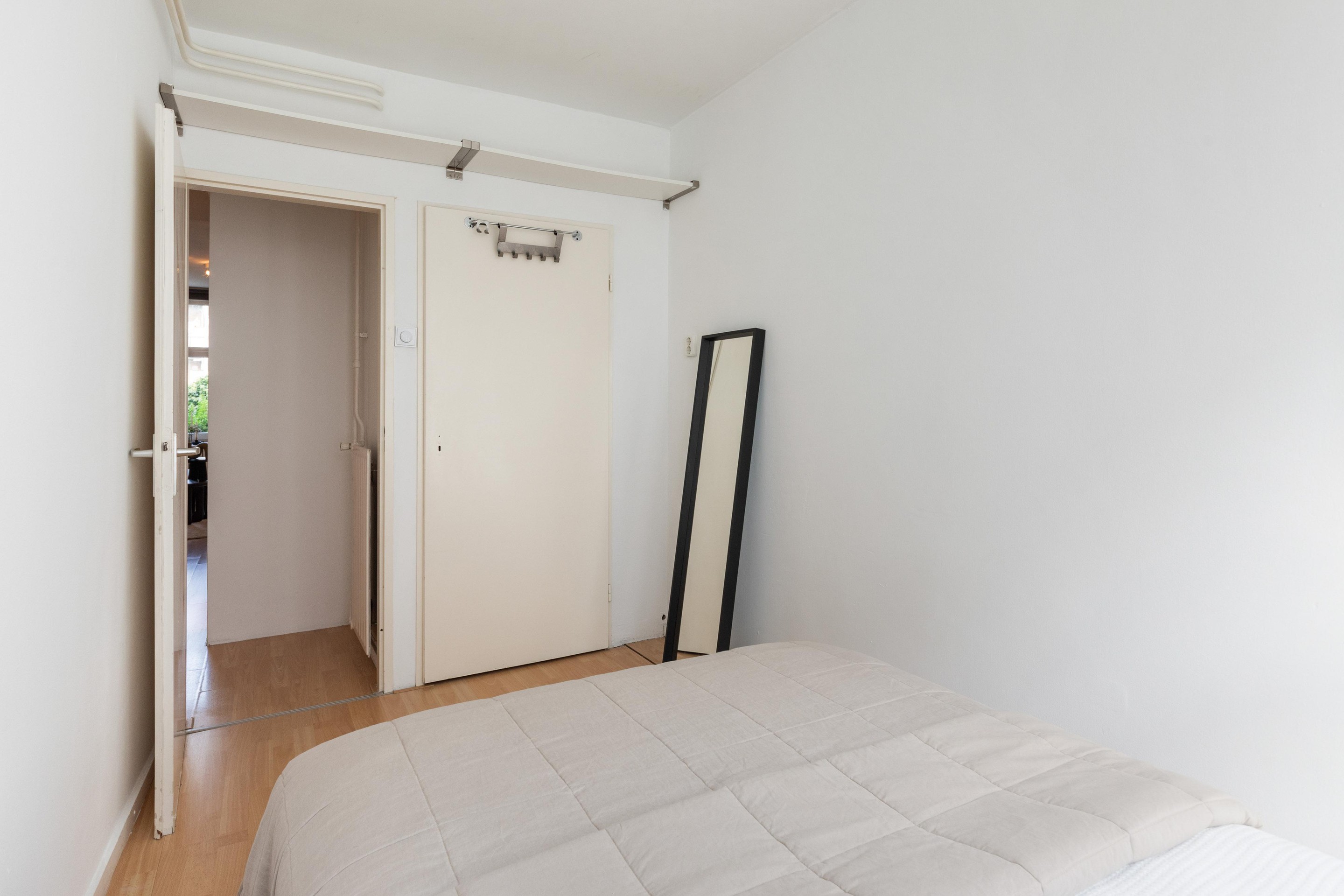 Aan de straatzijde bevindt zich de ruime slaapkamer, met een prettig uitzicht op de levendige Van Oldenbarneveldtstraat. Aan de achterzijde ligt de lichte woonkamer met zicht op de rustige binnentuin – een heerlijke plek om te ontspannen na een drukke dag.