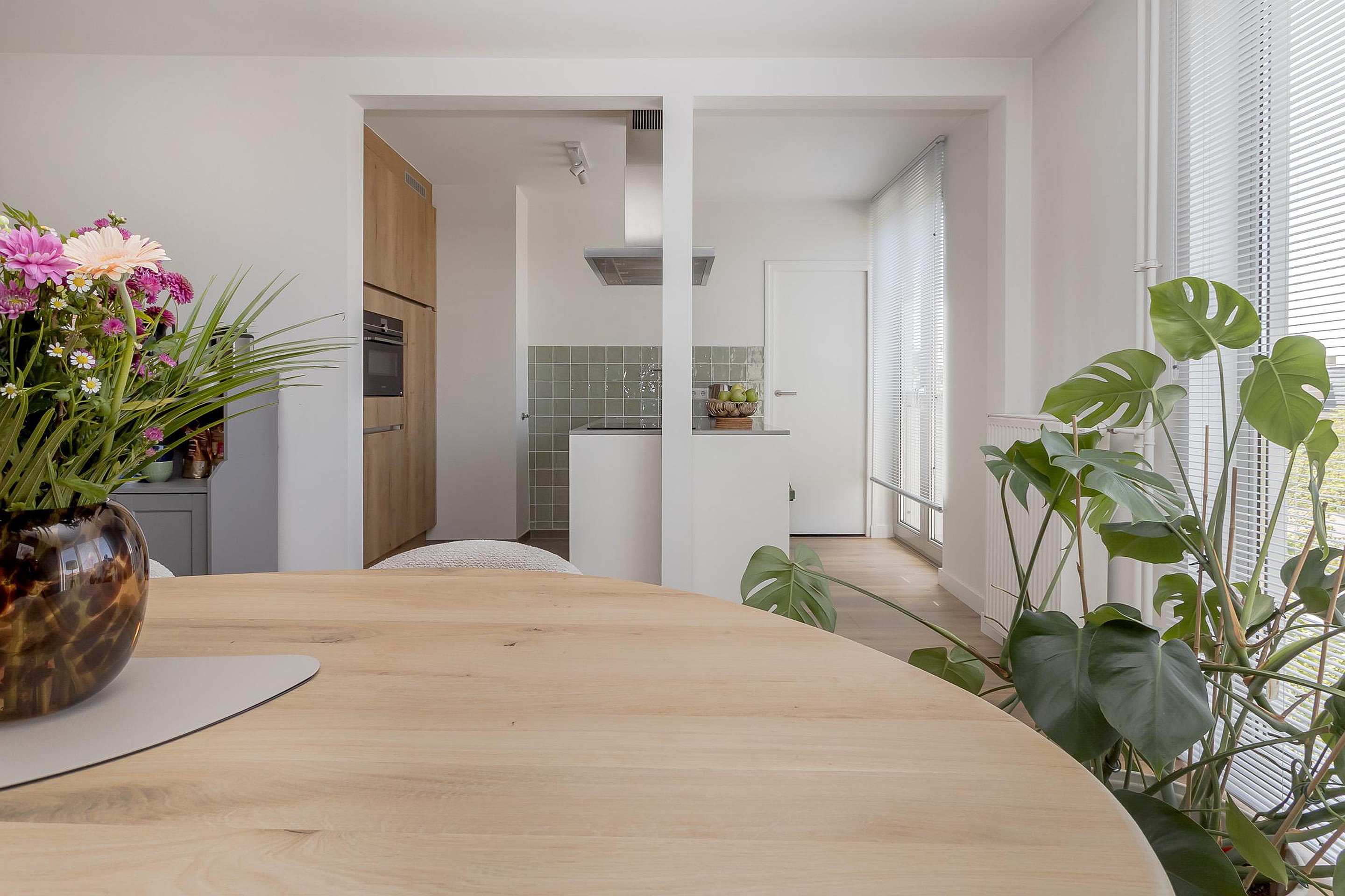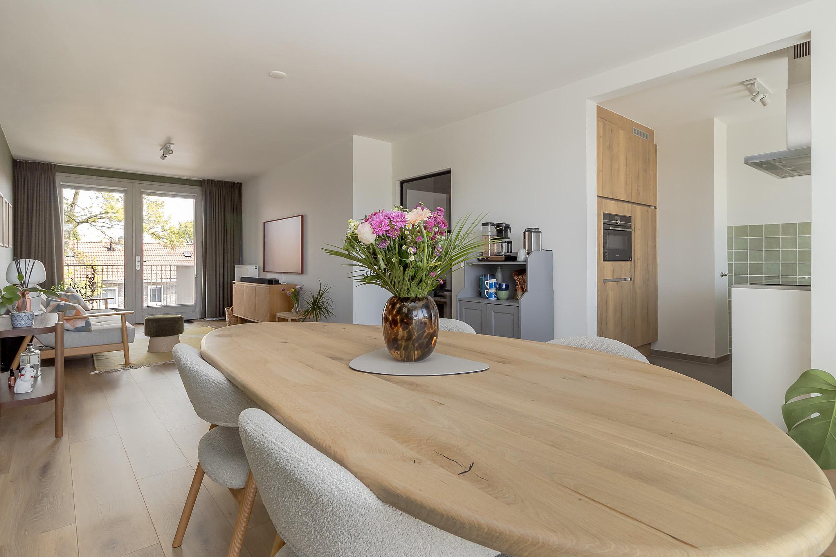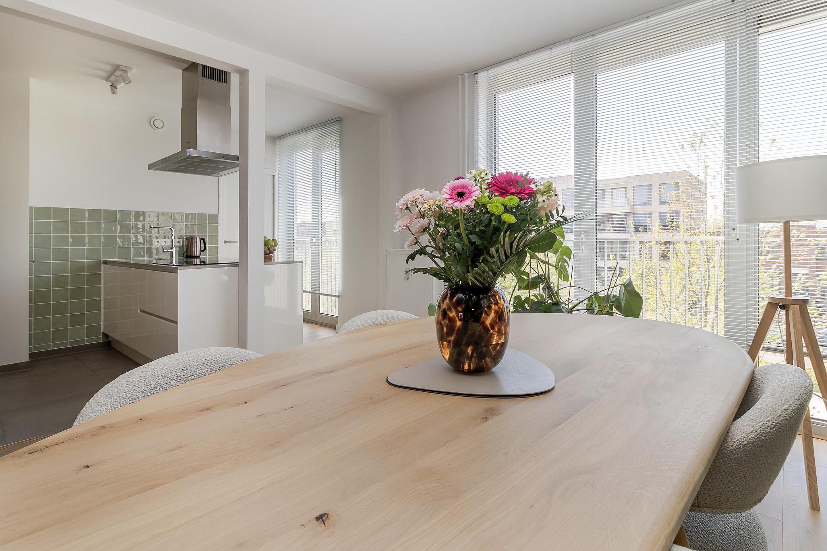 Achter de voordeur bevindt zich een lange hal welke toegang geeft tot alle vertrekken van het appartement. De ruime woonkamer (36m2) met open keuken (8m2) zijn voorzien van grote raampartijen en zorgen voor veel lichtinval. De voorzijde biedt uitzicht op de Groene Loper, gekenmerkt door zijn brede, groene lanen met grote bomen. Aan de achterzijde geven dubbele openslaande deuren toegang tot het balkon, gelegen op het oosten. De moderne open keuken met kookeiland is van alle gemakken voorzien en beschikt over een 4-pits inductie kookplaat, afzuigkap, oven, vaatwasser en koelkast met vriesvak, alles van het merk Siemens. Aansluitend bevindt zich de bijkeuken met witgoedaansluitingen, tevens de technische ruimte.
