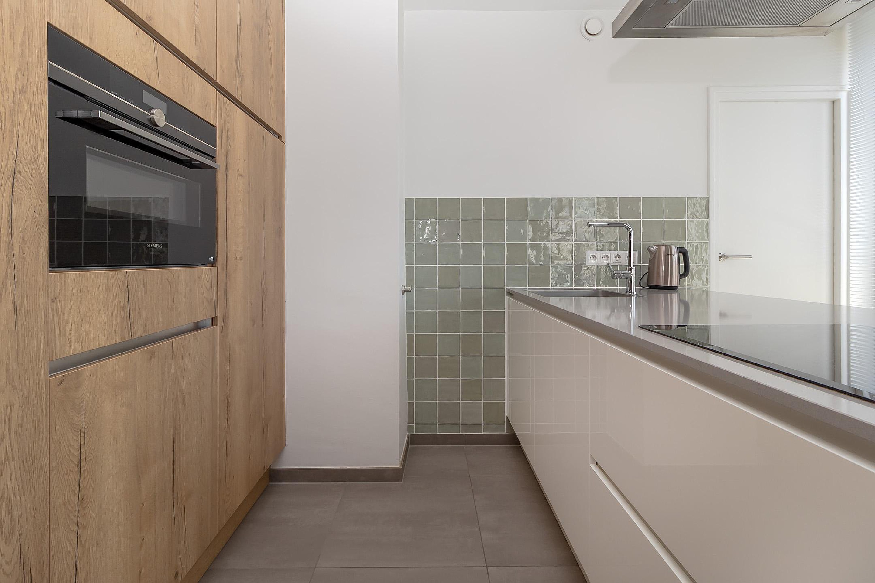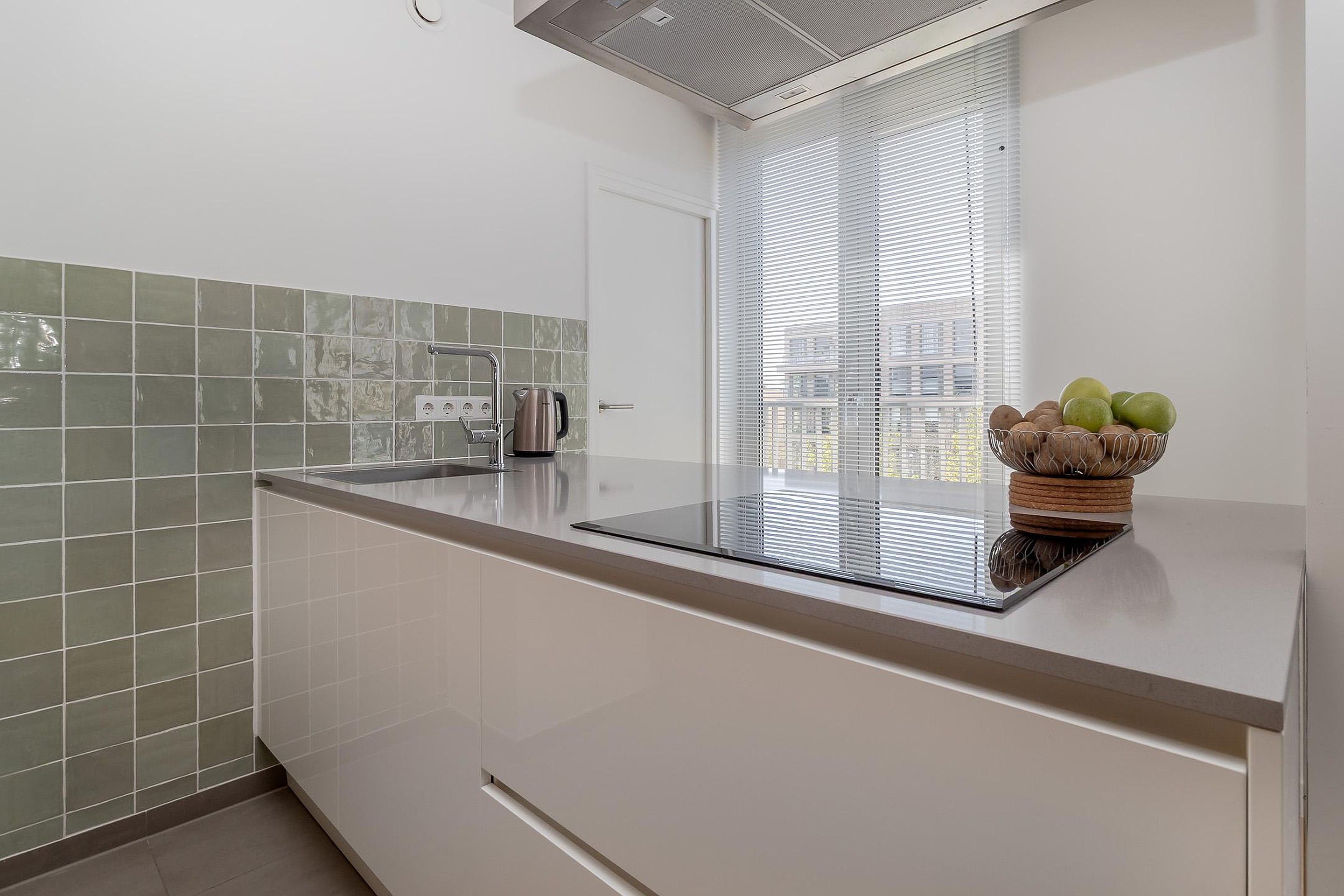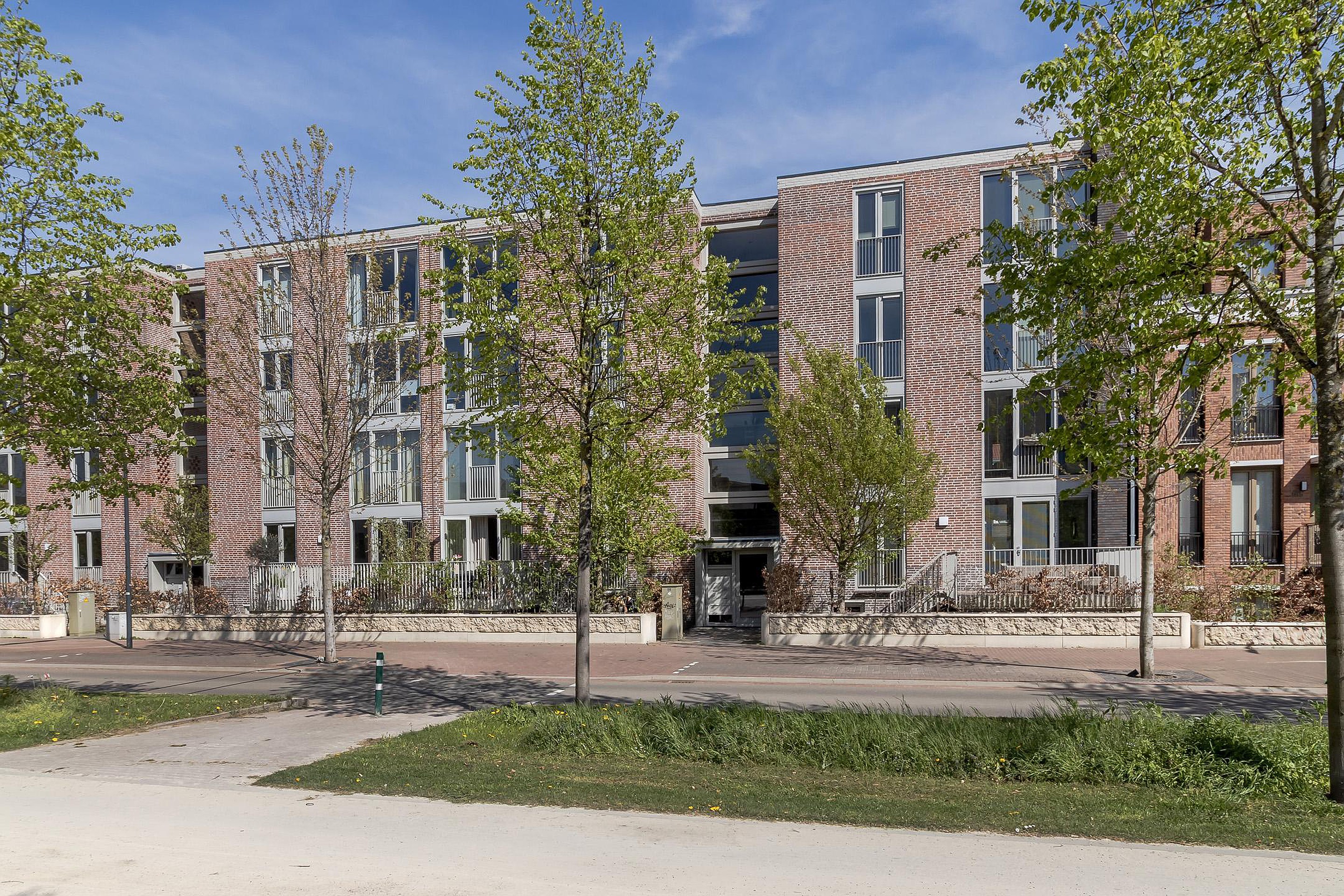 Achter de voordeur bevindt zich een lange hal welke toegang geeft tot alle vertrekken van het appartement. De ruime woonkamer (36m2) met open keuken (8m2) zijn voorzien van grote raampartijen en zorgen voor veel lichtinval. De voorzijde biedt uitzicht op de Groene Loper, gekenmerkt door zijn brede, groene lanen met grote bomen. Aan de achterzijde geven dubbele openslaande deuren toegang tot het balkon, gelegen op het oosten. De moderne open keuken met kookeiland is van alle gemakken voorzien en beschikt over een 4-pits inductie kookplaat, afzuigkap, oven, vaatwasser en koelkast met vriesvak, alles van het merk Siemens. Aansluitend bevindt zich de bijkeuken met witgoedaansluitingen, tevens de technische ruimte.