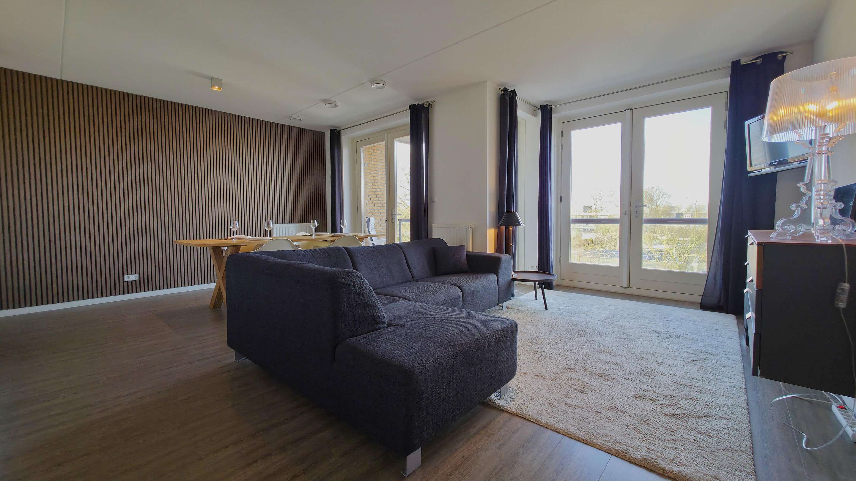 De woonkamer voelt direct goed: royaal van opzet en heerlijk licht dankzij de grote raampartijen. Hier geniet je van een prettige sfeer, of je nu ontspant na een lange dag of gasten ontvangt. De dubbele openslaande deuren verbinden binnen moeiteloos met buiten en geven toegang tot het balkon – een fijne plek om de dag te beginnen met koffie of af te sluiten in de avondzon.