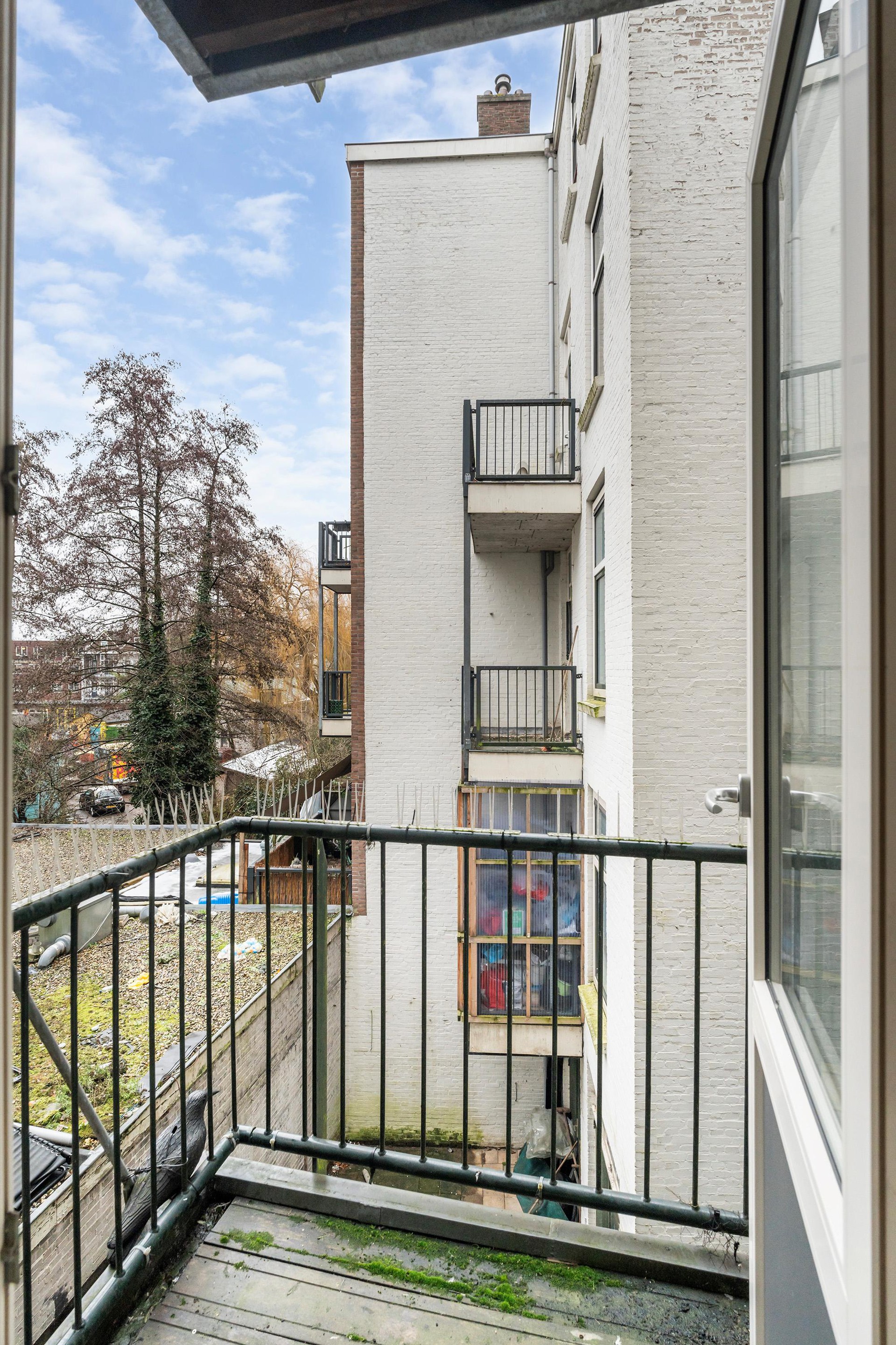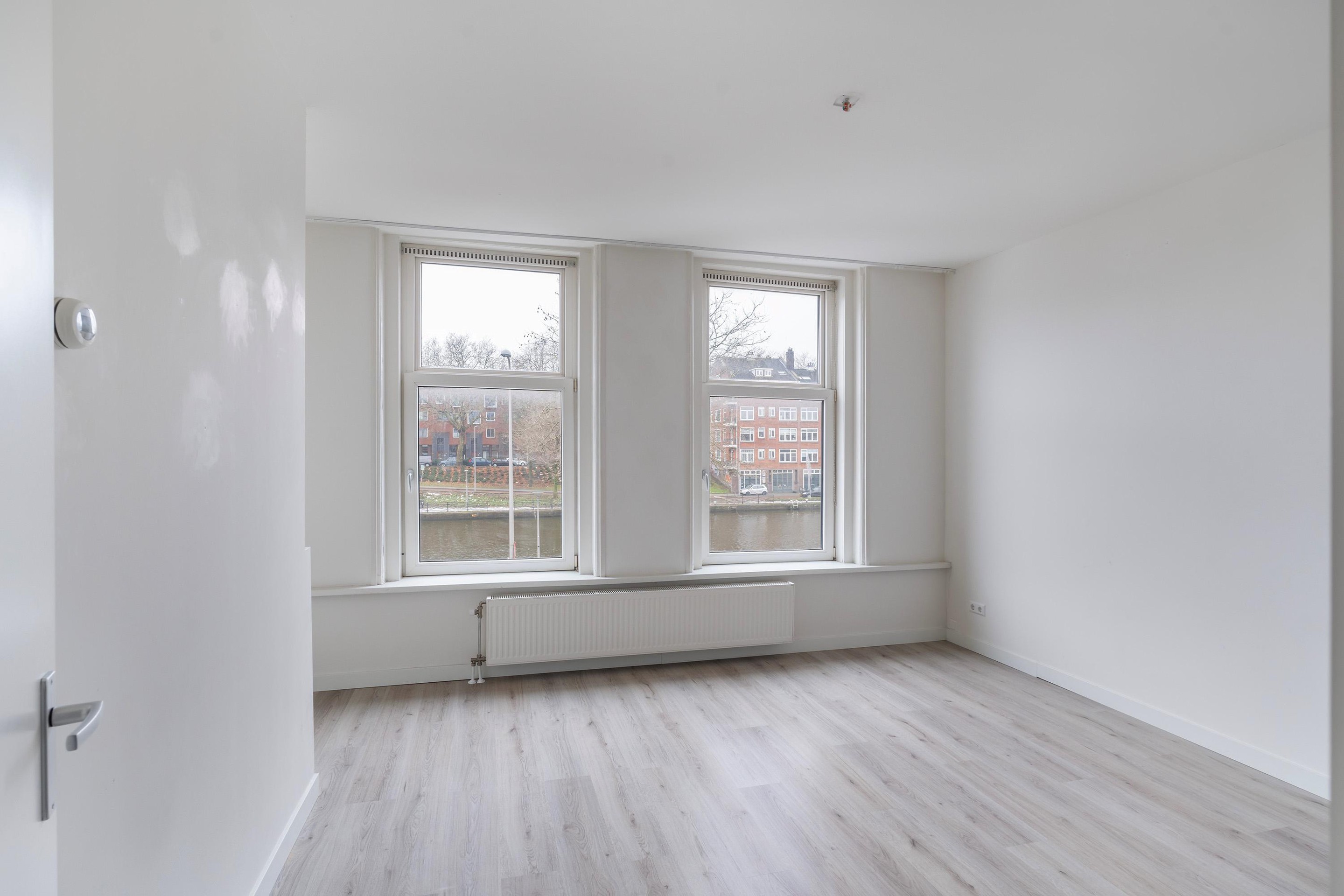 De slaapkamer biedt rust en privacy en geeft toegang tot het balkon. Deze buitenruimte vormt een prettige plek voor een ontspannen moment, met uitzicht op de karakteristieke kade.