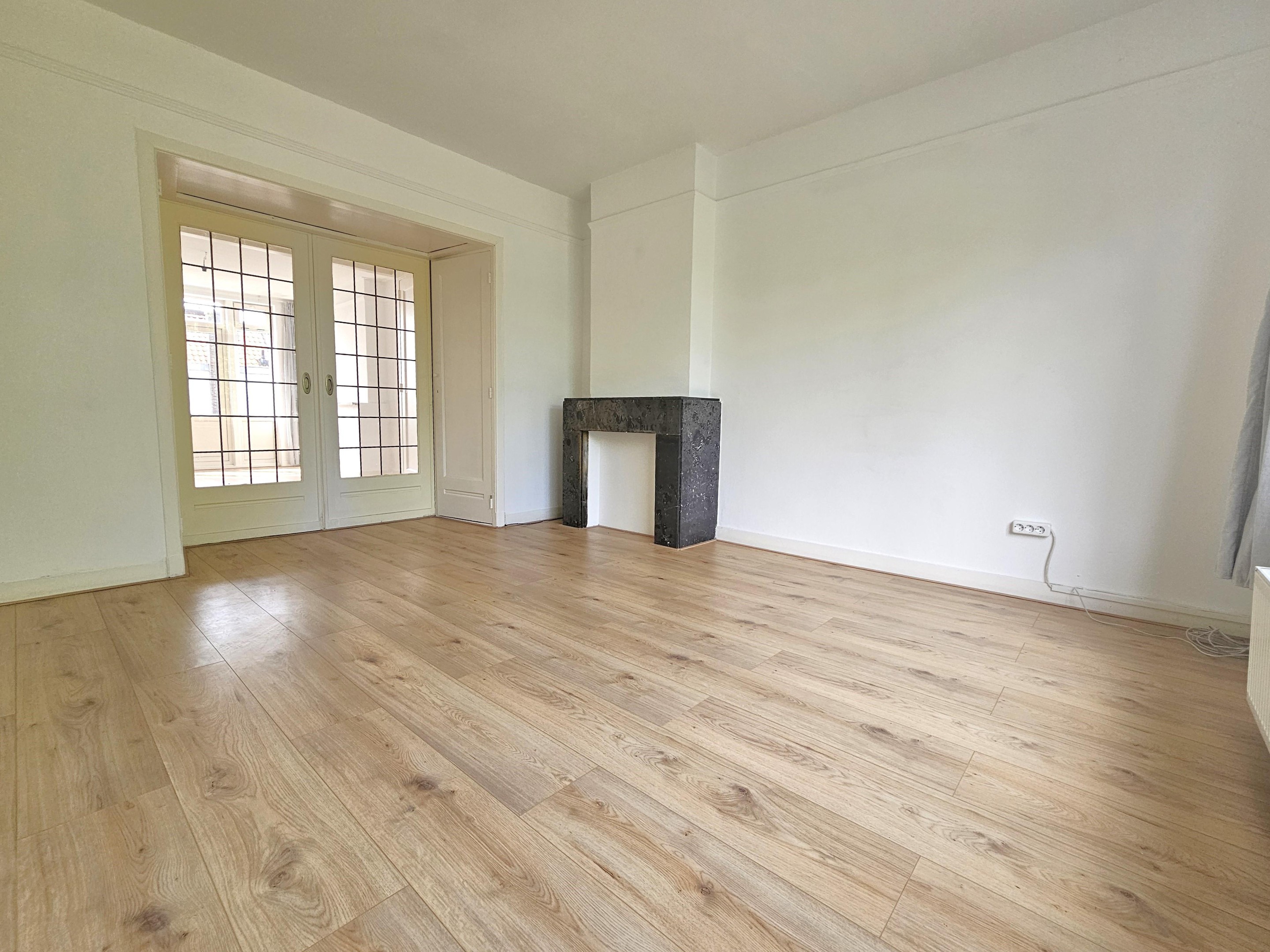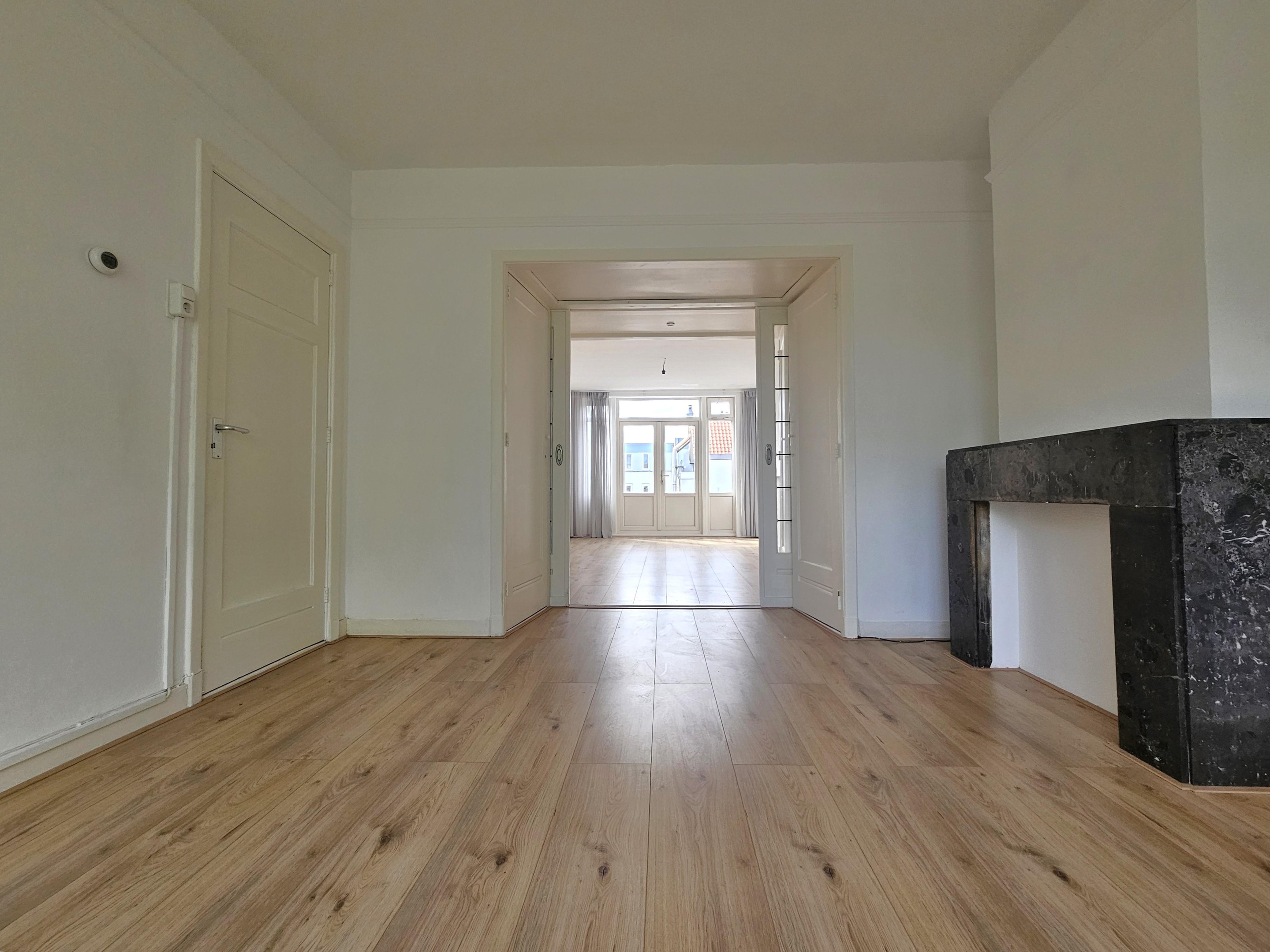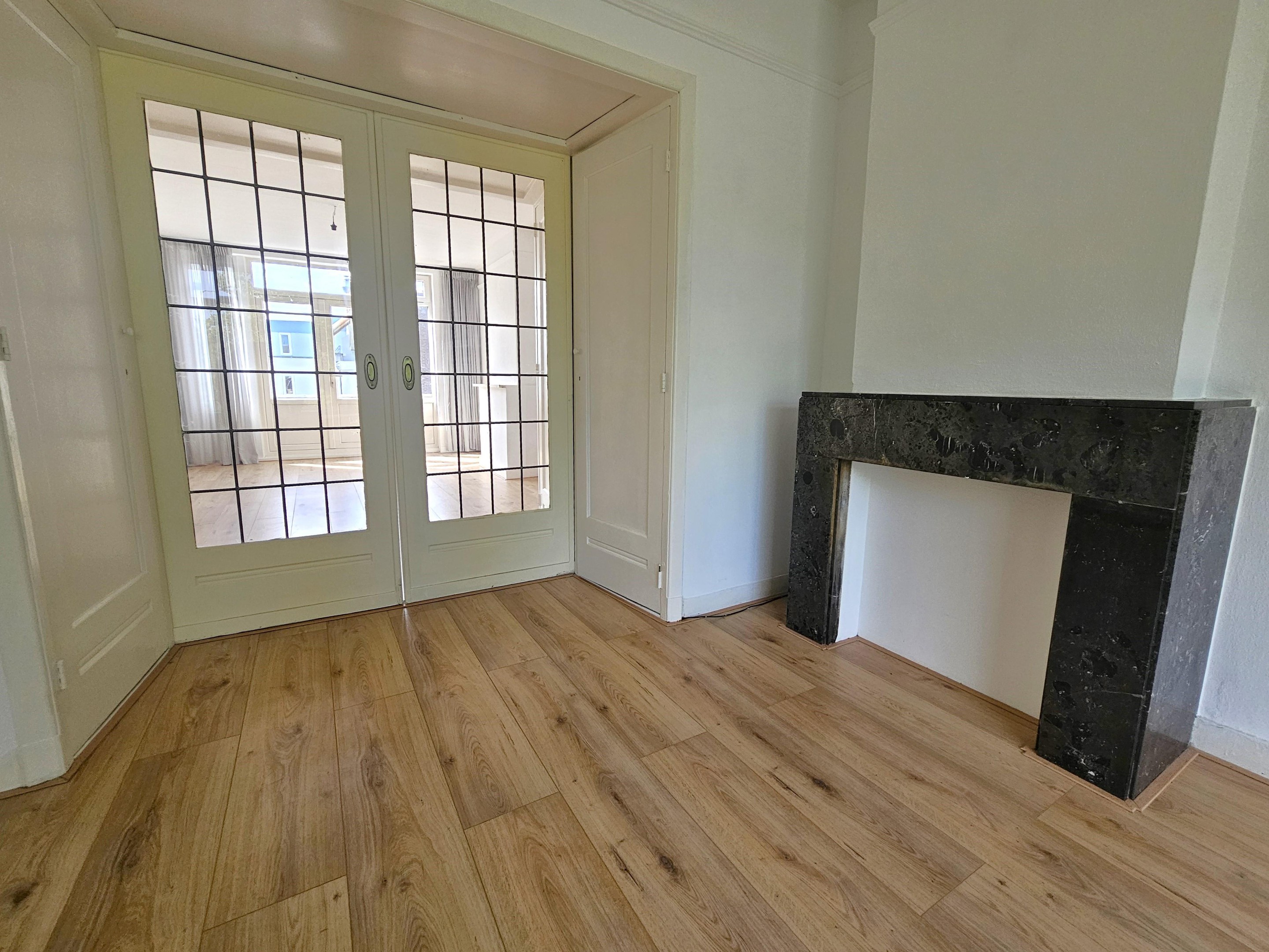 Sfeervolle woonkamer en suite met originele schuifdeuren voorzien van glas-in-lood en een klassieke schouw. De doorzonindeling zorgt voor veel licht en ruimte.