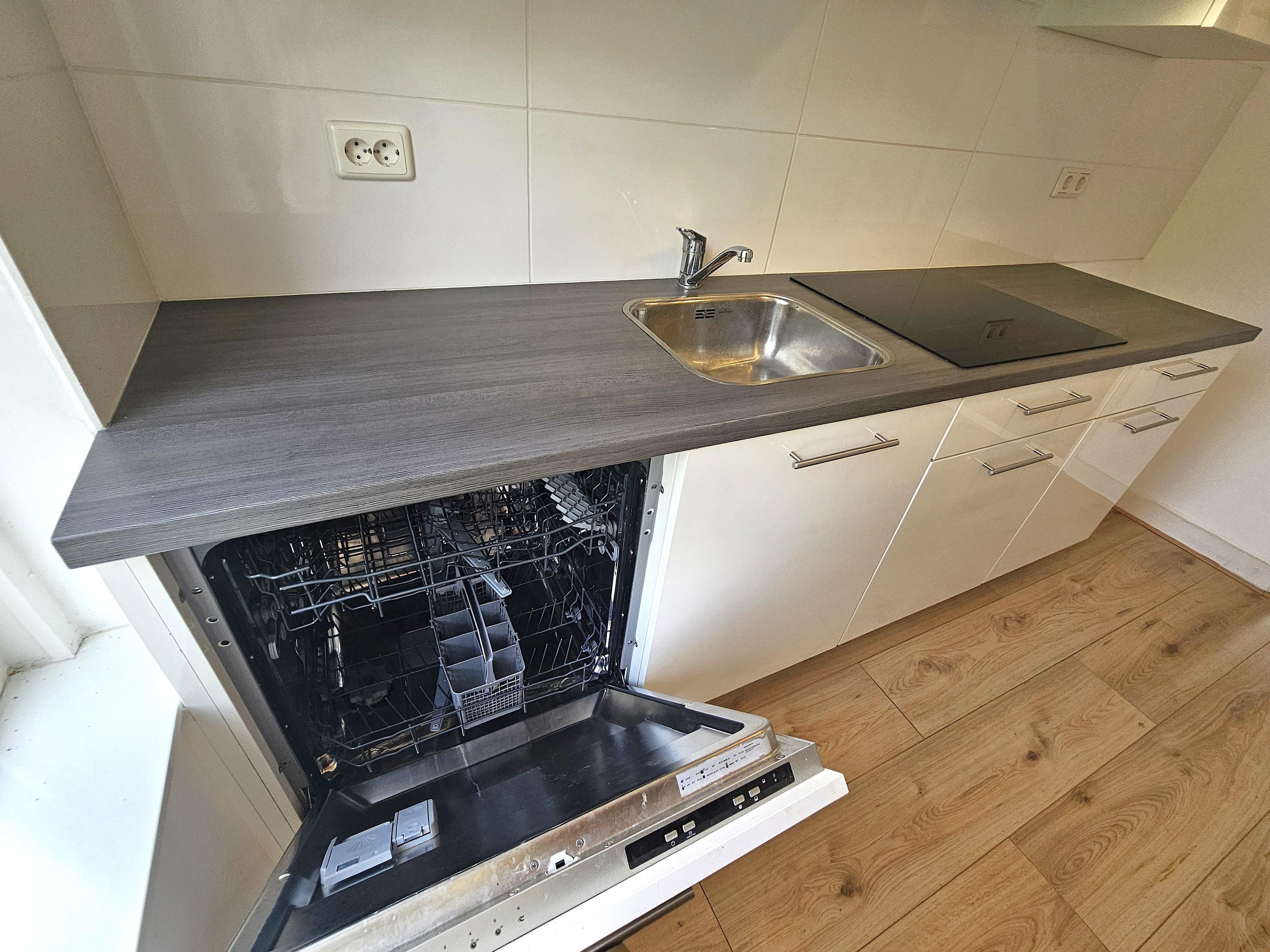 Moderne keuken met inductiekookplaat, vaatwasser, afzuigkap en strak werkblad. Vanuit de keuken kijk je uit op het groen.