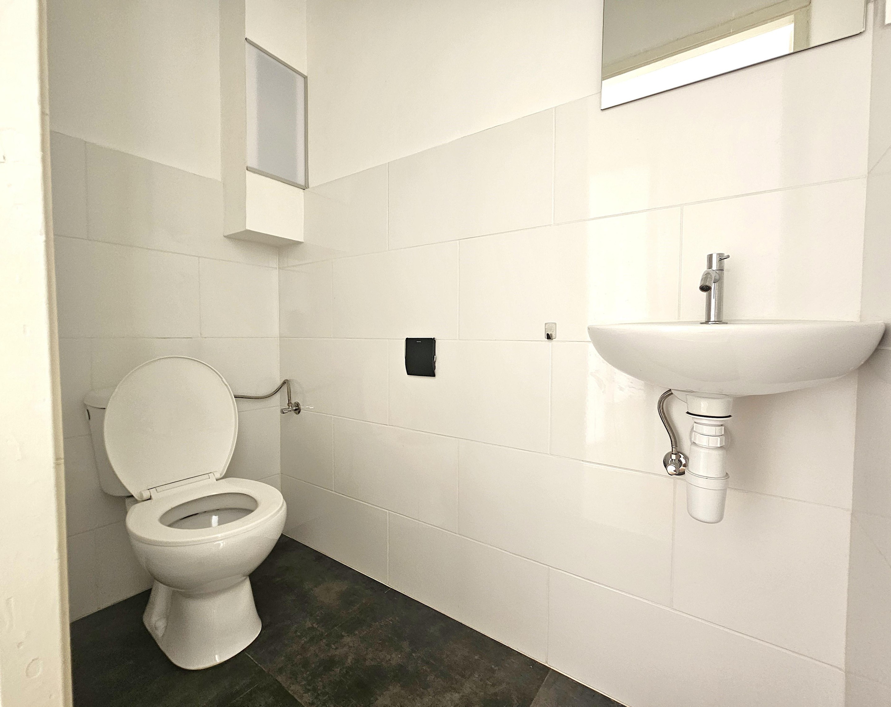 Ruime separate toiletruimte, strak betegeld en met fontein, apart van de badkamer.