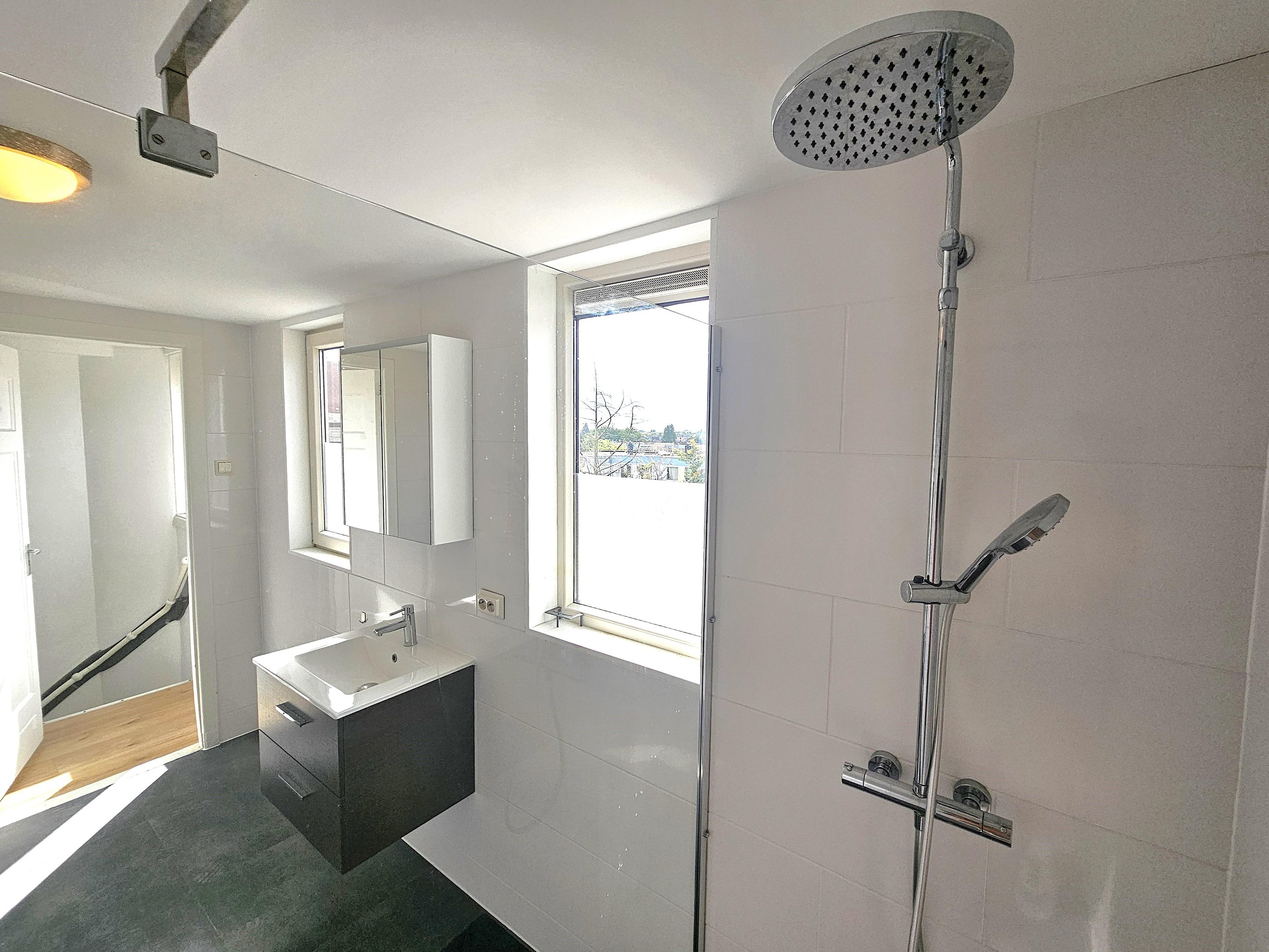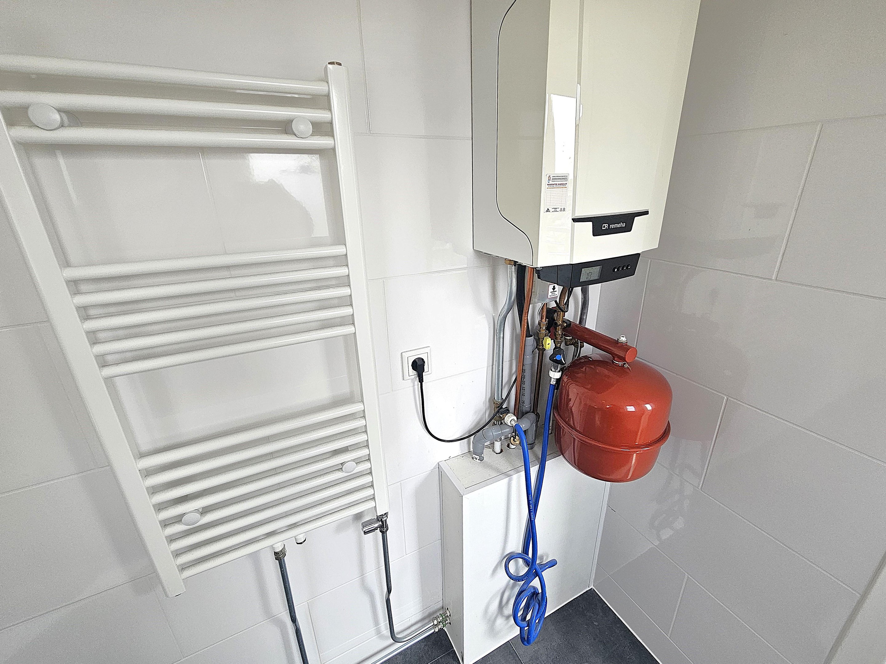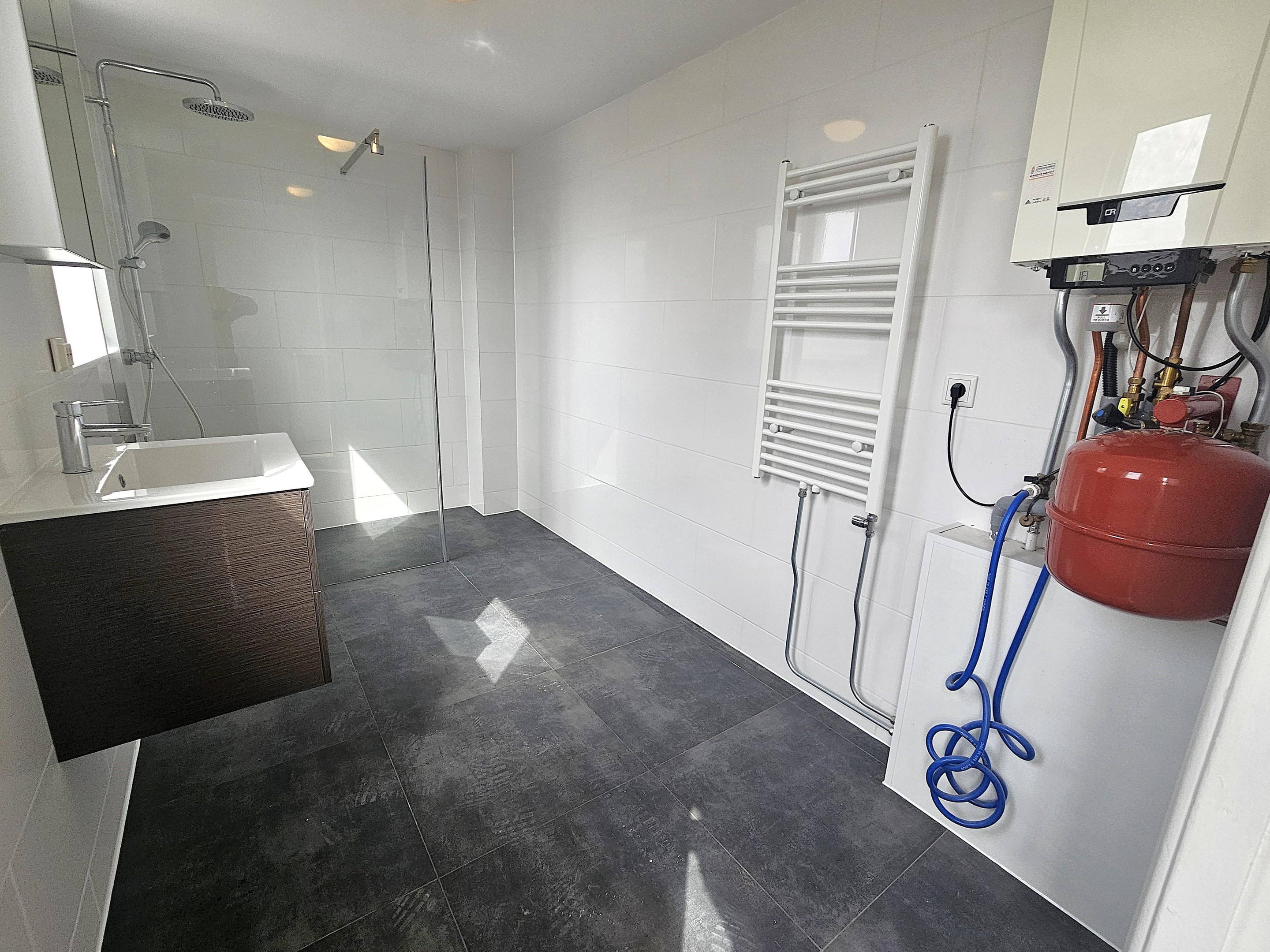 Nette badkamer met inloopdouche, wastafelmeubel, designradiator en ruimte voor de cv-installatie.