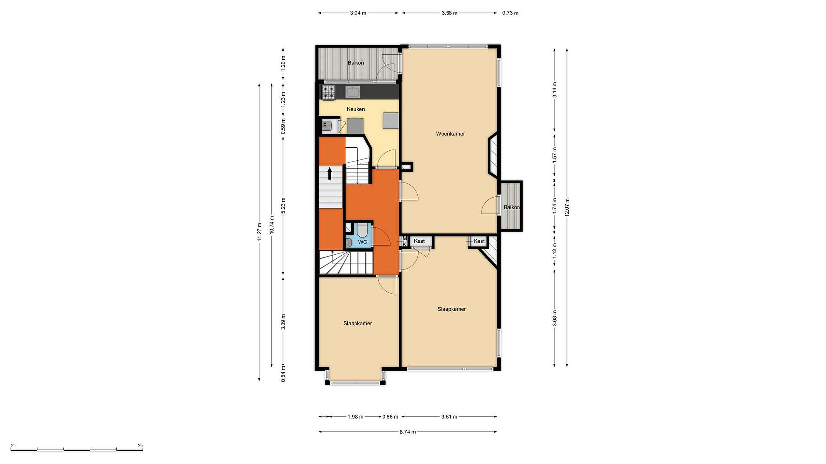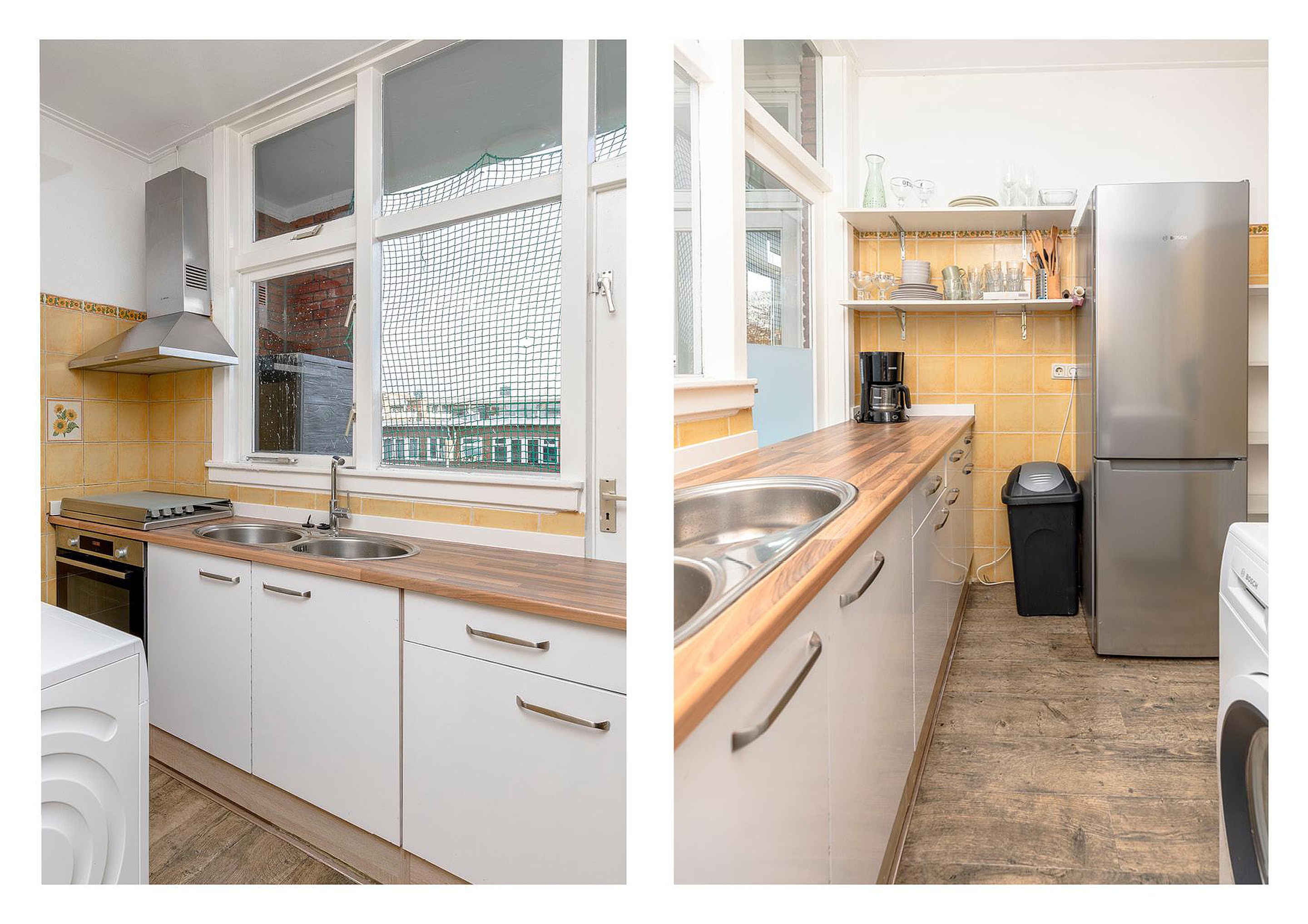 De keuken grenst direct aan de woonkamer en is netjes doch in eenvoudige staat. Mogelijkheid om de keuken door te breken naar de woonkamer om een open keuken te creëren. Ook vanuit de keuken is er toegang tot het balkon aan de achterzijde.