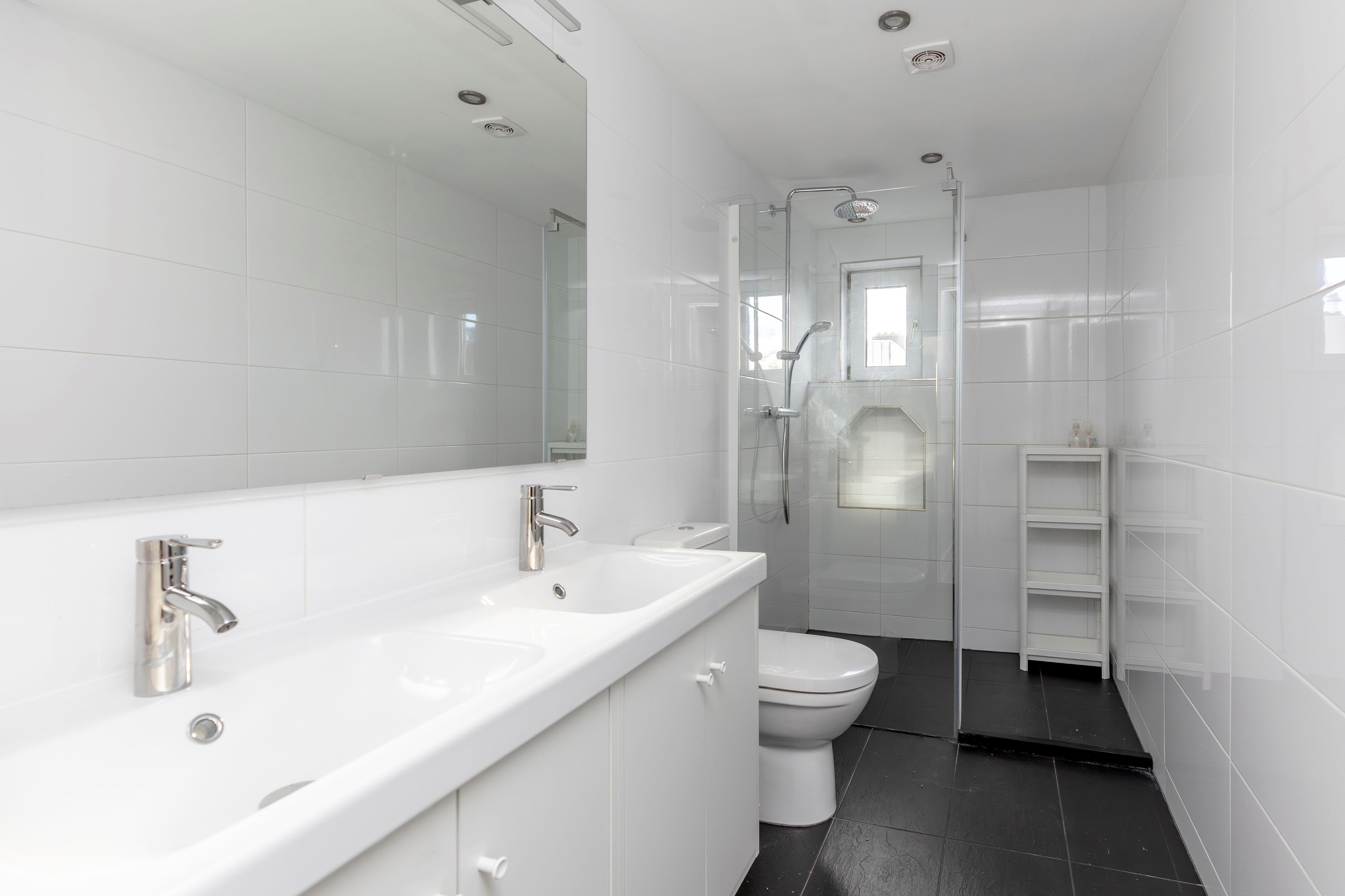 De badkamer is voorzien van een ruime inloopdouche met regendouche en handdouche, thermostaatkraan, extra wc, dubbele wastafels met meubel en handdoekenradiator.