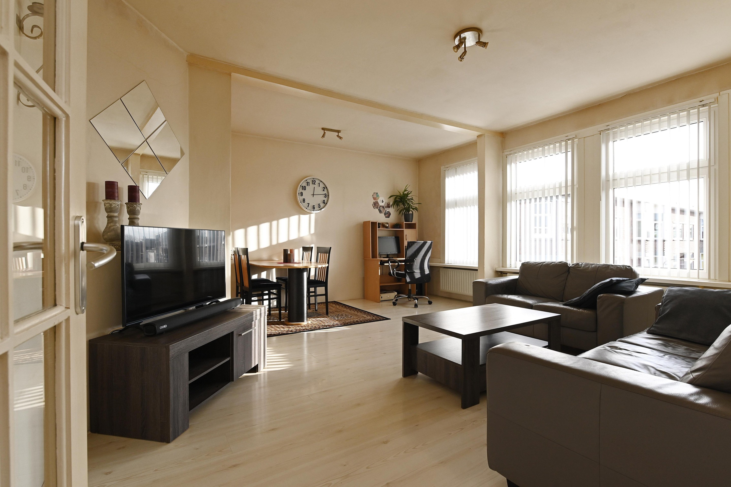 De doorgebroken woonkamer ligt aan de voorzijde van de woning en biedt een vrij uitzicht over de Watervlierstraat.