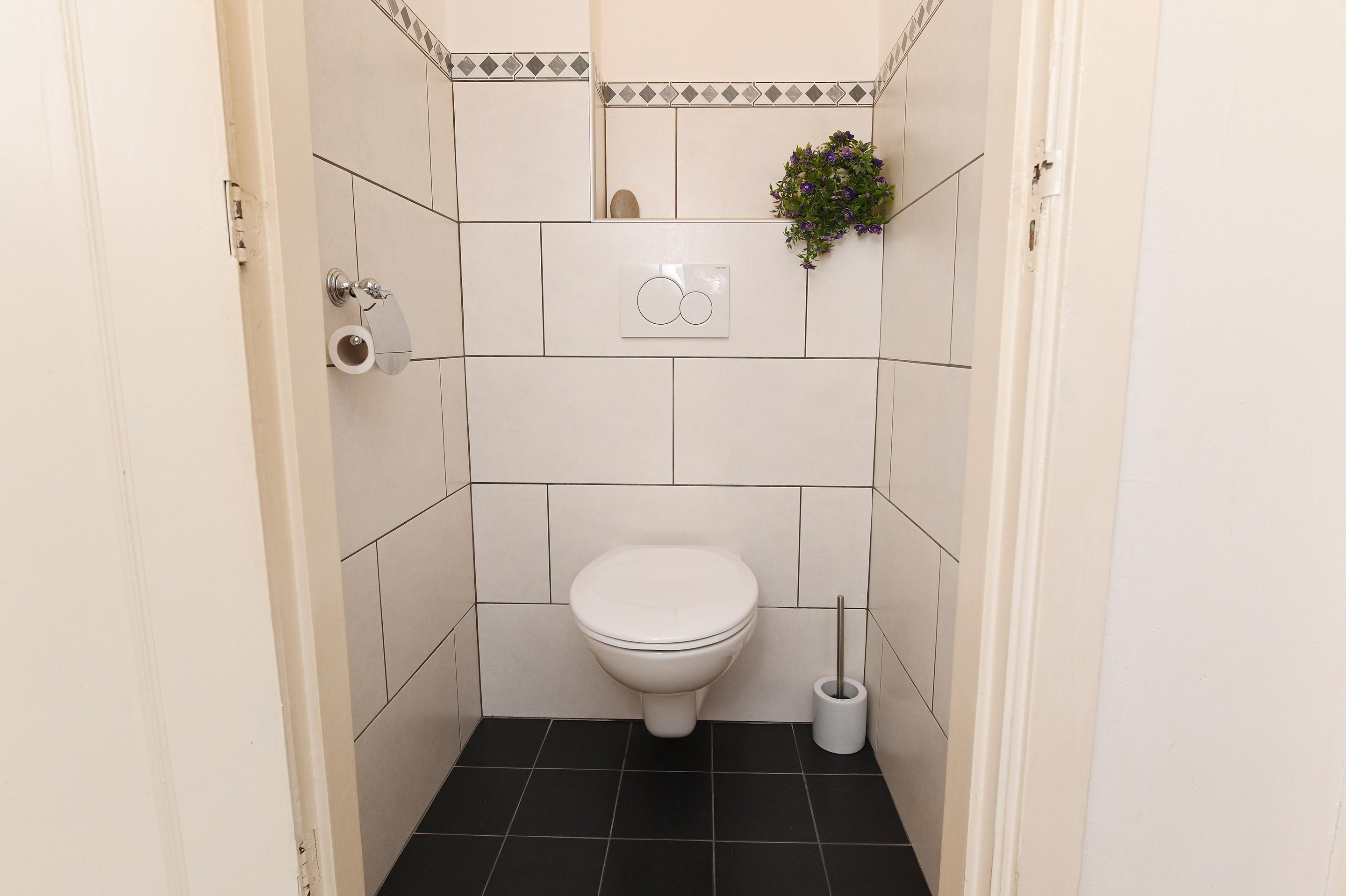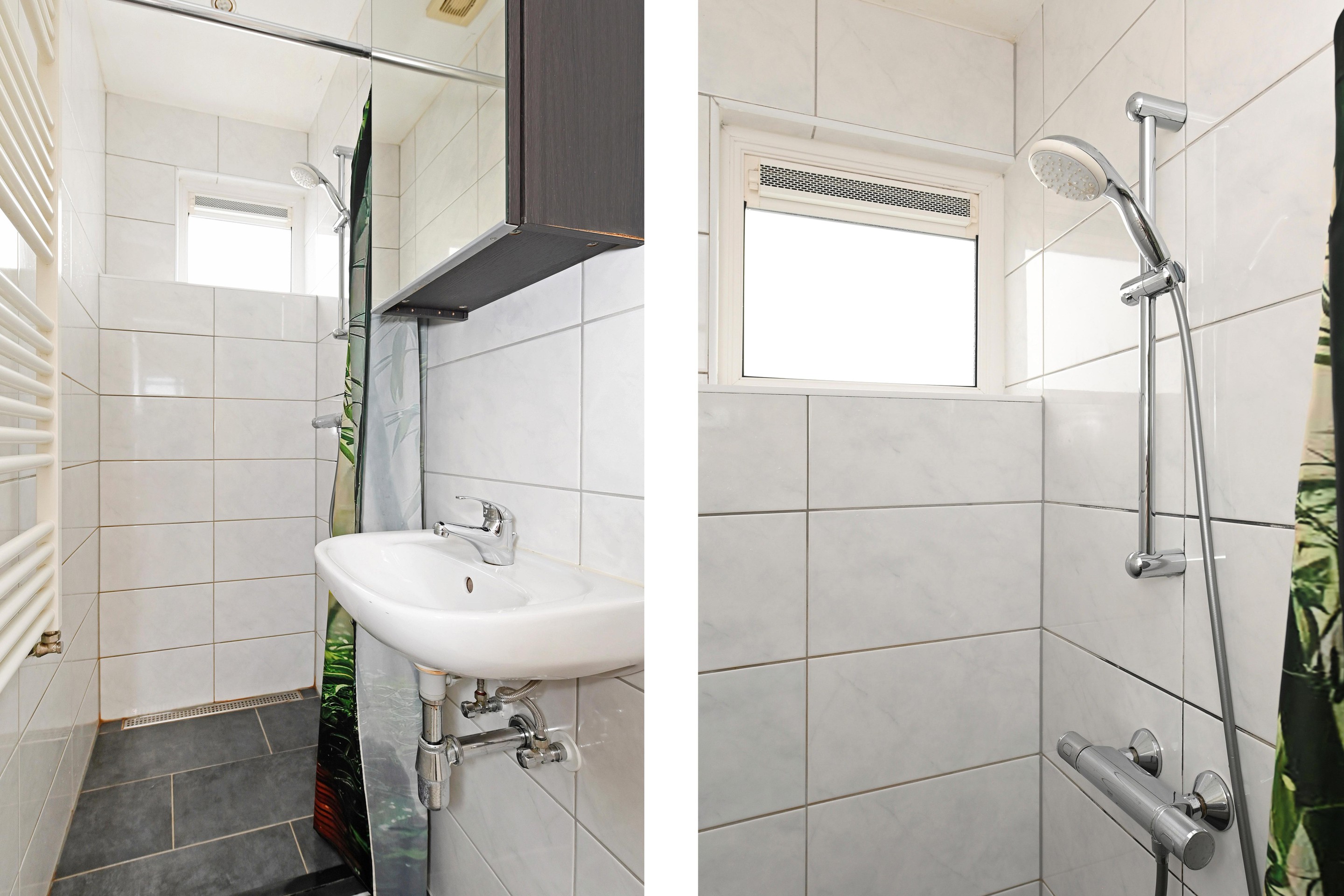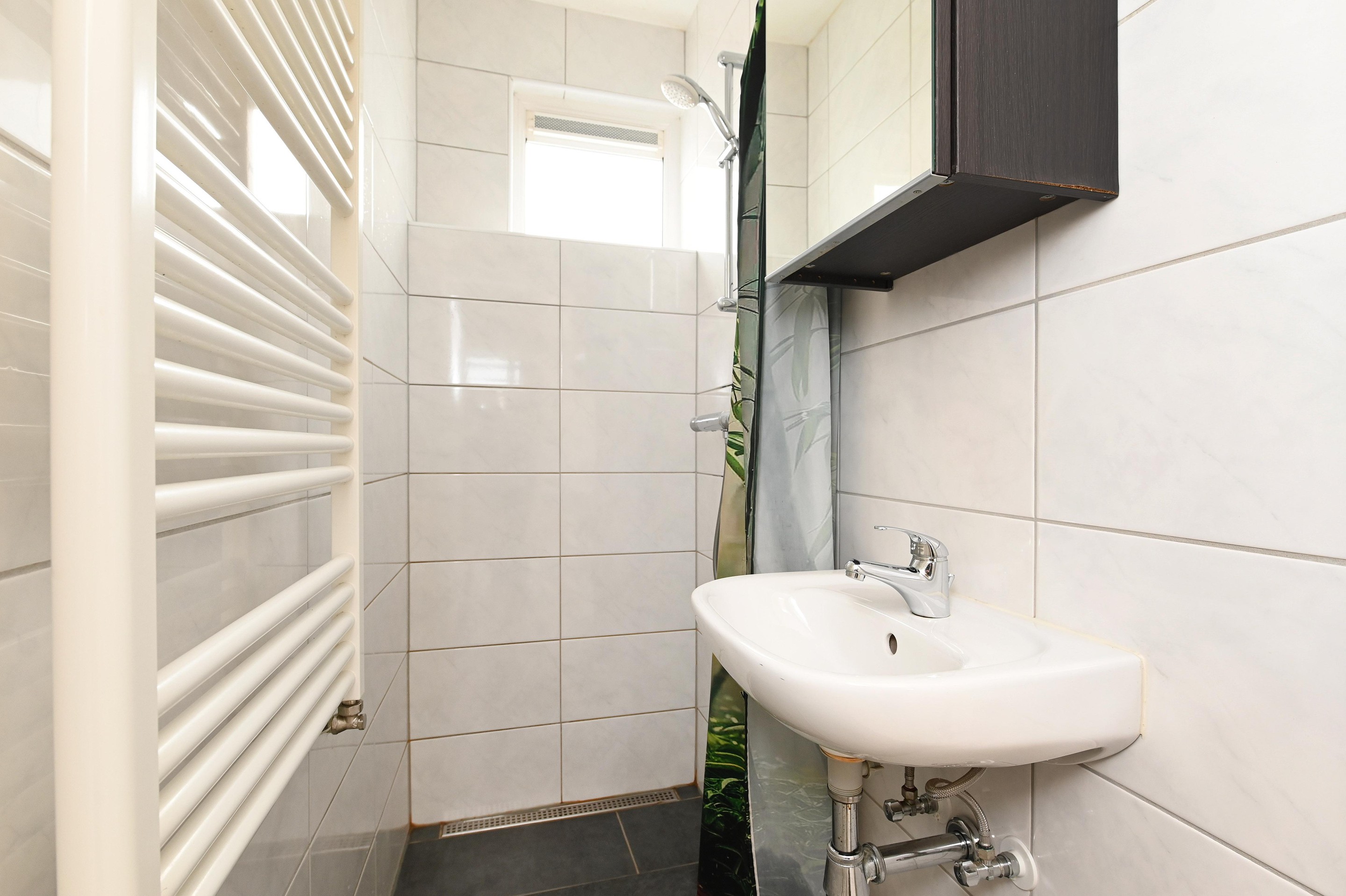 Aan de voorzijde ligt de eenvoudige, compacte badkamer met wastafel en douche. Het toilet is apart en netjes uitgevoerd.