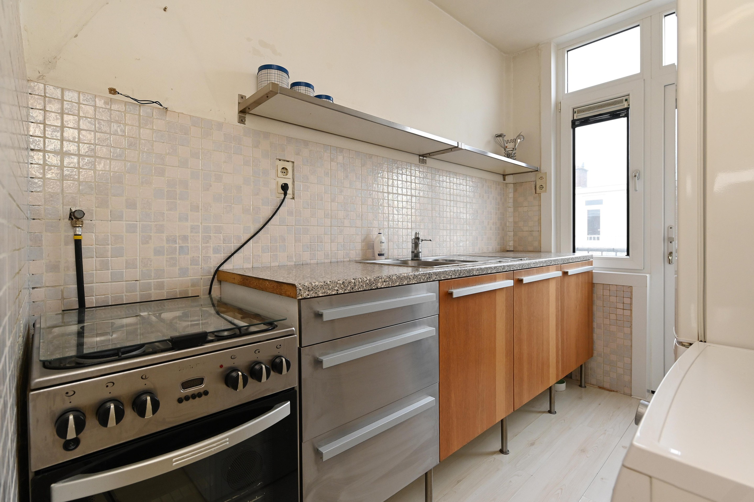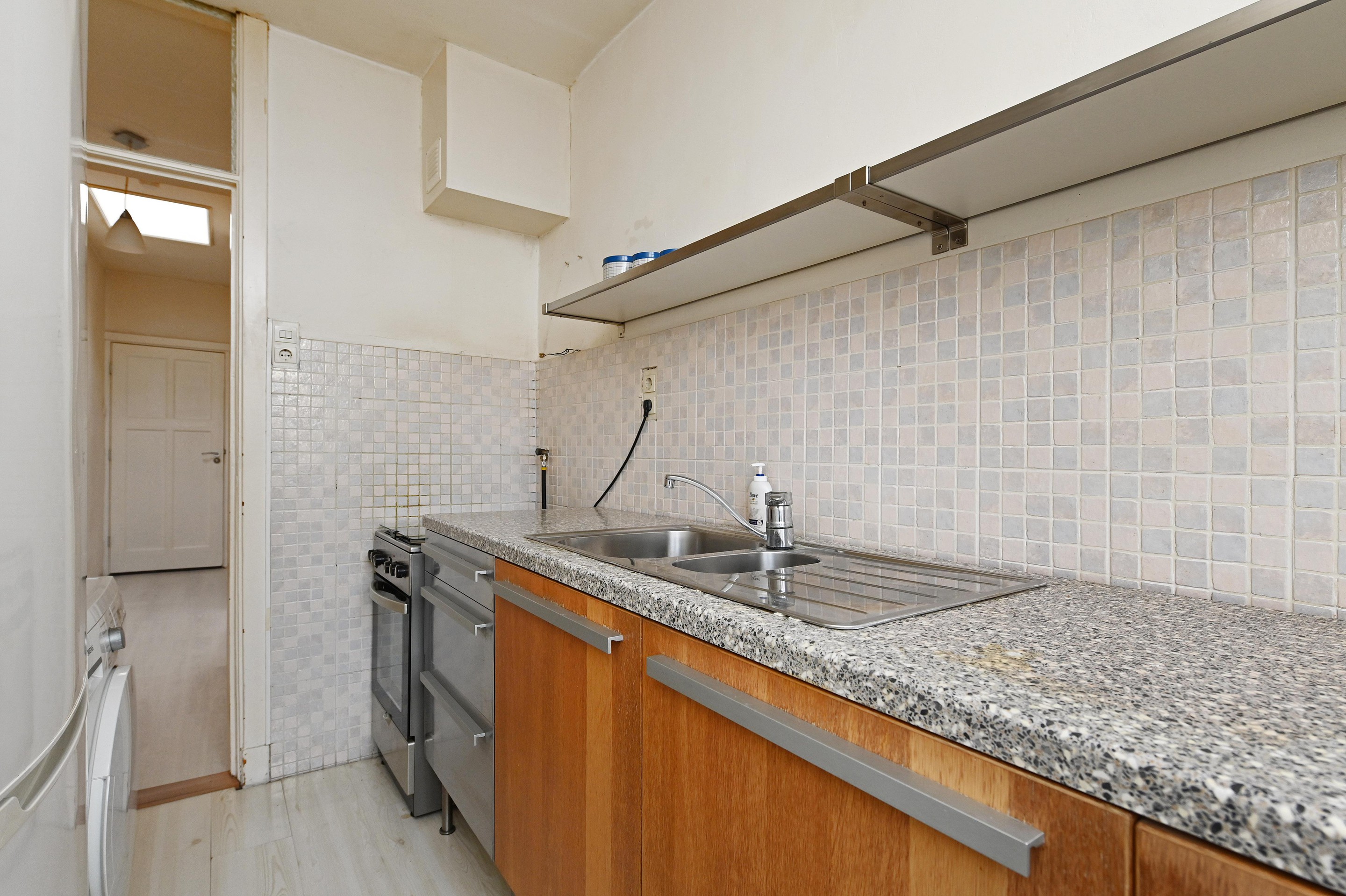 De keuken, eveneens aan de achterzijde, is eenvoudig uitgevoerd en voorzien van een oven met fornuis en werkblad met kasten. Vanuit de keuken heb je toegang tot het balkon met middagzon.