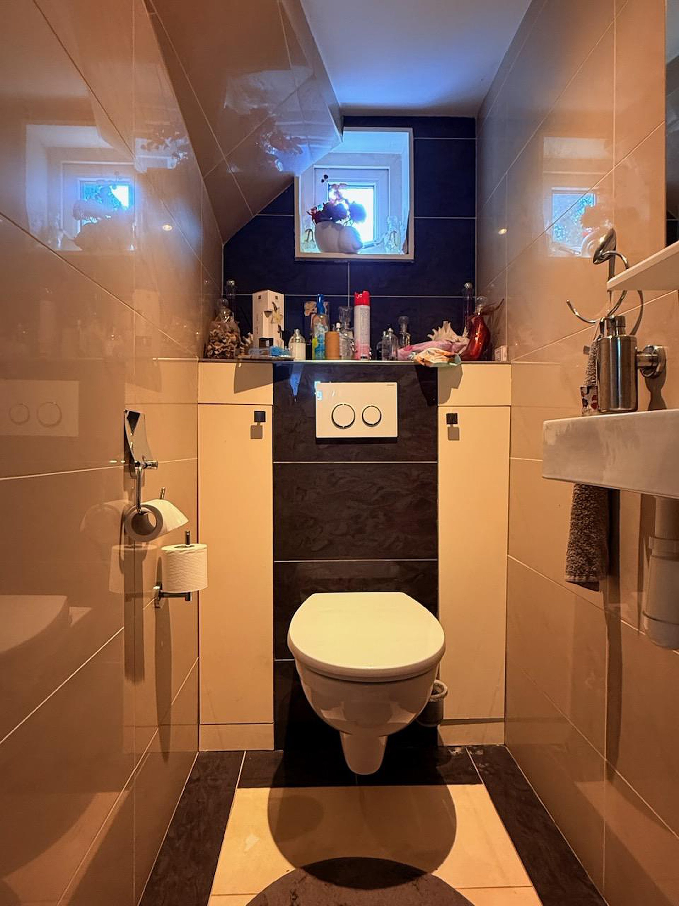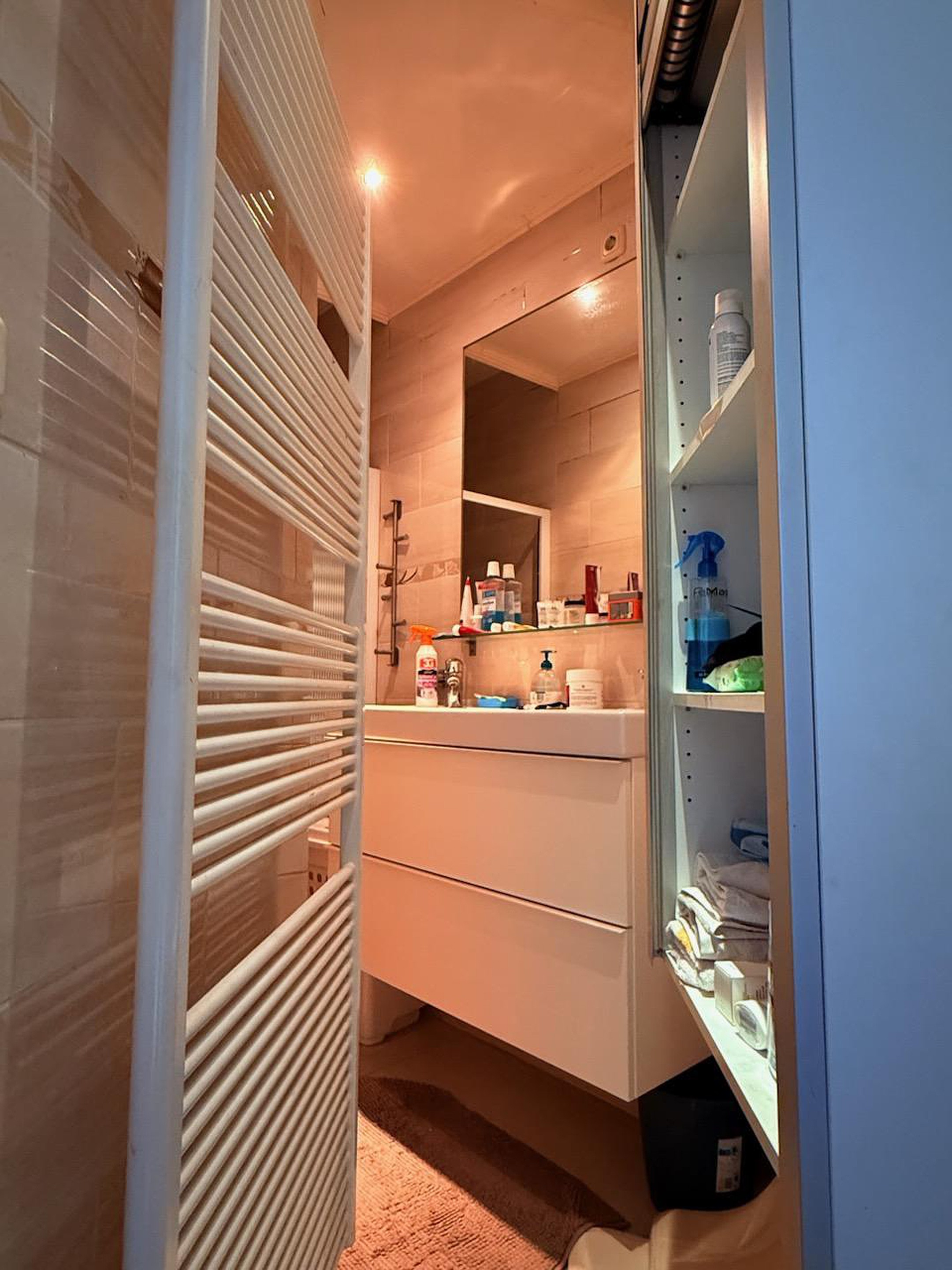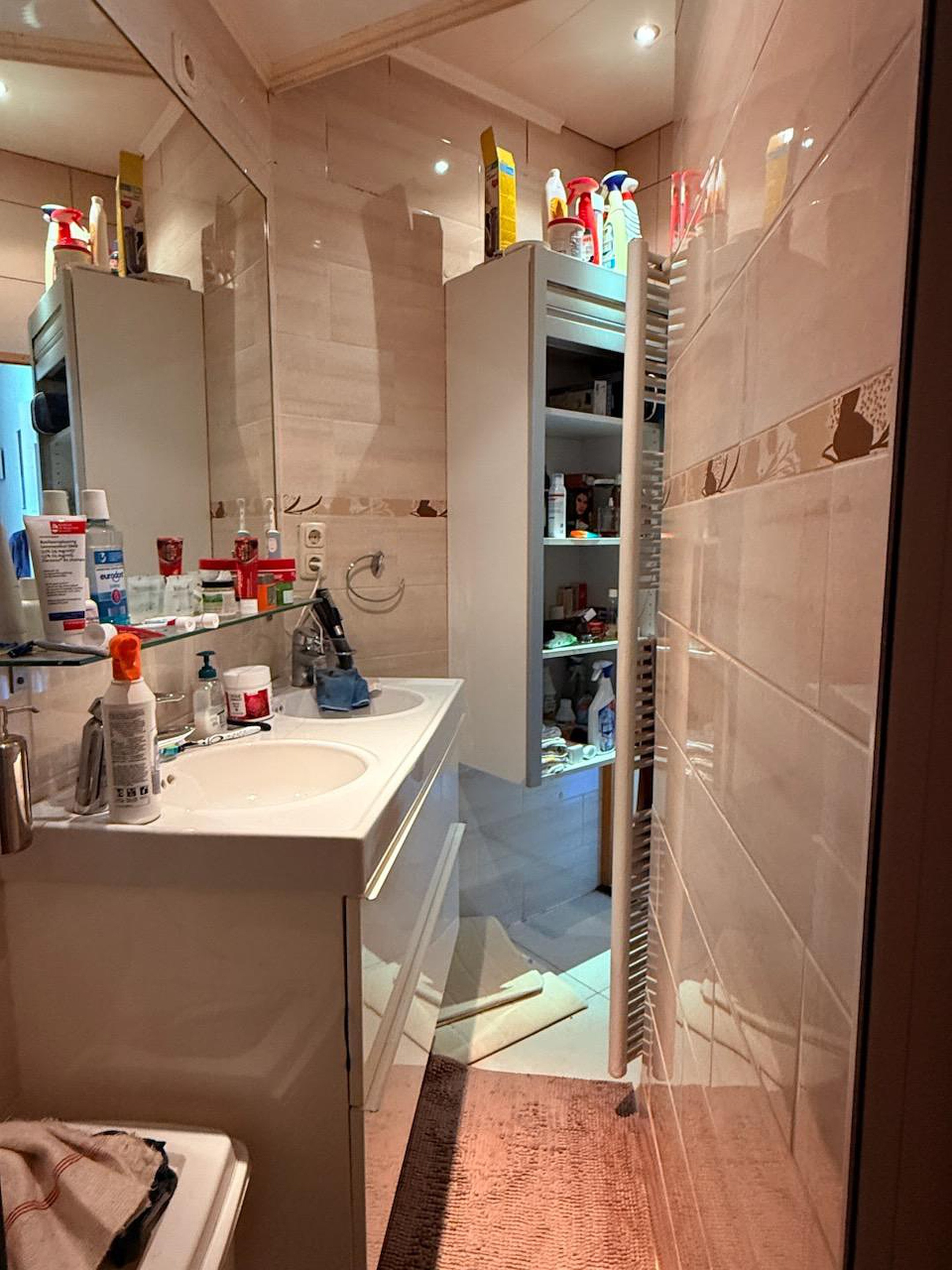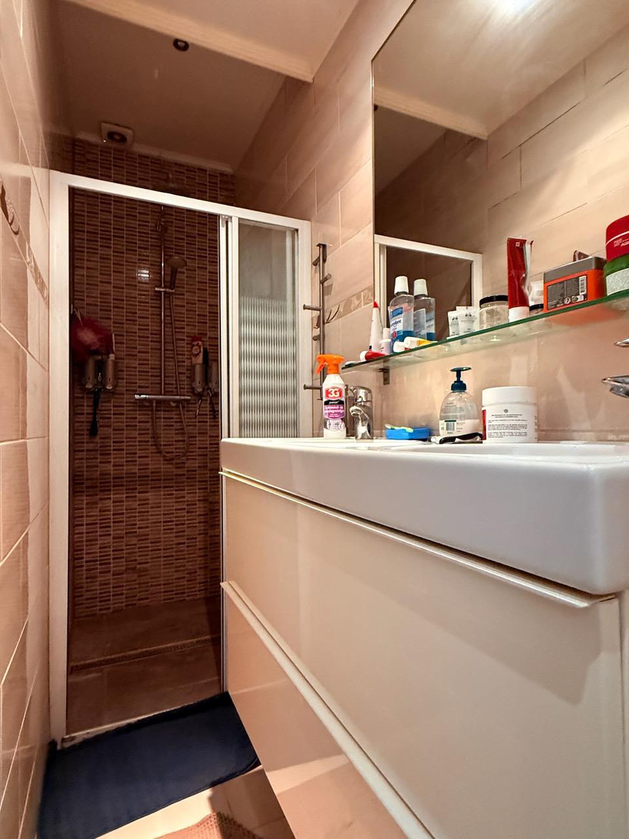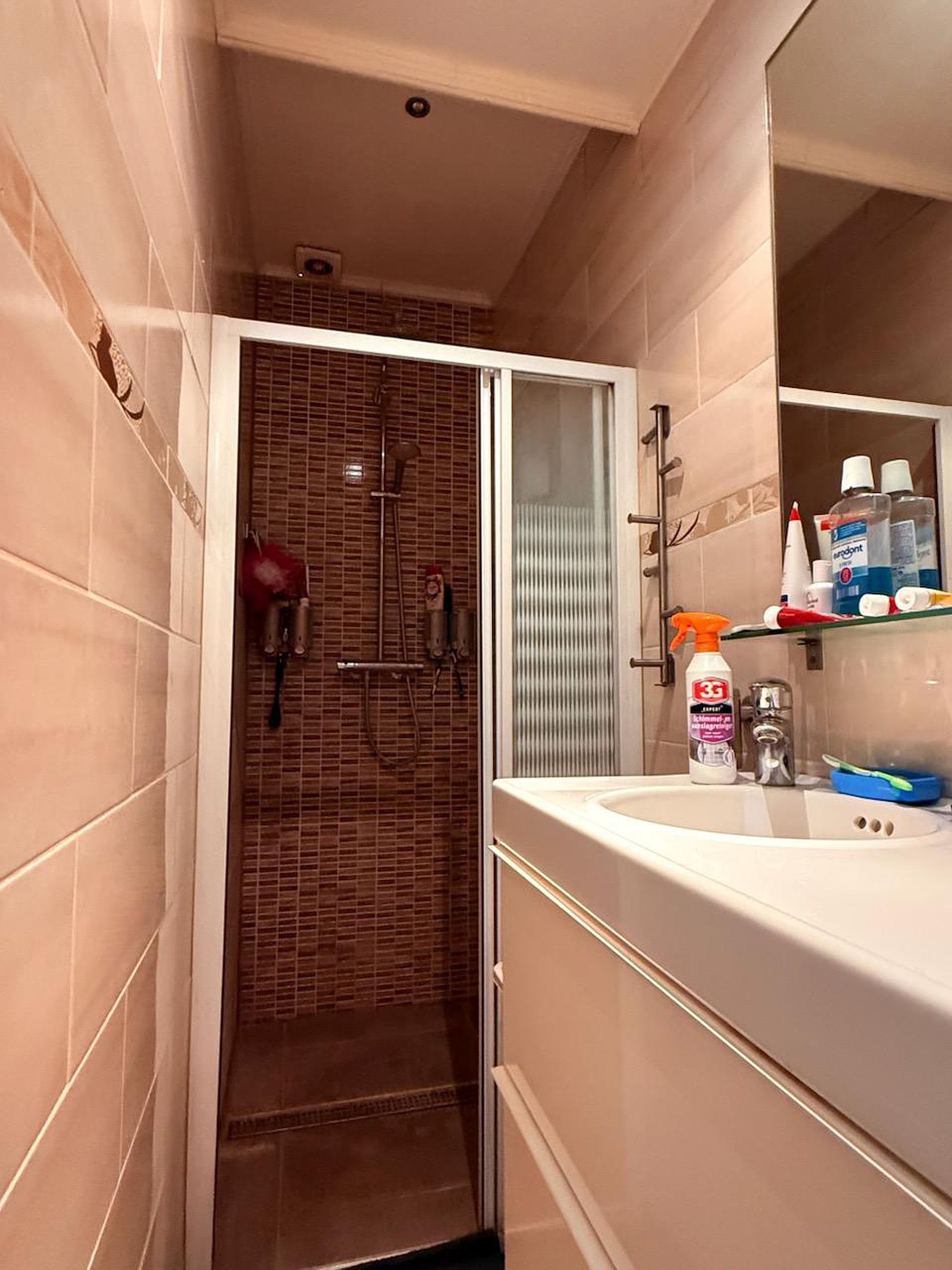 De badkamer heeft een douchecabine en wastafelmeubel; het toilet is separaat.