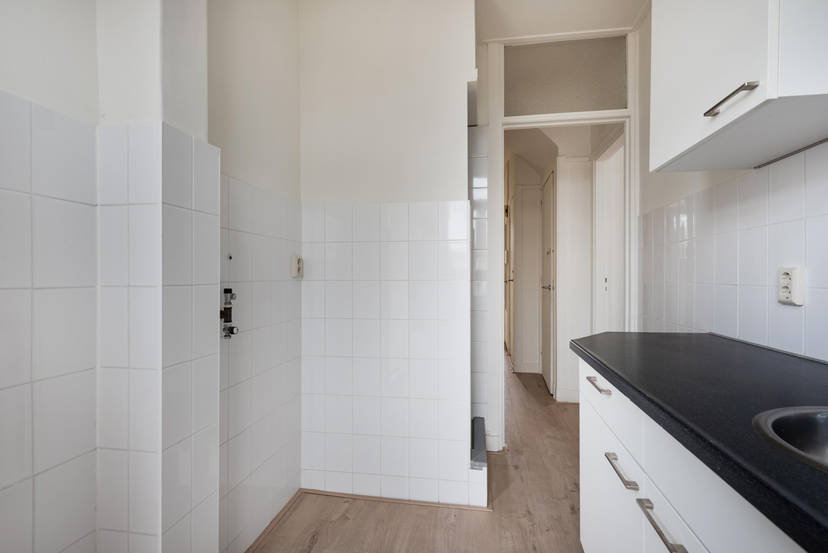 Begane grond (Afgesloten) Portiek, 1e etage; entree woning, hal v.v. toilet en berging, woonkamer met toegang tot dakterras, voorzijde slaapkamer, achter slaapkamer, gesloten keuken met douche.