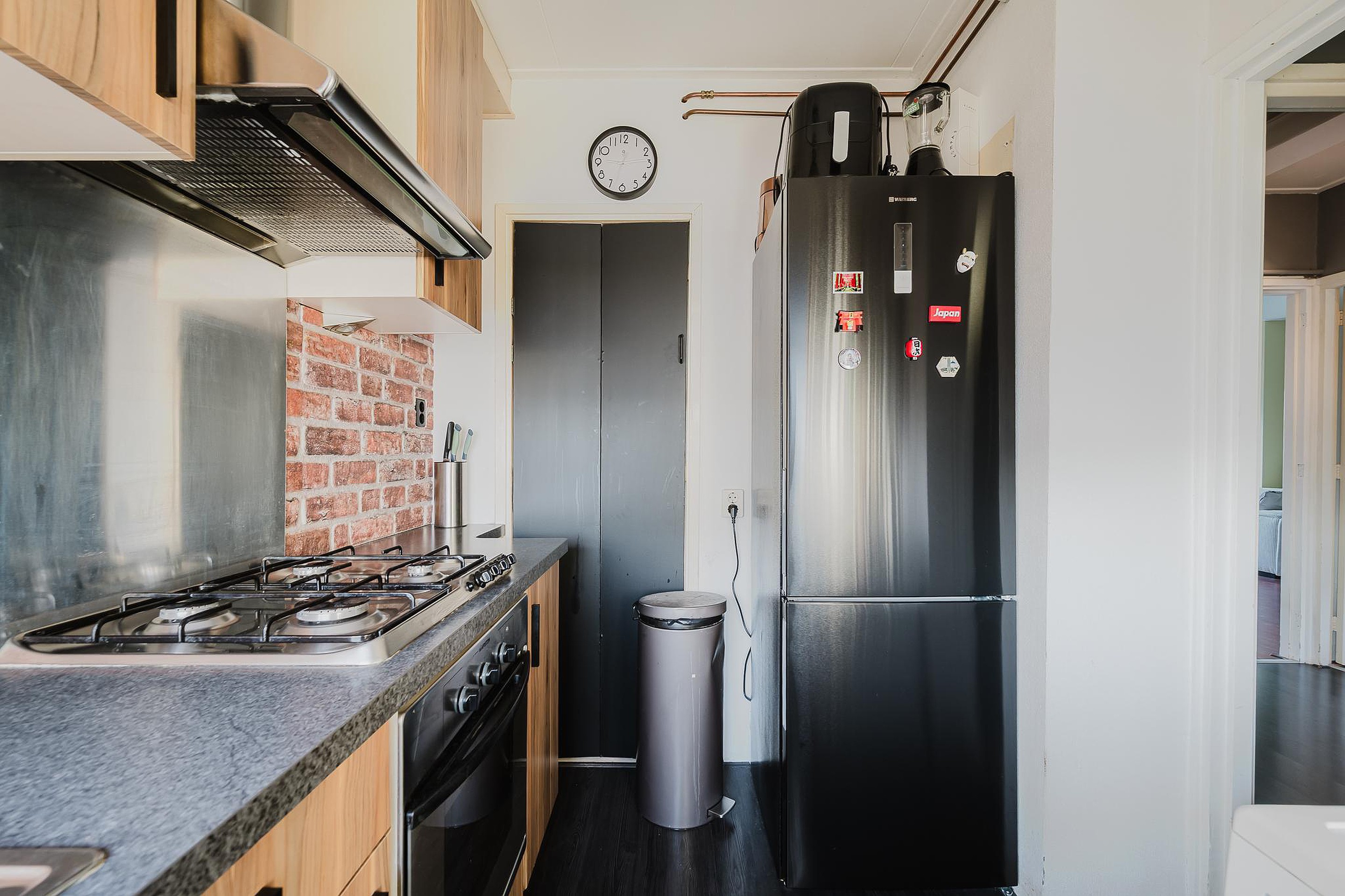 De keuken bevindt zich aan de voorzijde van het appartement en is voorzien van inbouwapparatuur, een wasmachineaansluiting en bergruimte waar ook plek is voor een droger en de cv-installatie.