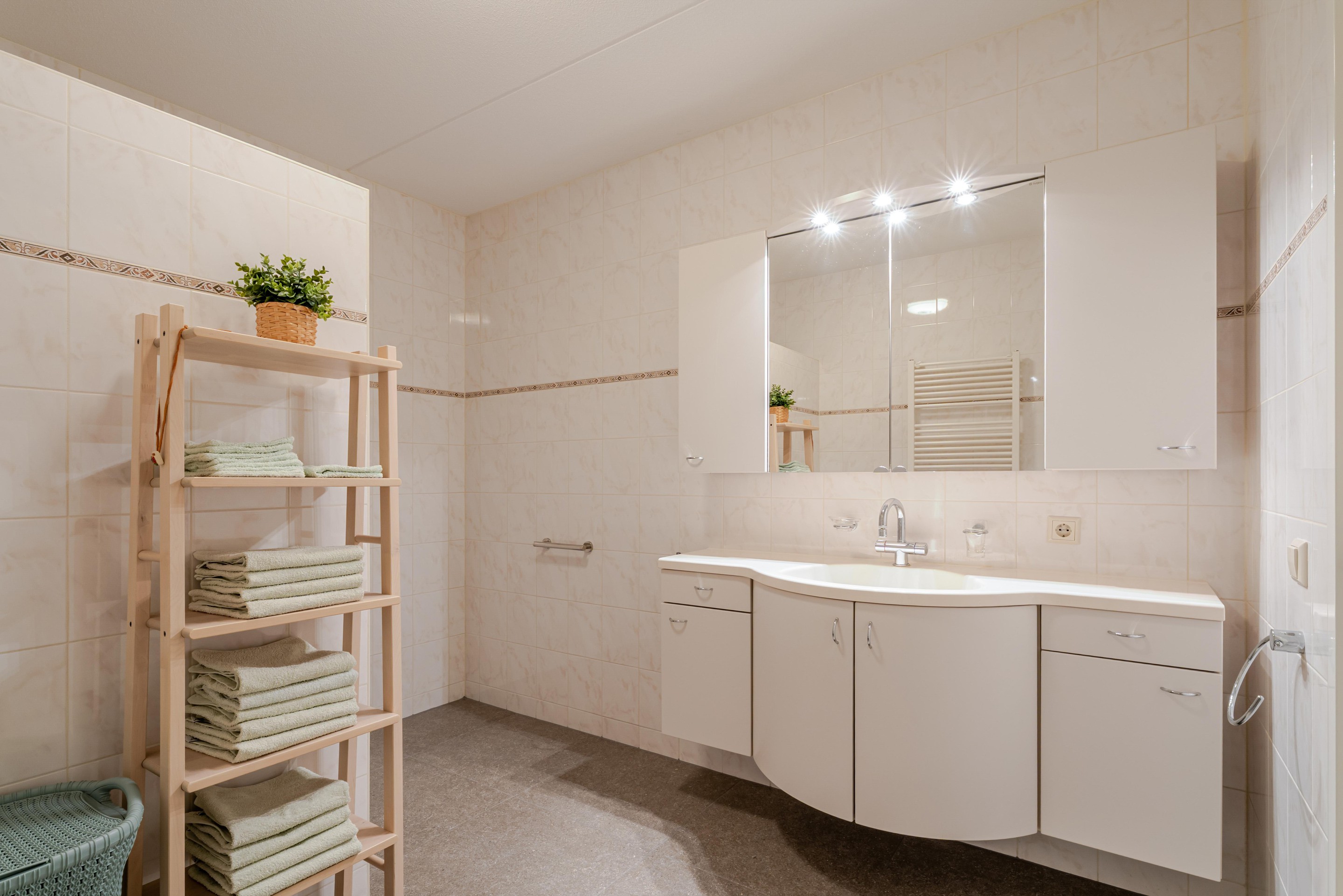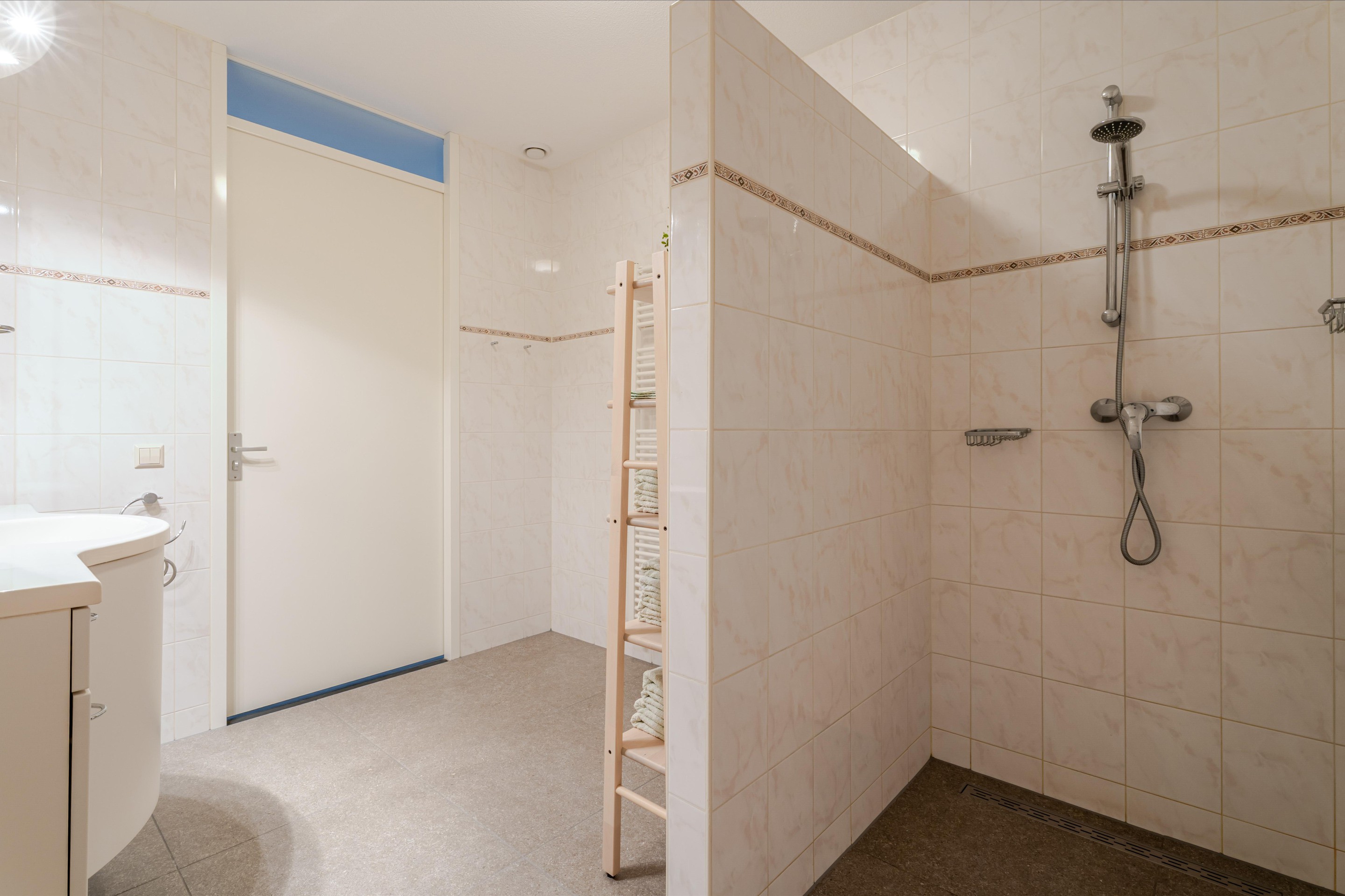 De badkamer is voorzien van een ruime inloopdouche, een wastafelmeubel met wastafel en een radiator.
