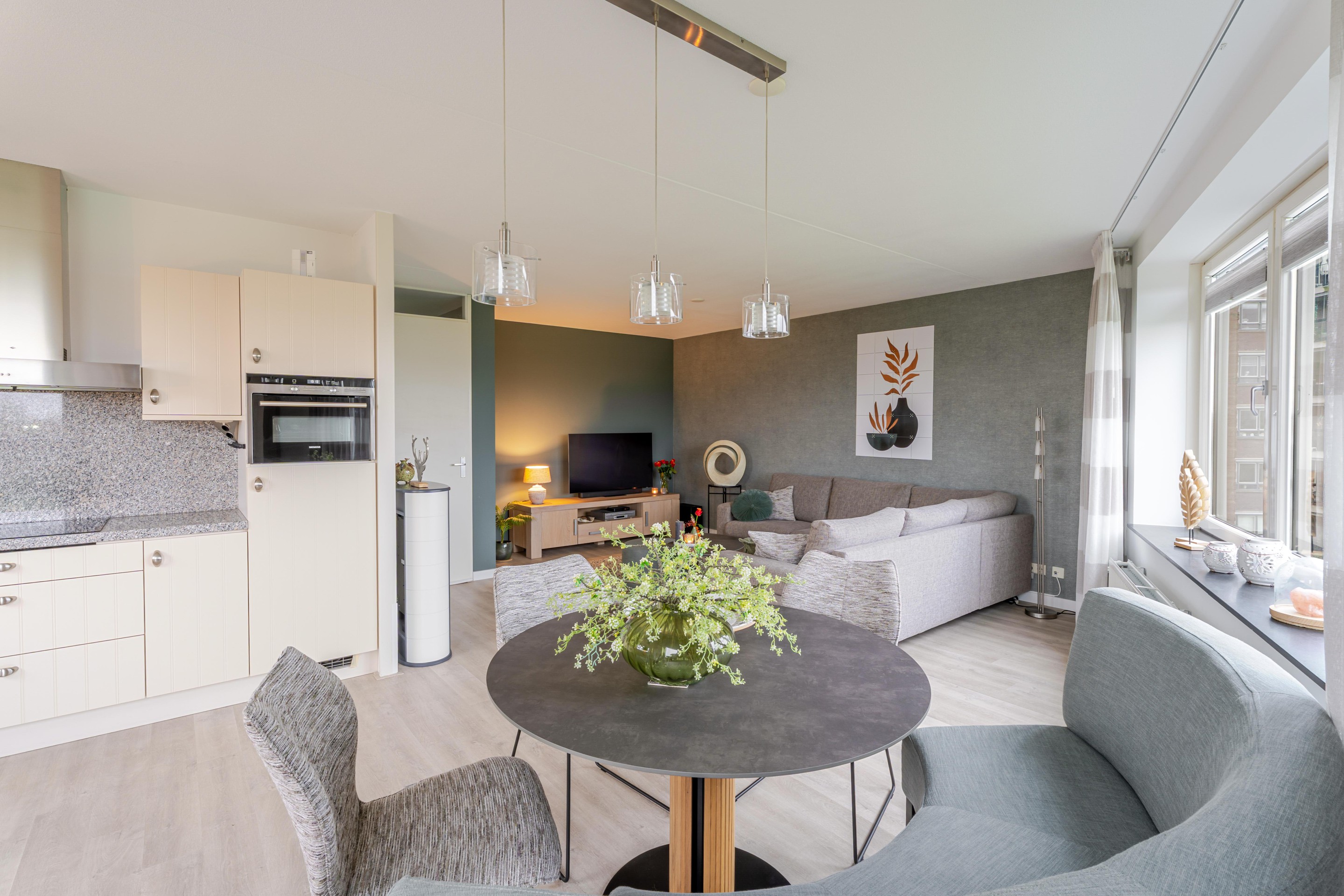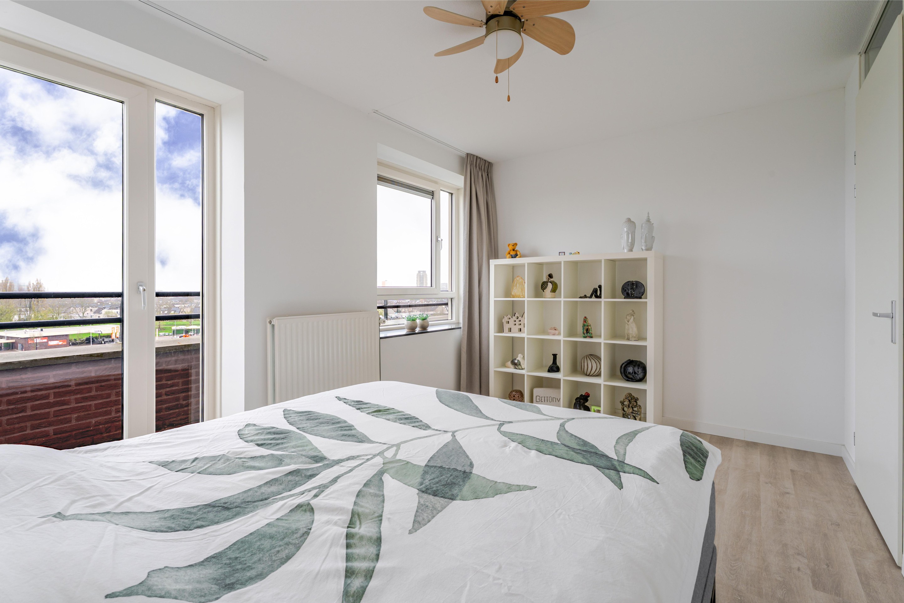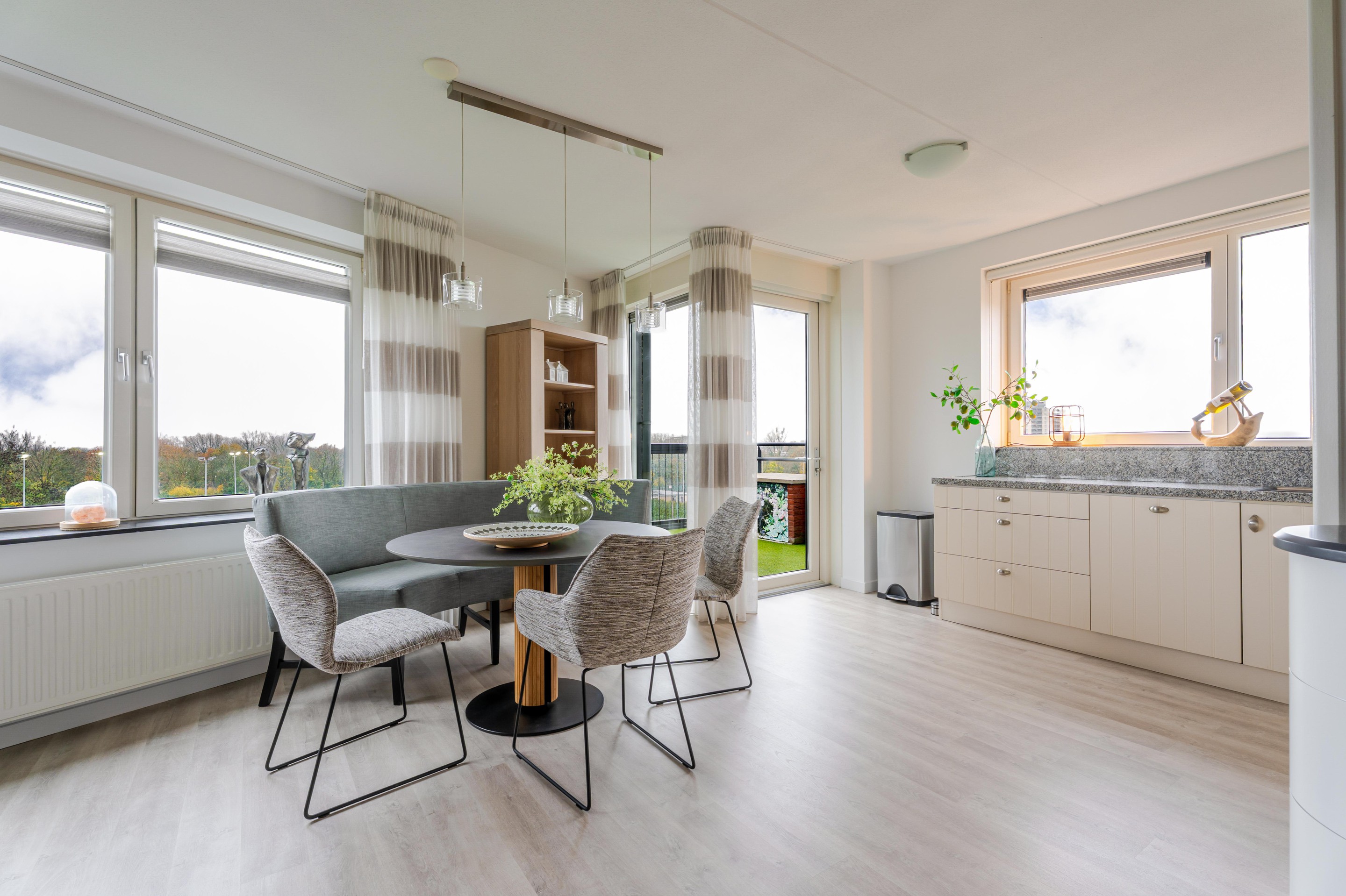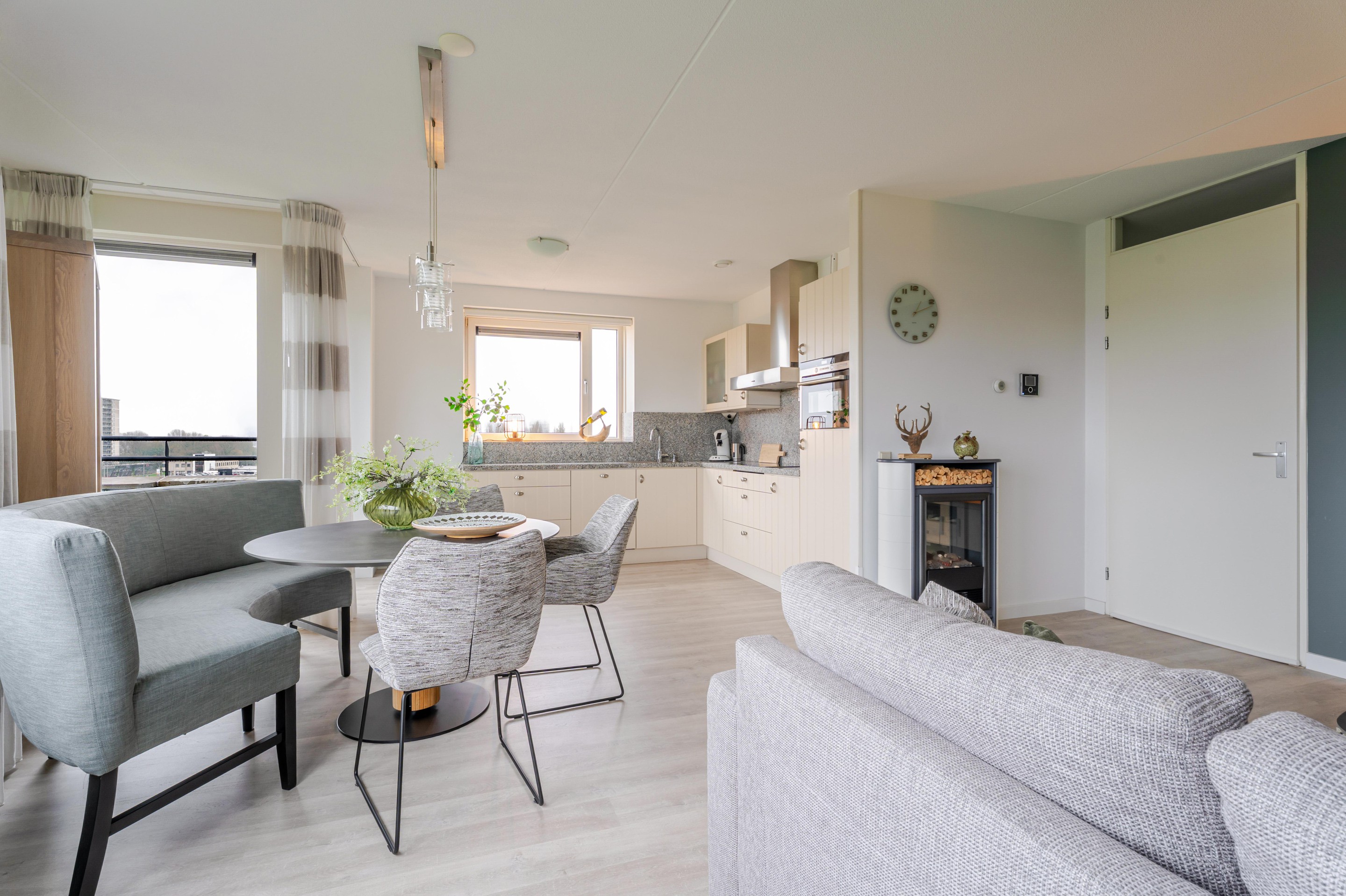 Het appartement heeft een doordachte indeling. De woonkamer is ruim opgezet en biedt dankzij de grote raampartijen volop daglicht. Vanuit hier stap je direct het brede balkon op, waar je werkelijk elk seizoen kunt genieten van rust en ruimte.