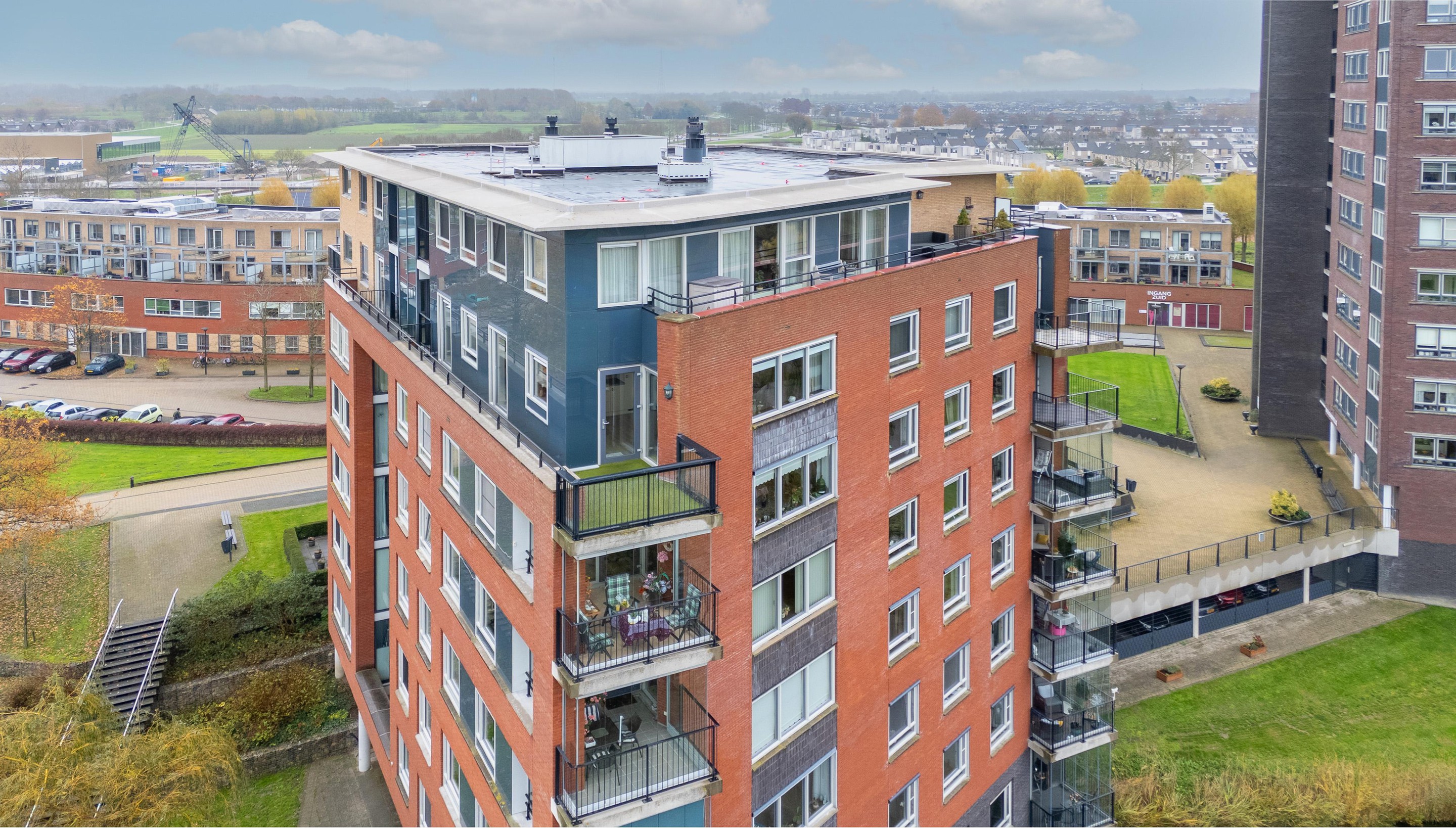 Via de deur in de keuken bereik je het zeer ruime balkon welke is gelegen over de gehele lengte van het appartement. Vanaf het ruime balkon geniet je in alle rust van een heerlijk, weids uitzicht over sportvelden, groen en water.