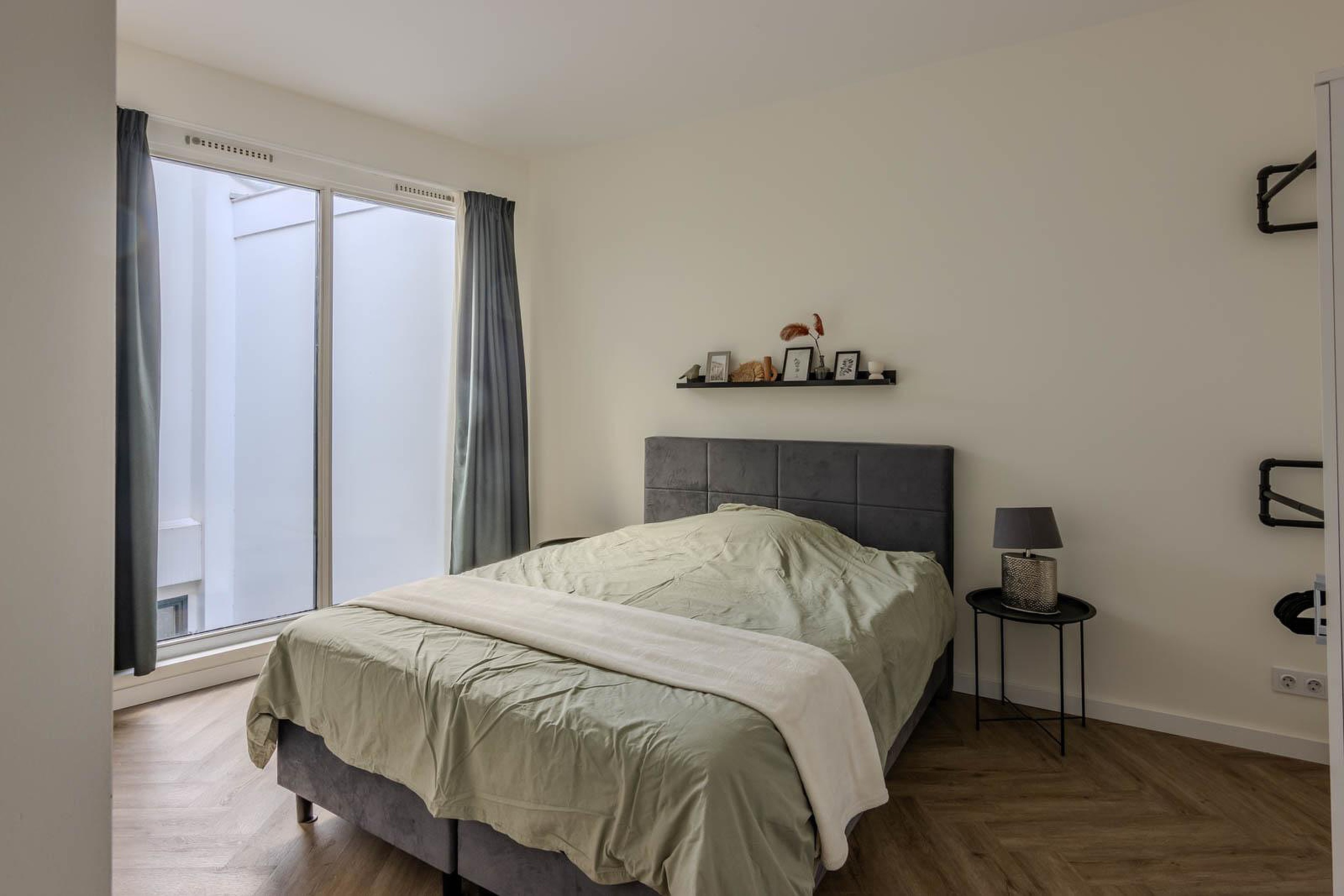 Via de hal bereik je de master bedroom. De royale slaapkamer is gelegen aan de achterzijde van het appartement en de grote raampartij met uitzicht op het balkon en de binnentuin zorgt voor een prettige lichtinval.
