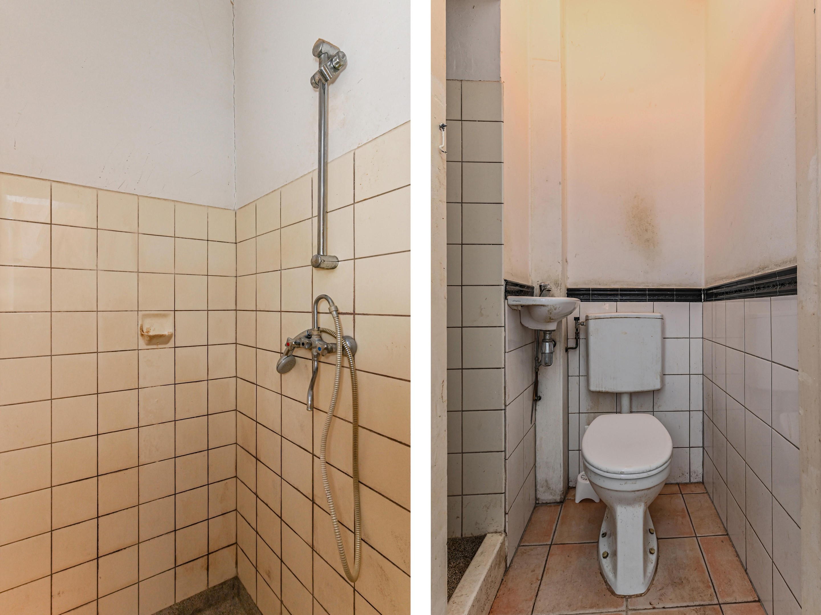 De badkamer (ca. 2,3 m2) is compact en voorzien van toilet en wastafel.