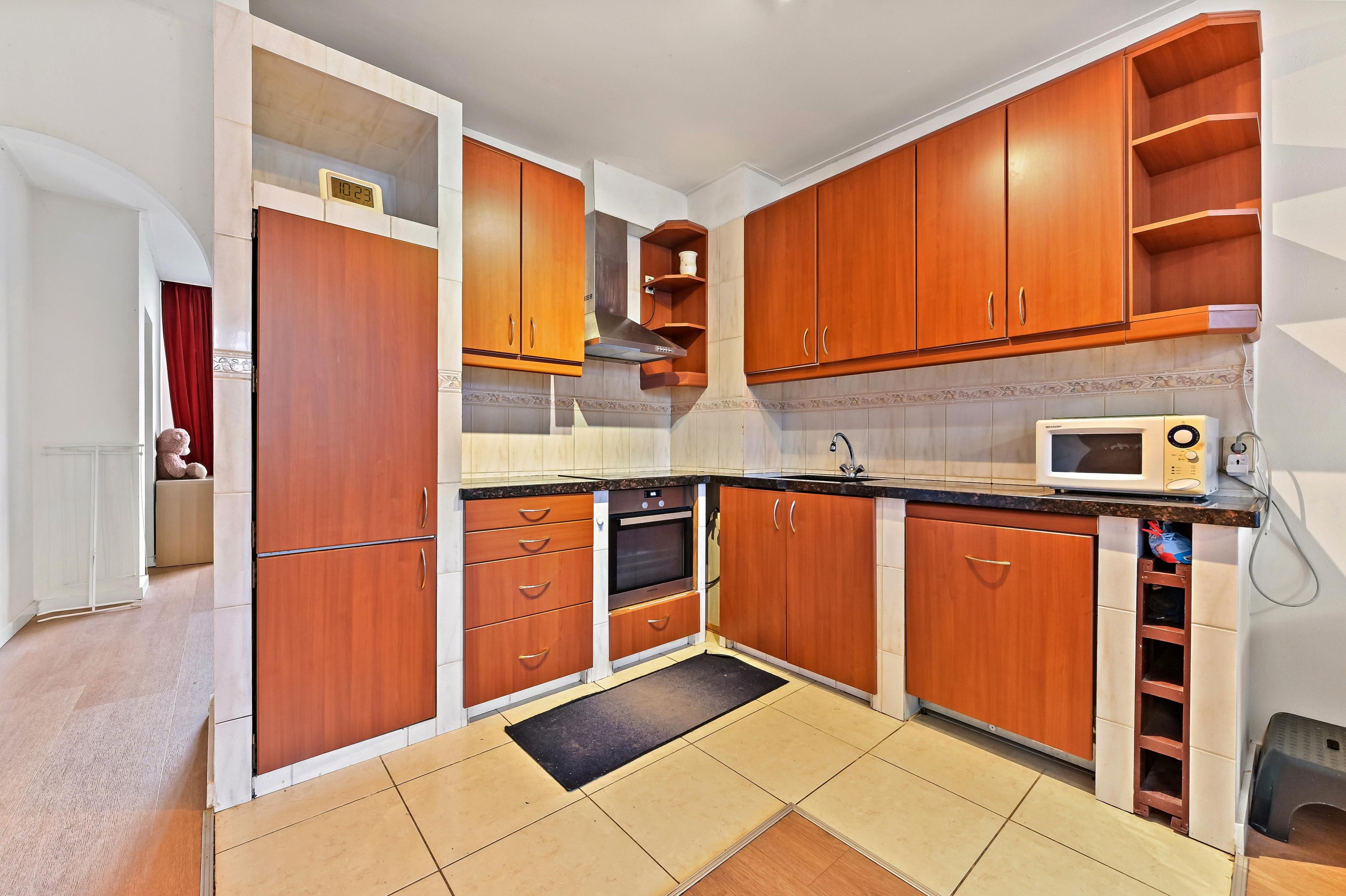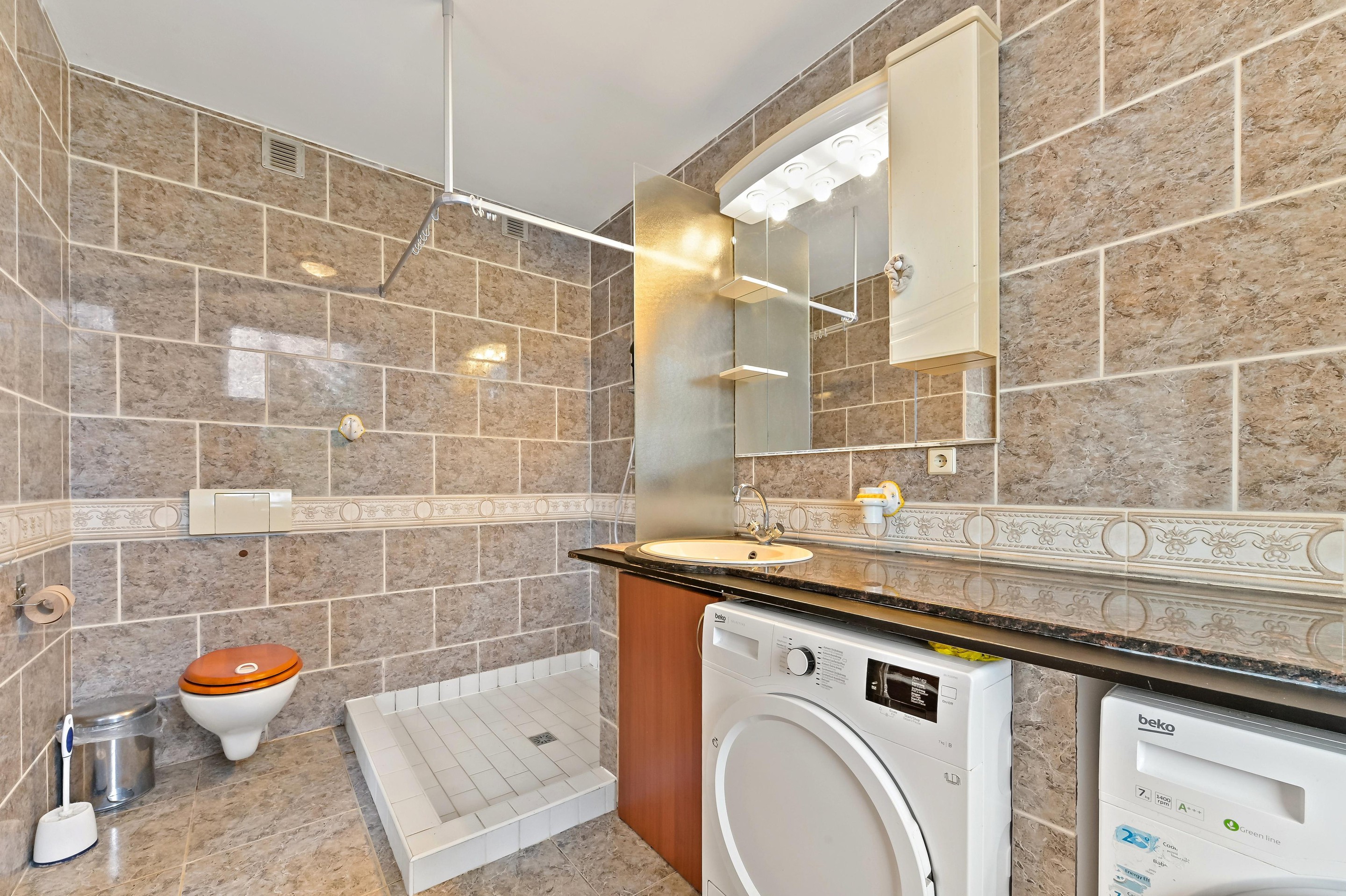 The bathroom is en-suite and finished with Spanish tiles. The space is equipped with a spacious walk-in shower, washbasin with cabinet, mirror cabinet, mechanical ventilation, washing machine and dryer. There is also a practical built-in wardrobe.