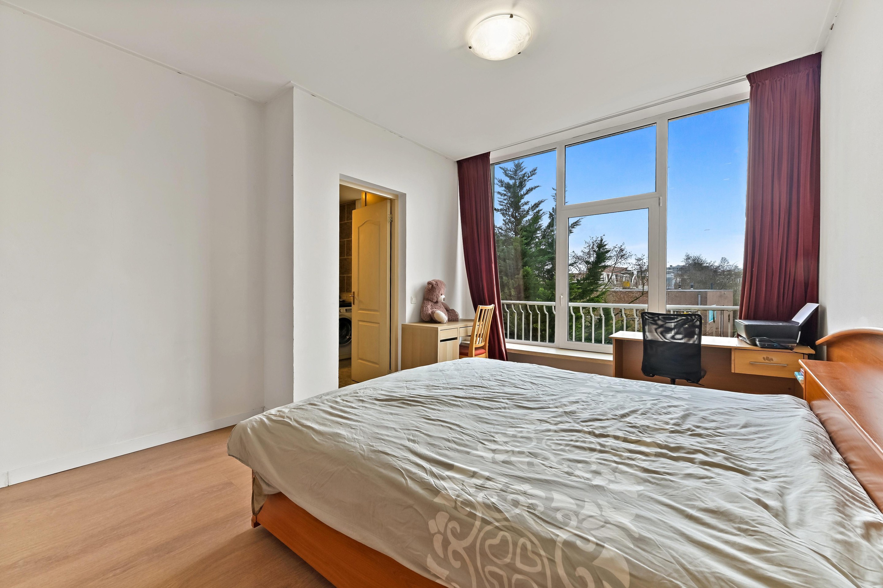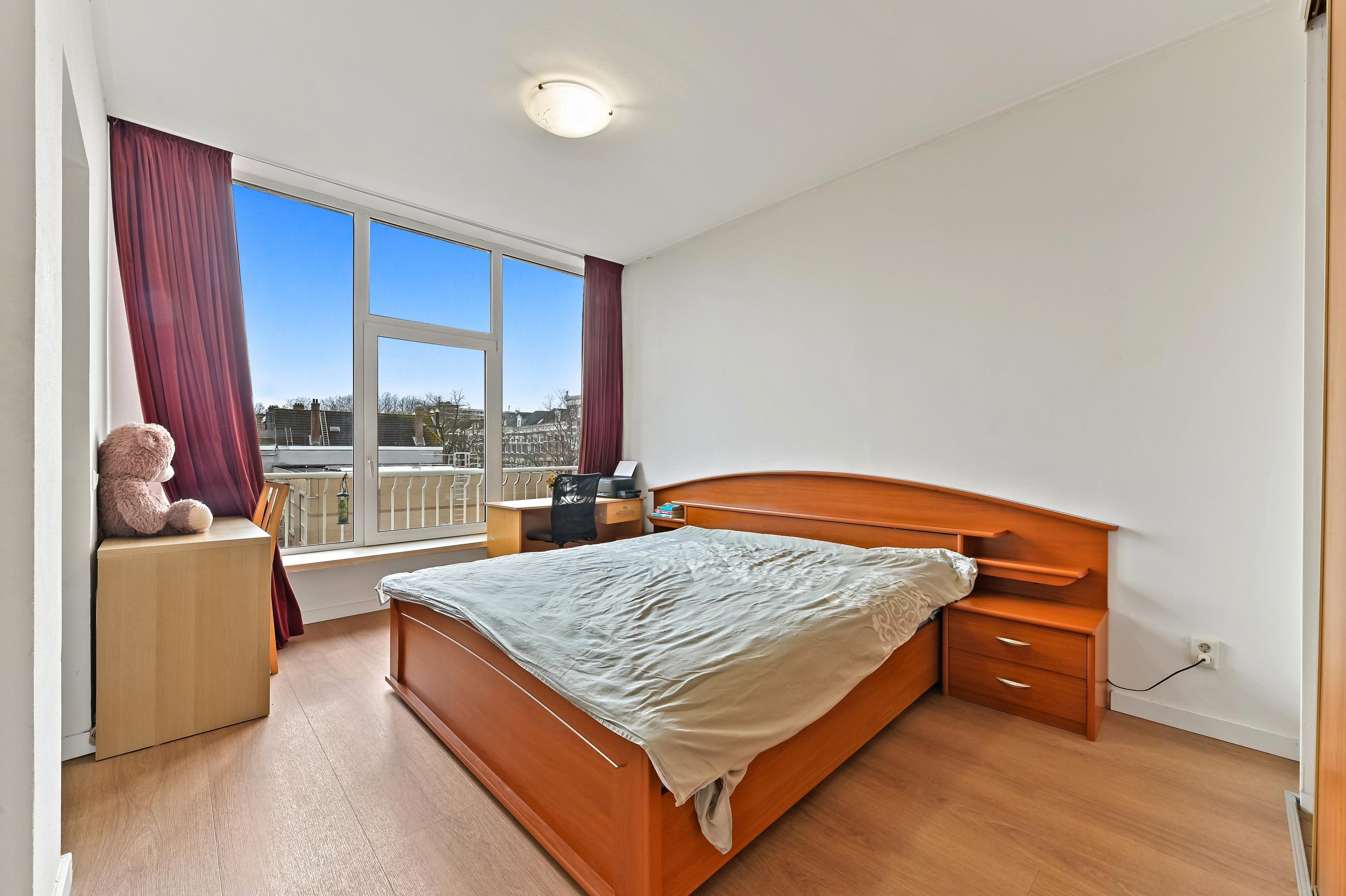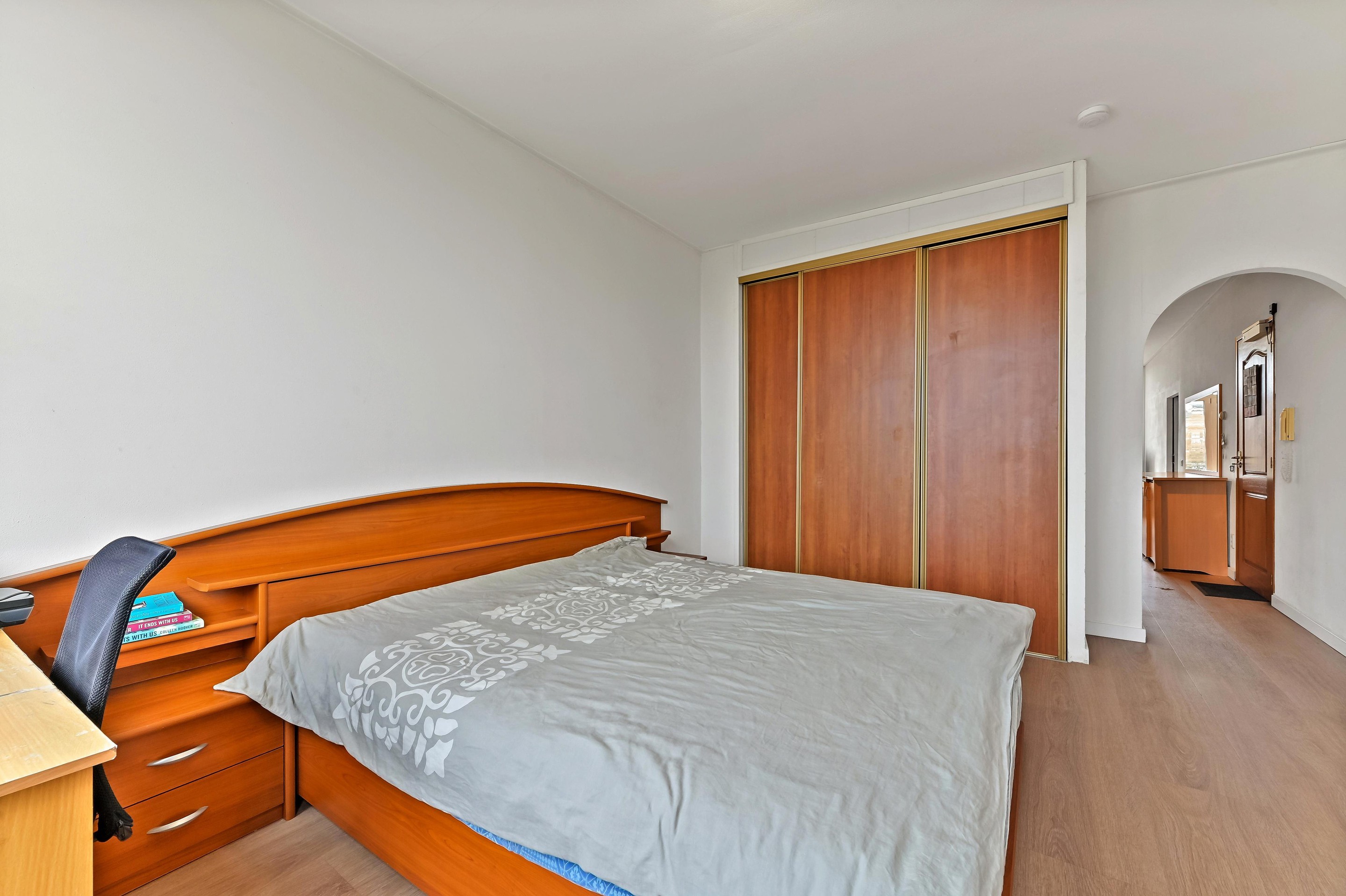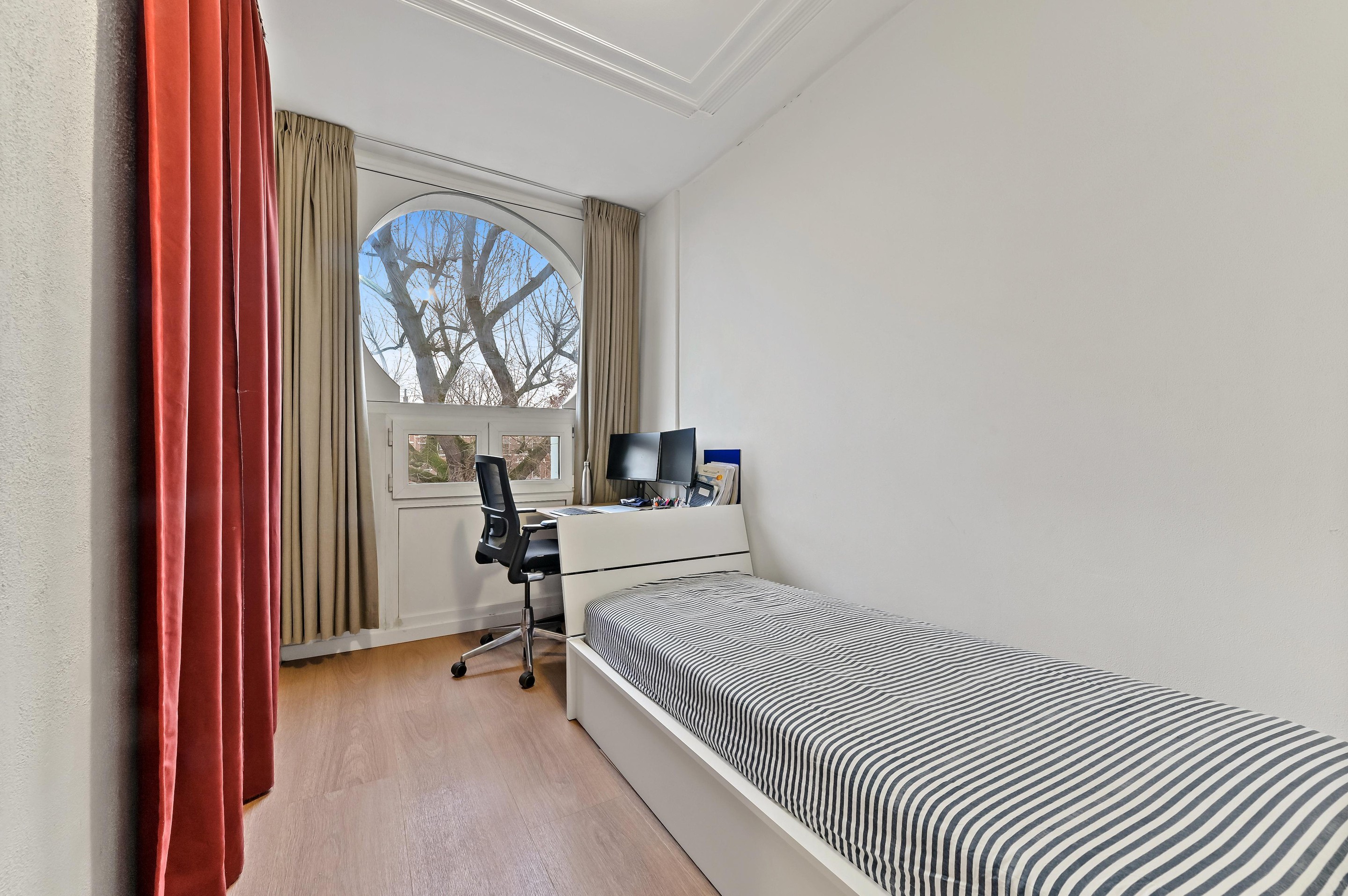 De tweede slaapkamer ligt aan de rustige achterzijde en biedt uitzicht op de binnentuinen. De kamer is ruim, heeft een inbouwkast en voelt door de lichte vloer en witte muren helder en rustig aan. Een charmante boogdoorgang geeft toegang tot de badkamer.