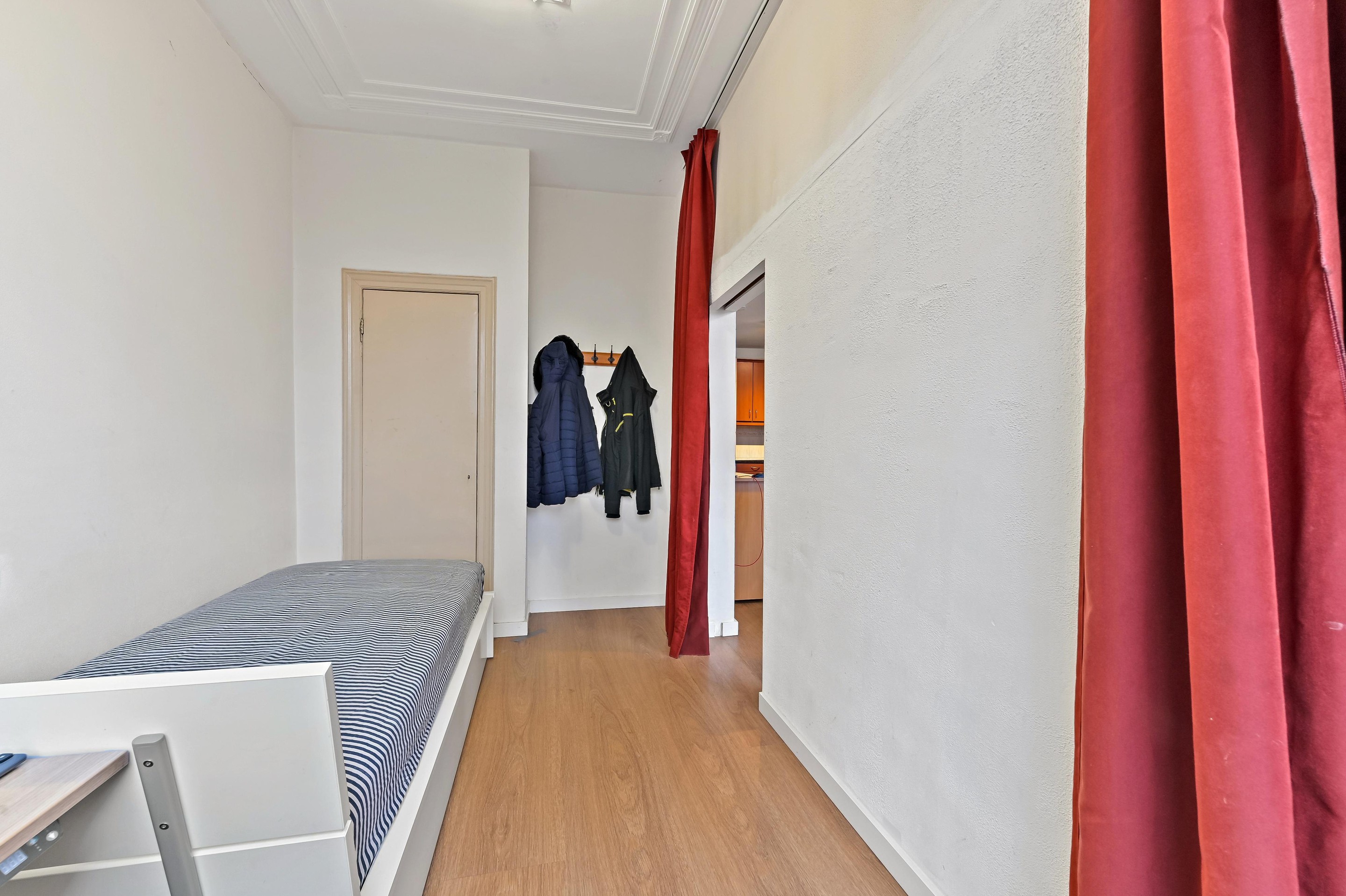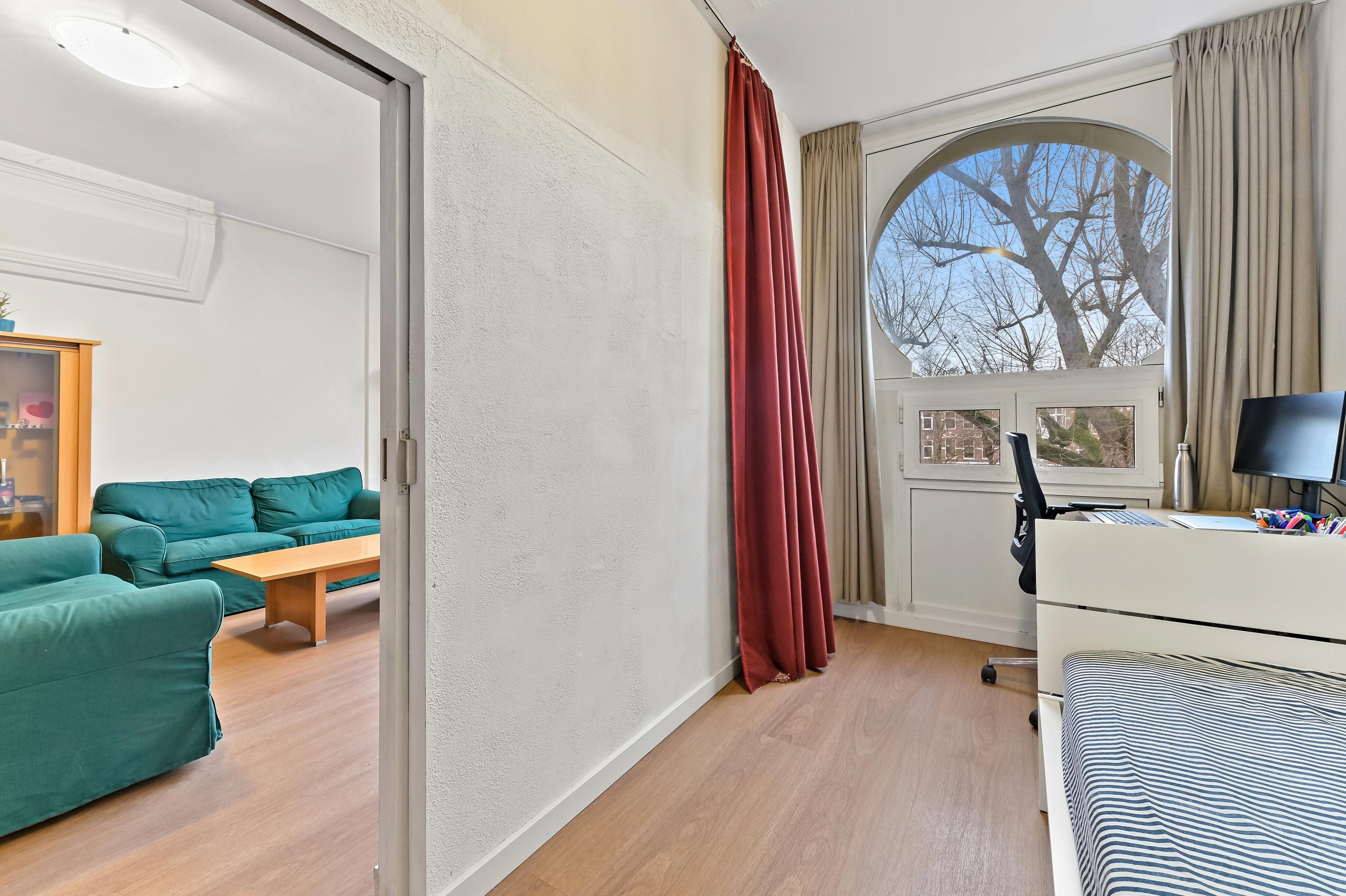 Grenzend aan de woonkamer ligt de eerste slaapkamer, voorzien van een schuifdeur en inbouwkast. Door het unieke raam valt veel licht binnen. De ruimte is smal maar functioneel en geschikt als eenpersoonskamer, werkkamer of kinderkamer.