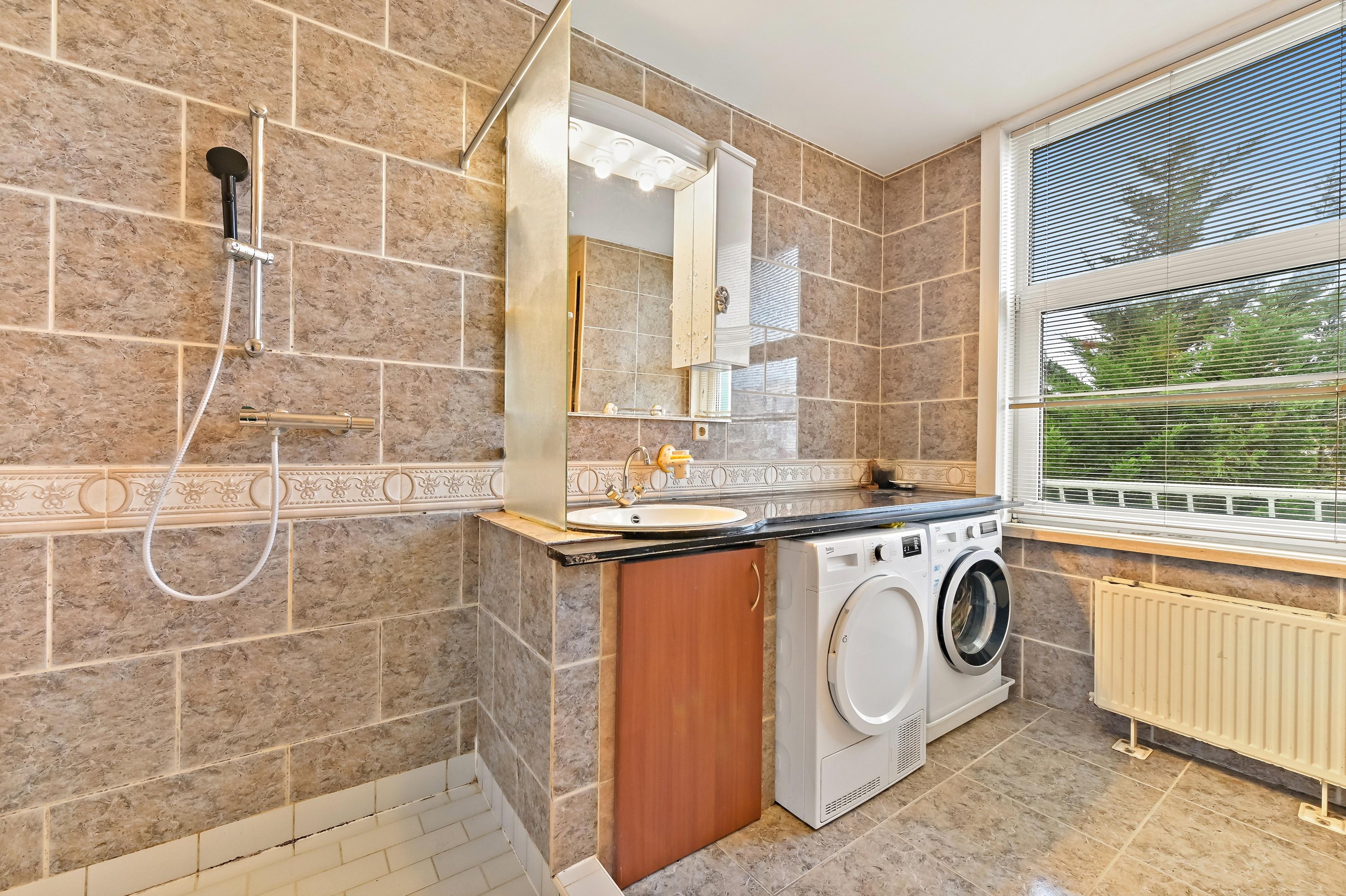 De badkamer is en-suite en afgewerkt met Spaanse tegels. De ruimte is voorzien van een ruime inloopdouche, wastafel met meubel, spiegelkast, mechanische ventilatie, wasmachine en droger. Daarnaast is er een praktische inbouwkast.