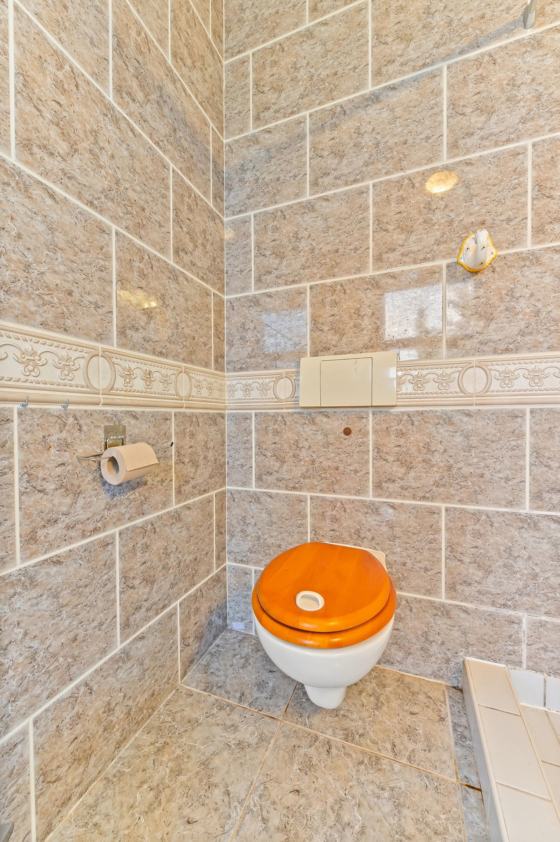 Het toilet is separaat gelegen en afgewerkt met dezelfde Spaanse tegels voor een nette, uniforme uitstraling.