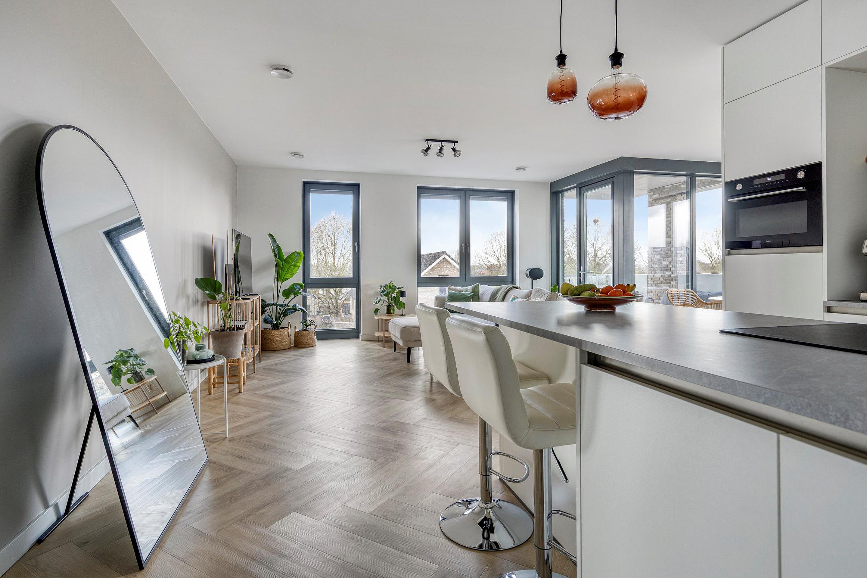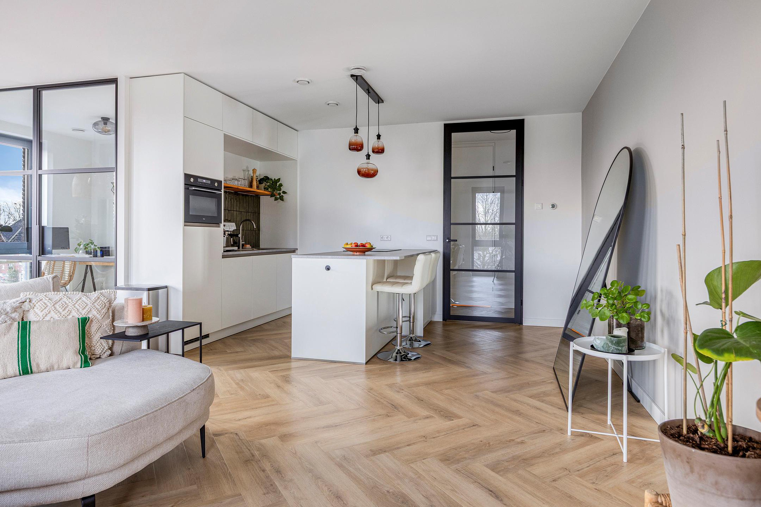 Bij binnenkomst valt direct de open leefruimte op waarin keuken en woonkamer naadloos in elkaar overlopen. De ruimte is licht dankzij de grote raampartijen rondom en biedt voldoende plaats voor zowel een zithoek als een eettafel. De afwerking is rustig en verzorgd, met zwarte stalen accenten die het interieur een moderne uitstraling geven. Door het hele appartement ligt een visgraat PVC-vloer die zorgt voor een stijlvol en samenhangend geheel. De keuken bevindt zich direct bij binnenkomst en vormt een vanzelfsprekend onderdeel van de leefruimte. Centraal staat het kookeiland met bar, waardoor koken en wonen prettig samenkomen. In het eiland is een inductiekookplaat met geïntegreerde afzuiging verwerkt, wat bijdraagt aan het strakke lijnenspel. De keuken beschikt over veel kastruimte, diverse inbouwapparatuur en is uitgevoerd in materialen en kleuren die mooi op elkaar zijn afgestemd.