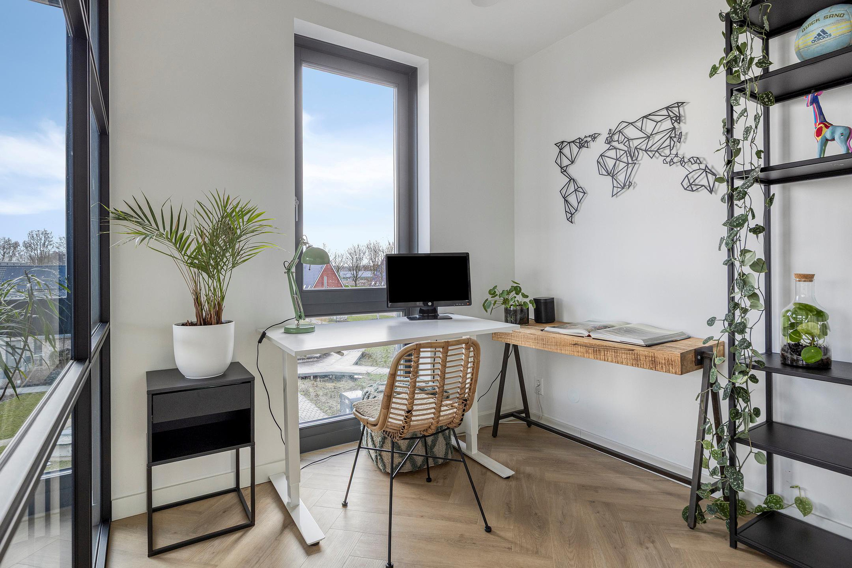 Aansluitend aan de woonkamer ligt een extra kamer die momenteel in gebruik is als werkruimte. Deze is afgescheiden met een glazen wand in zwart stalen frame, waardoor het licht vrij door de ruimte blijft stromen en er toch een aparte kamer ontstaat. De ruimte kan desgewenst eenvoudig worden ingericht als tweede slaapkamer.