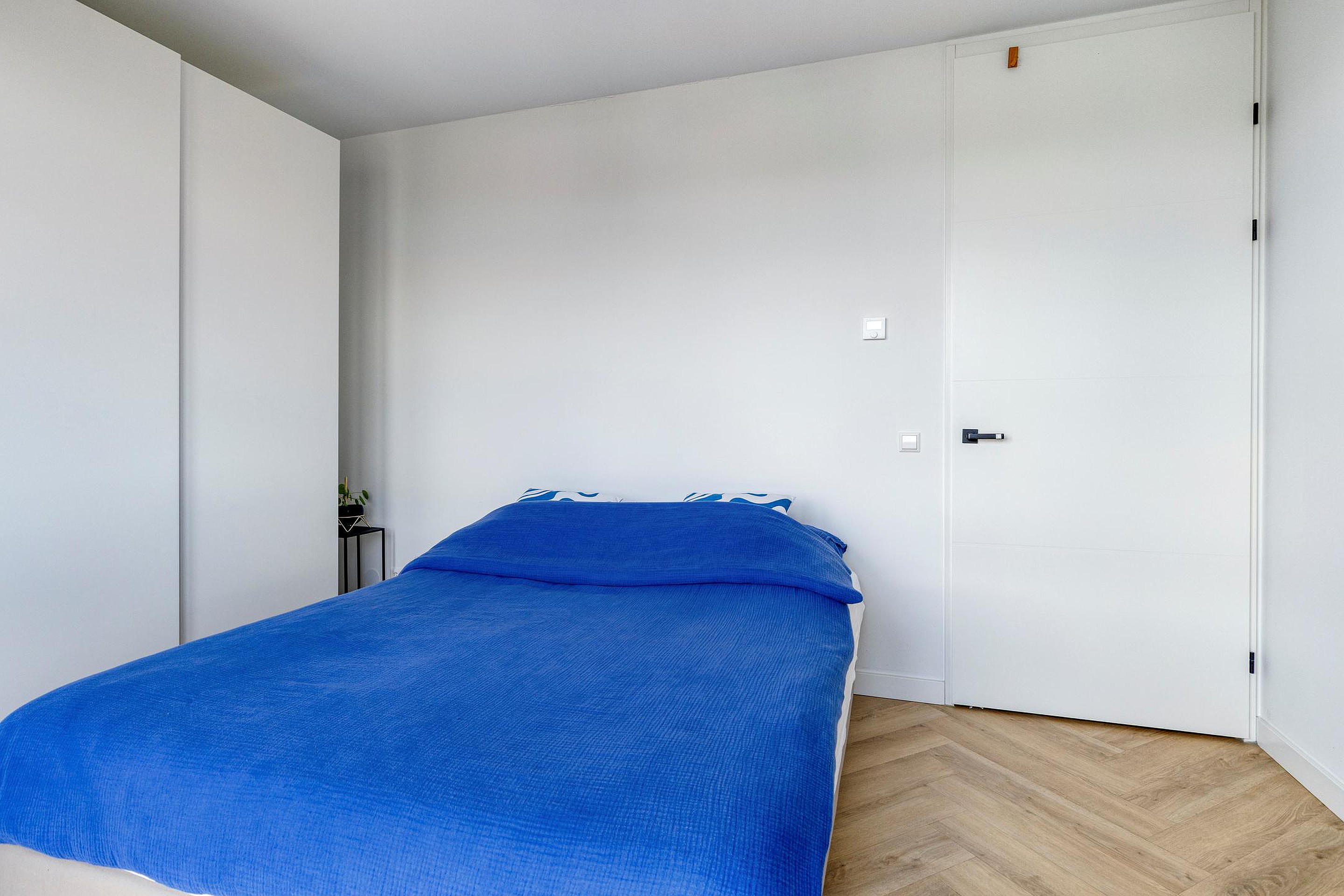 De slaapkamer is rustig gelegen en heeft een prettige lichtinval. De indeling is praktisch en biedt voldoende ruimte voor een tweepersoonsbed en kastruimte.