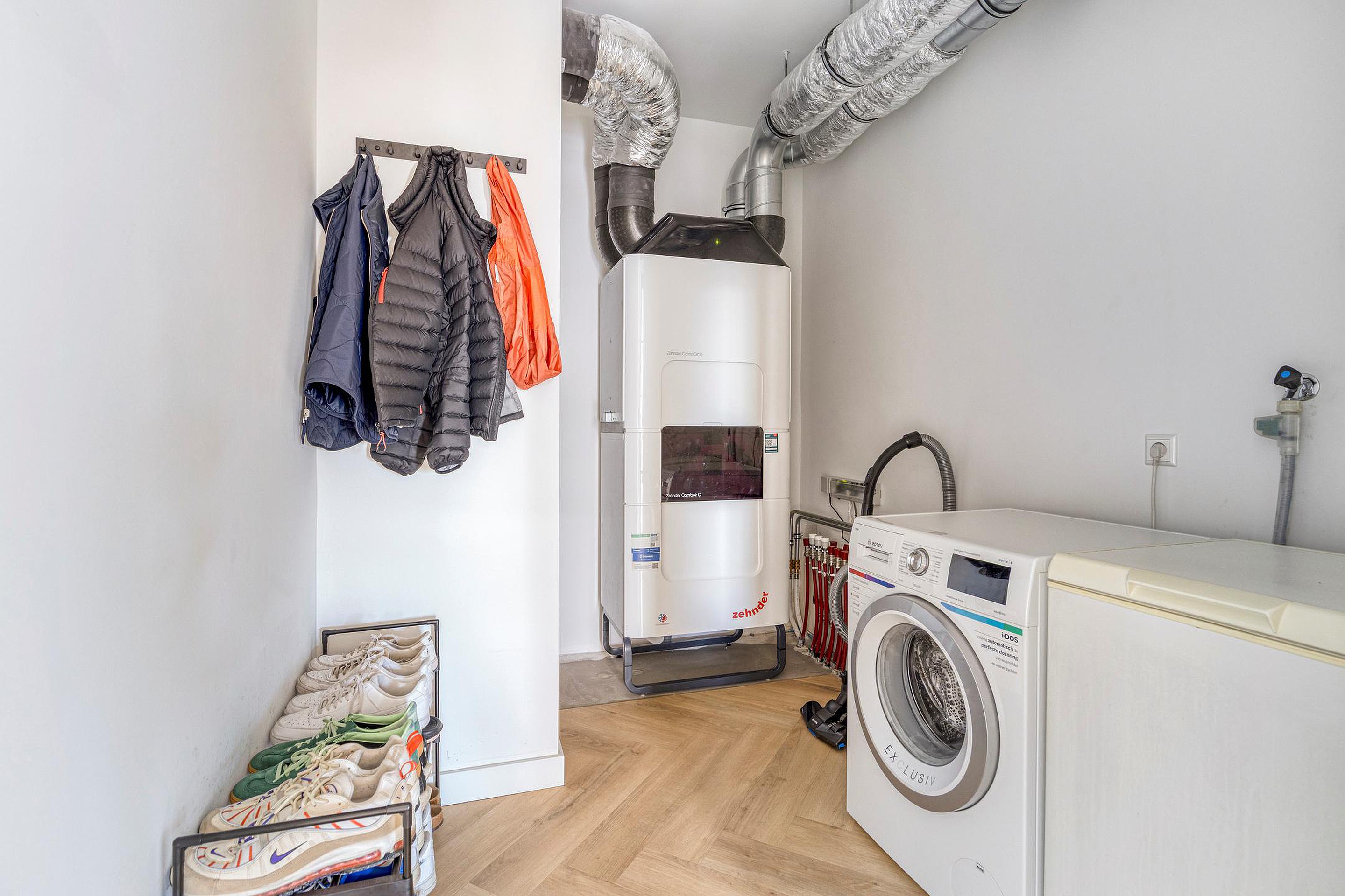 In de hal bevindt zich een praktische berg- en installatieruimte met aansluitingen voor wasmachine en droger en extra plaats voor opslag of een vriezer. Hier is ook de ventilatie-installatie opgesteld.