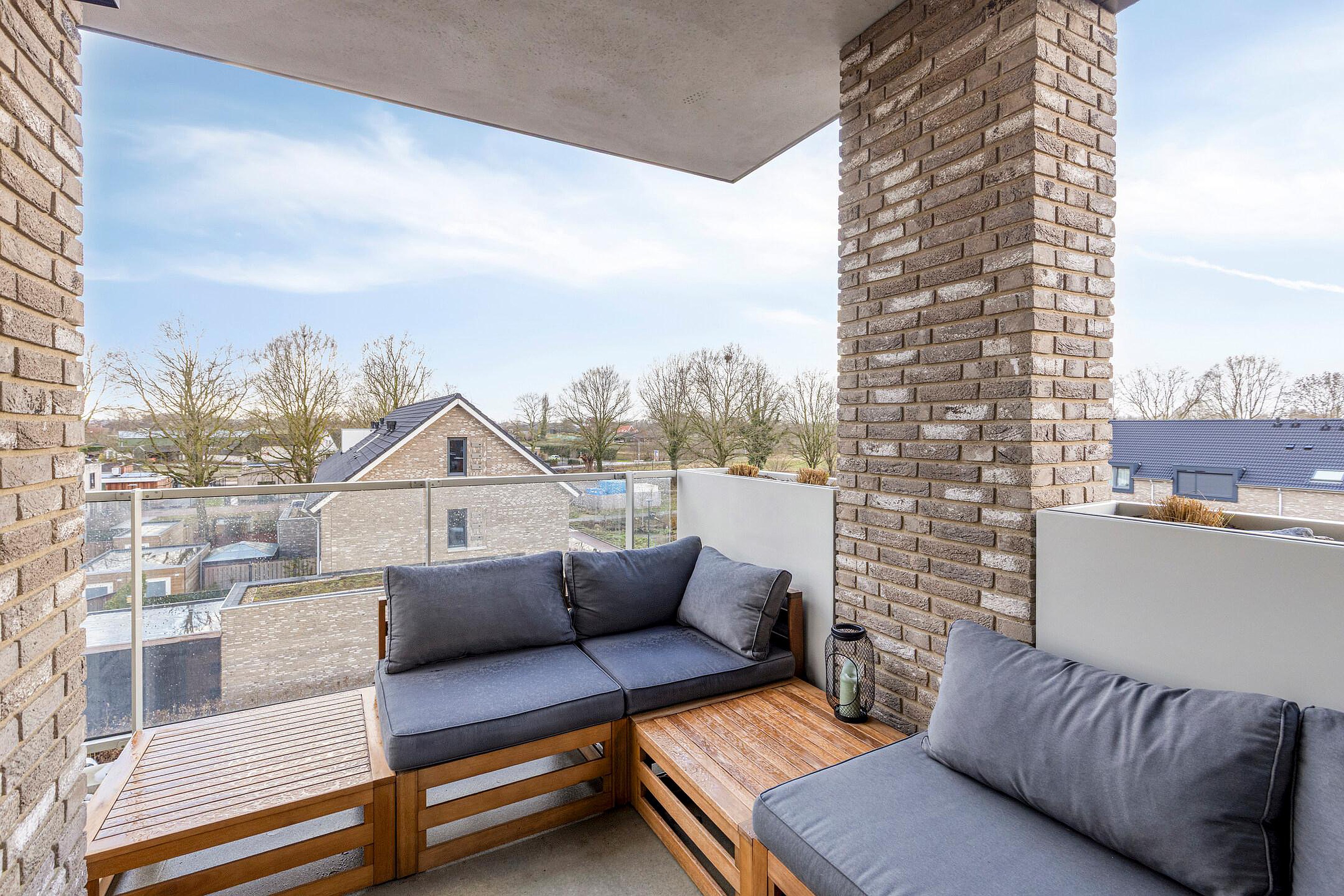 Het balkon ligt op het westen en is bereikbaar vanuit de woonkamer. Hier kun je vanaf de late ochtend tot in de avond van de zon genieten.