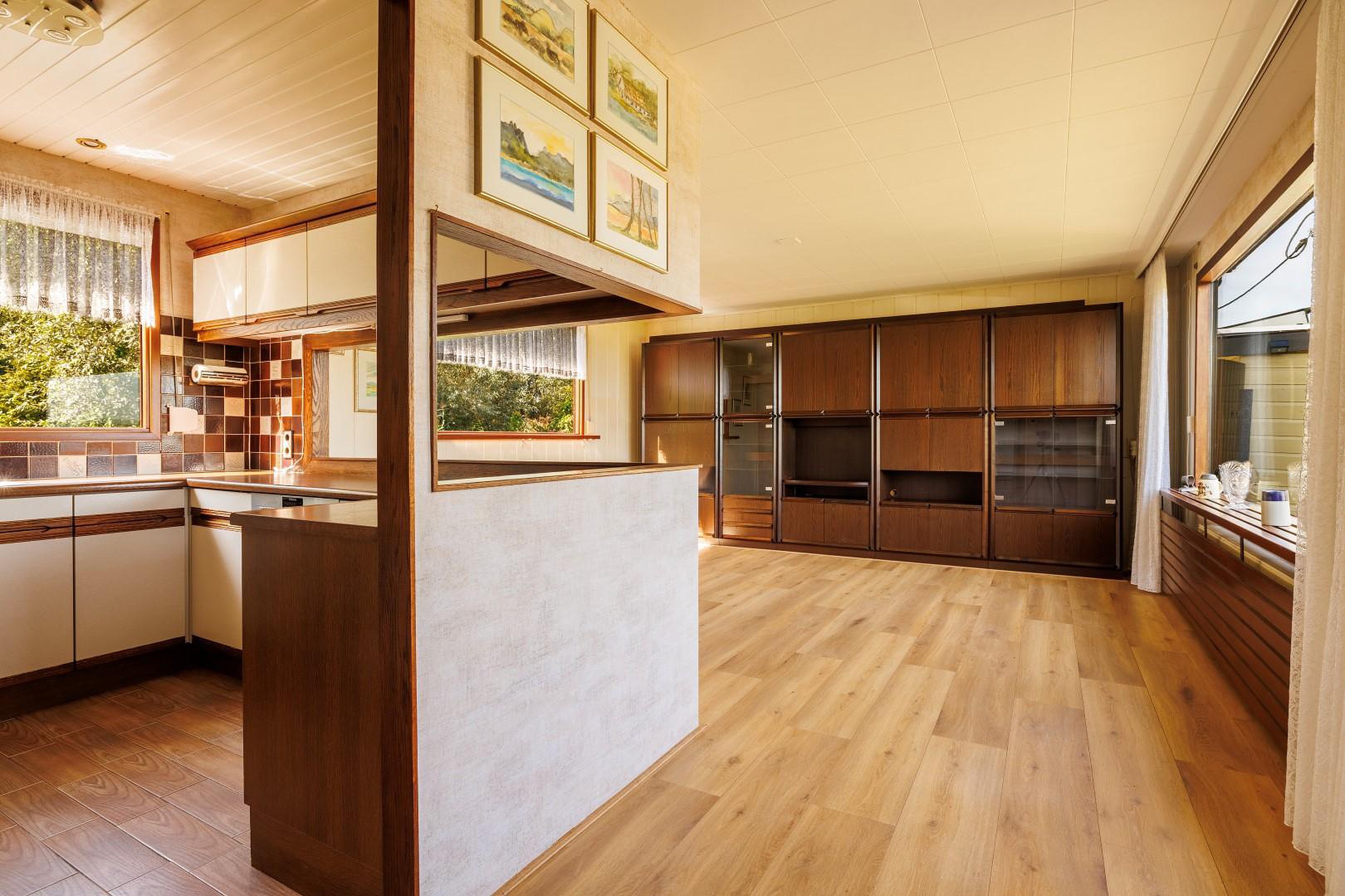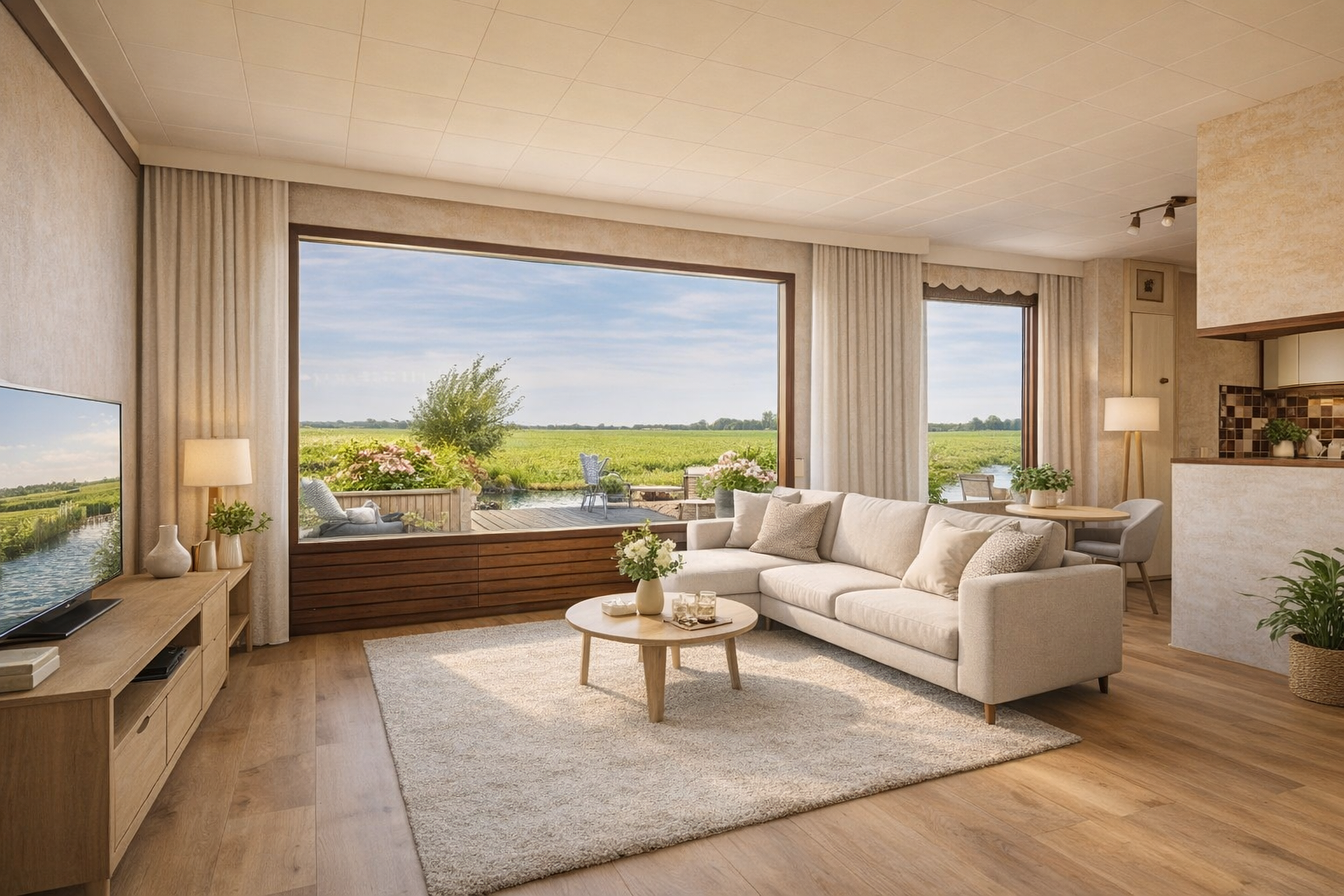 De woonkamer met open U-vormige keuken vormt het hart van de woning. Vanuit hier geniet u van een geweldig en vrij uitzicht over de landerijen. Dit uitzicht verveelt nooit: elke dag een nieuw schilderij!