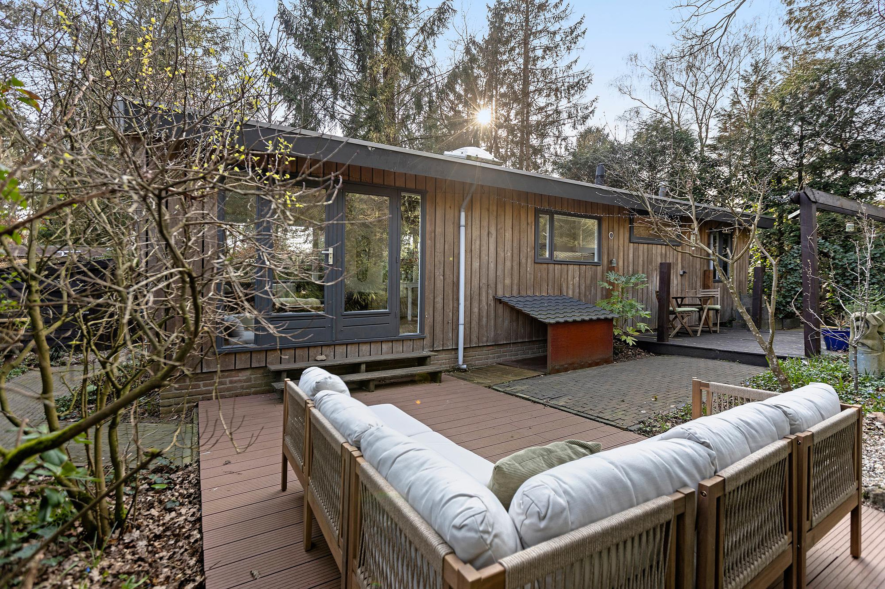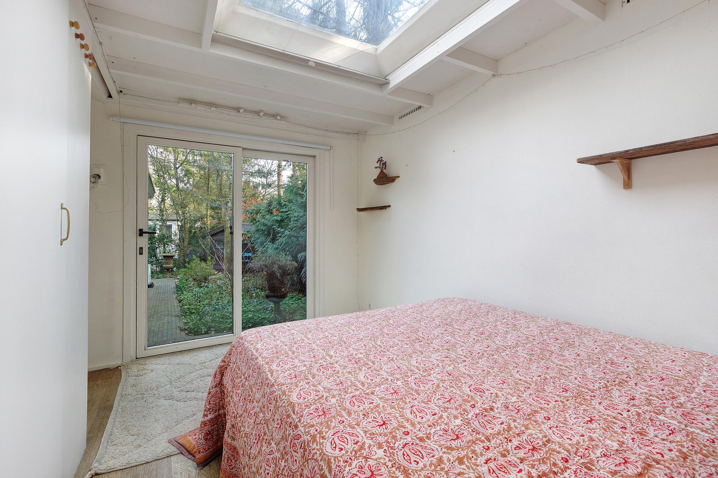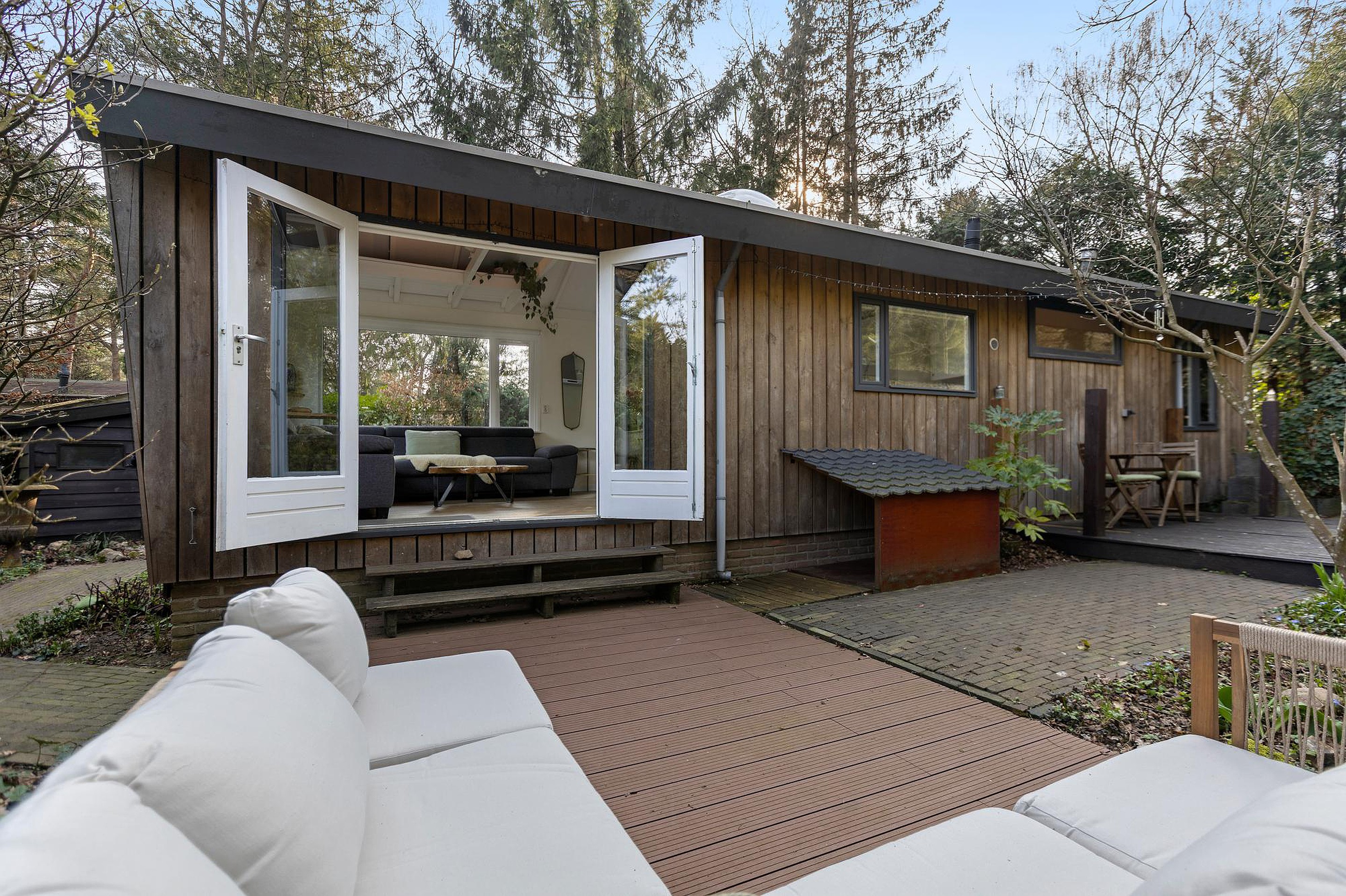 Vanuit zowel de woonkamer als één van de slaapkamers zorgen openslaande deuren voor een directe verbinding met buiten. De woonkamer geeft toegang tot een sfeervol terras op een vlonder, terwijl je vanuit de slaapkamer zo de tuin in loopt en geniet van een vrij en groen uitzicht. Dit alles maakt de tuin tot een rustige, comfortabele en veelzijdige buitenruimte die perfect aansluit bij het recreatieve karakter van de woning.