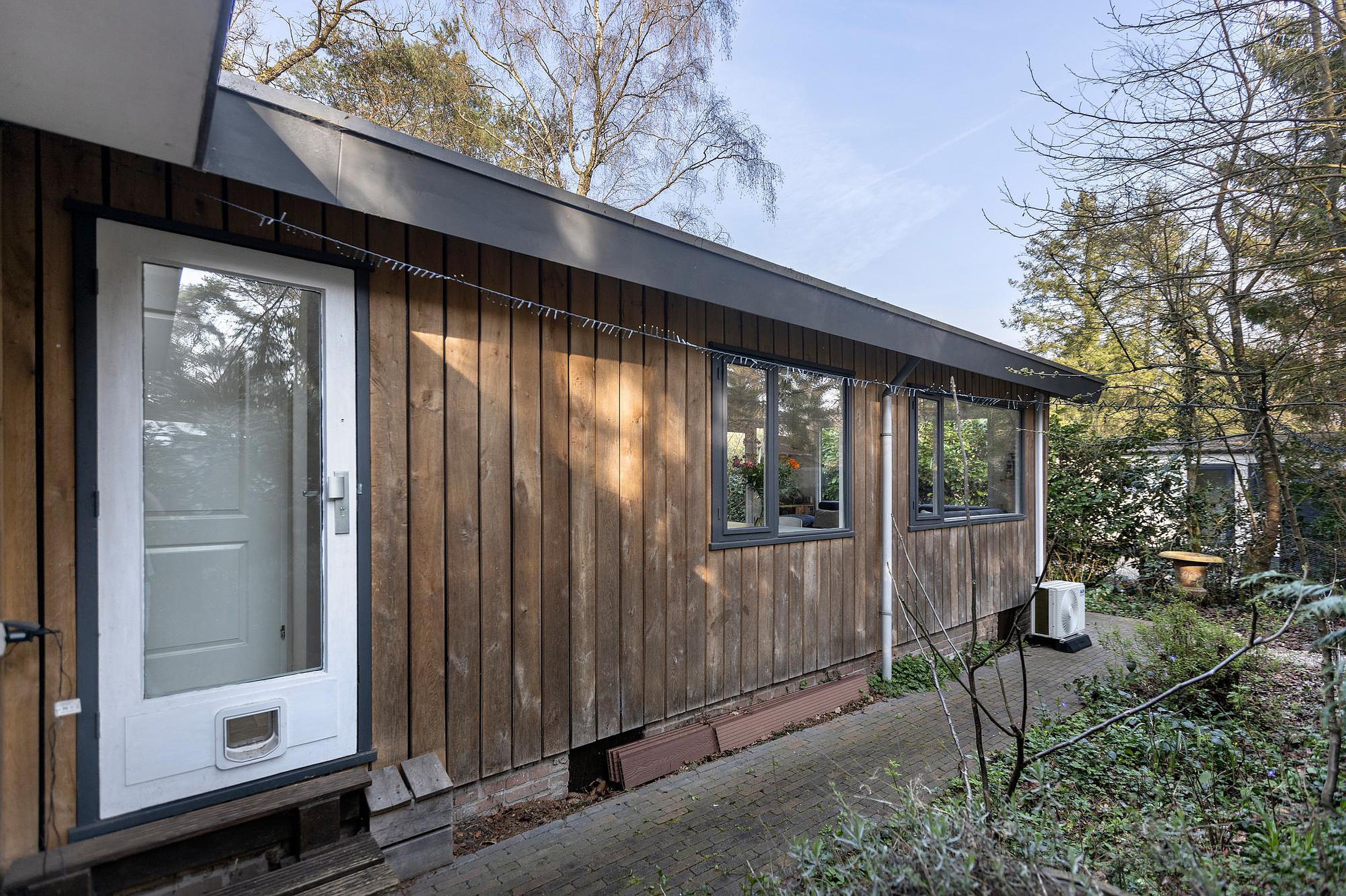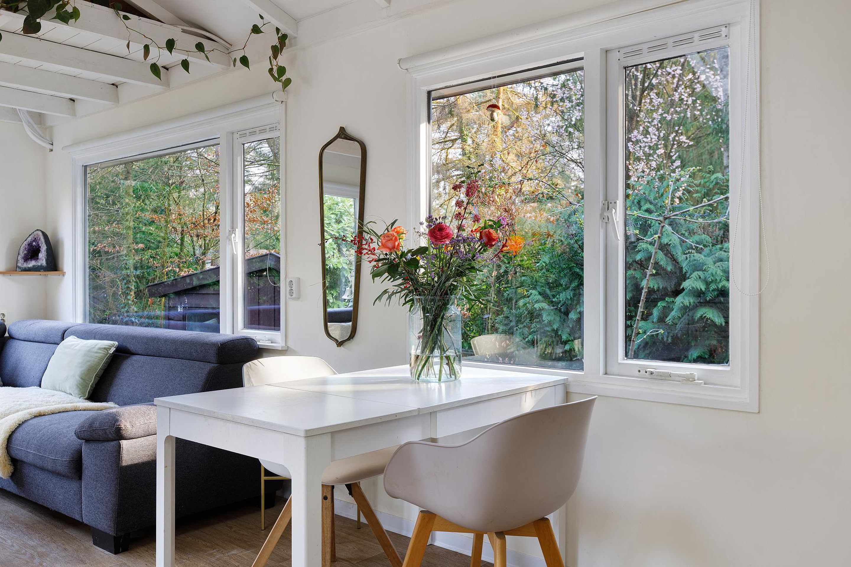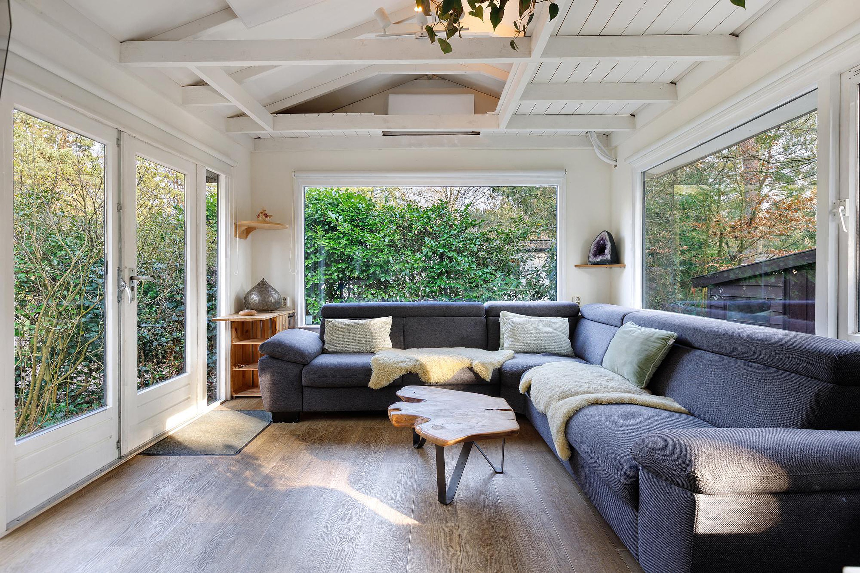 Vanuit zowel de woonkamer als één van de slaapkamers zorgen openslaande deuren voor een directe verbinding met buiten. De woonkamer geeft toegang tot een sfeervol terras op een vlonder, terwijl je vanuit de slaapkamer zo de tuin in loopt en geniet van een vrij en groen uitzicht. Dit alles maakt de tuin tot een rustige, comfortabele en veelzijdige buitenruimte die perfect aansluit bij het recreatieve karakter van de woning.