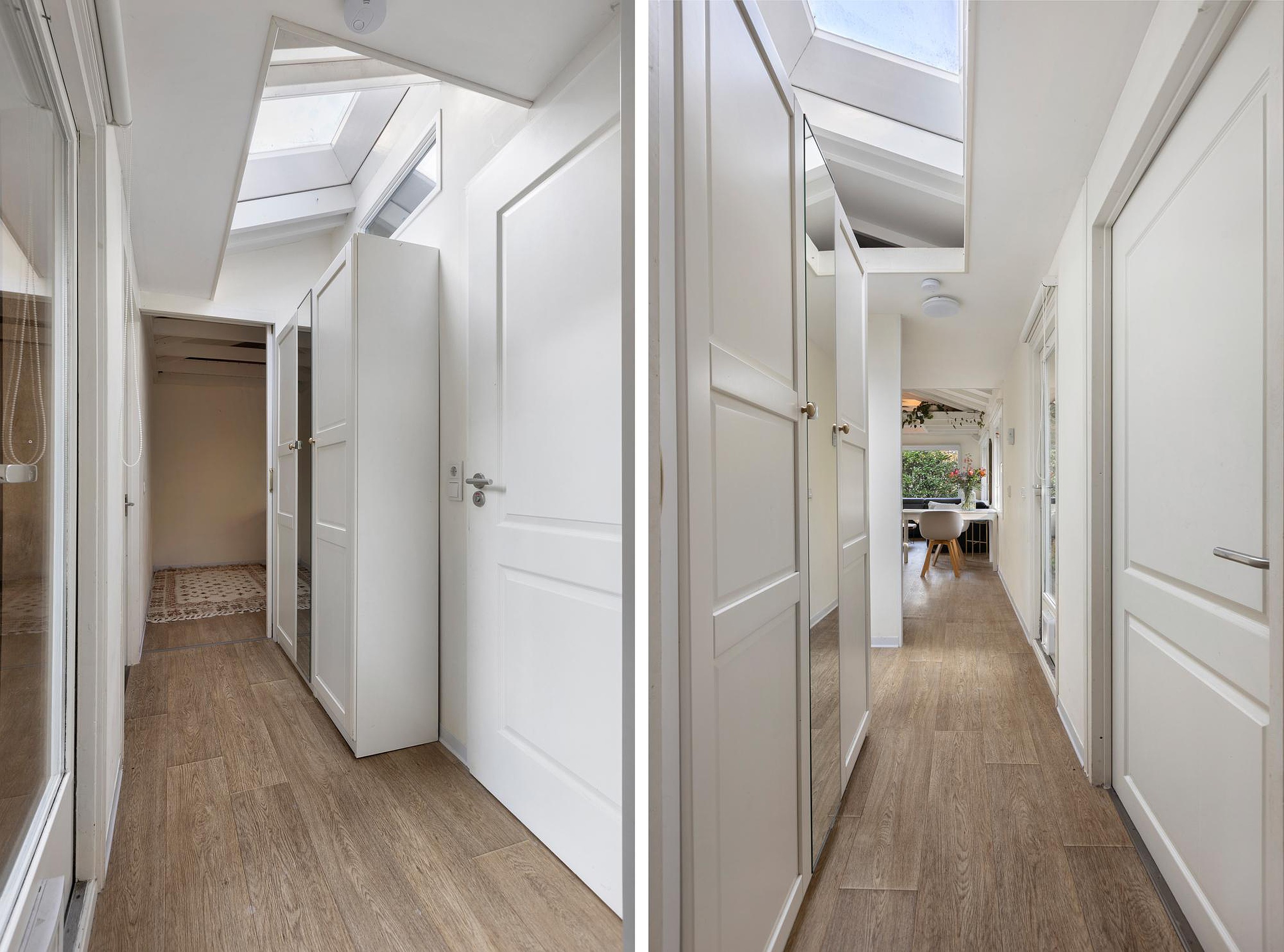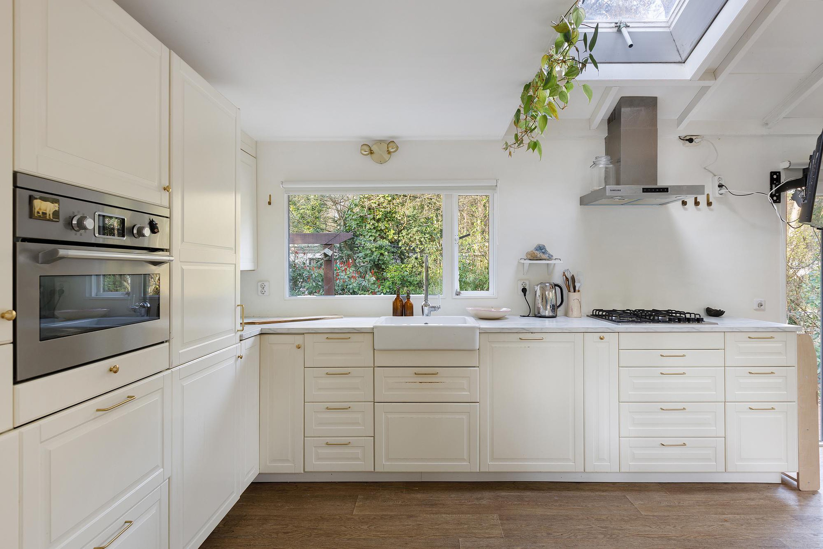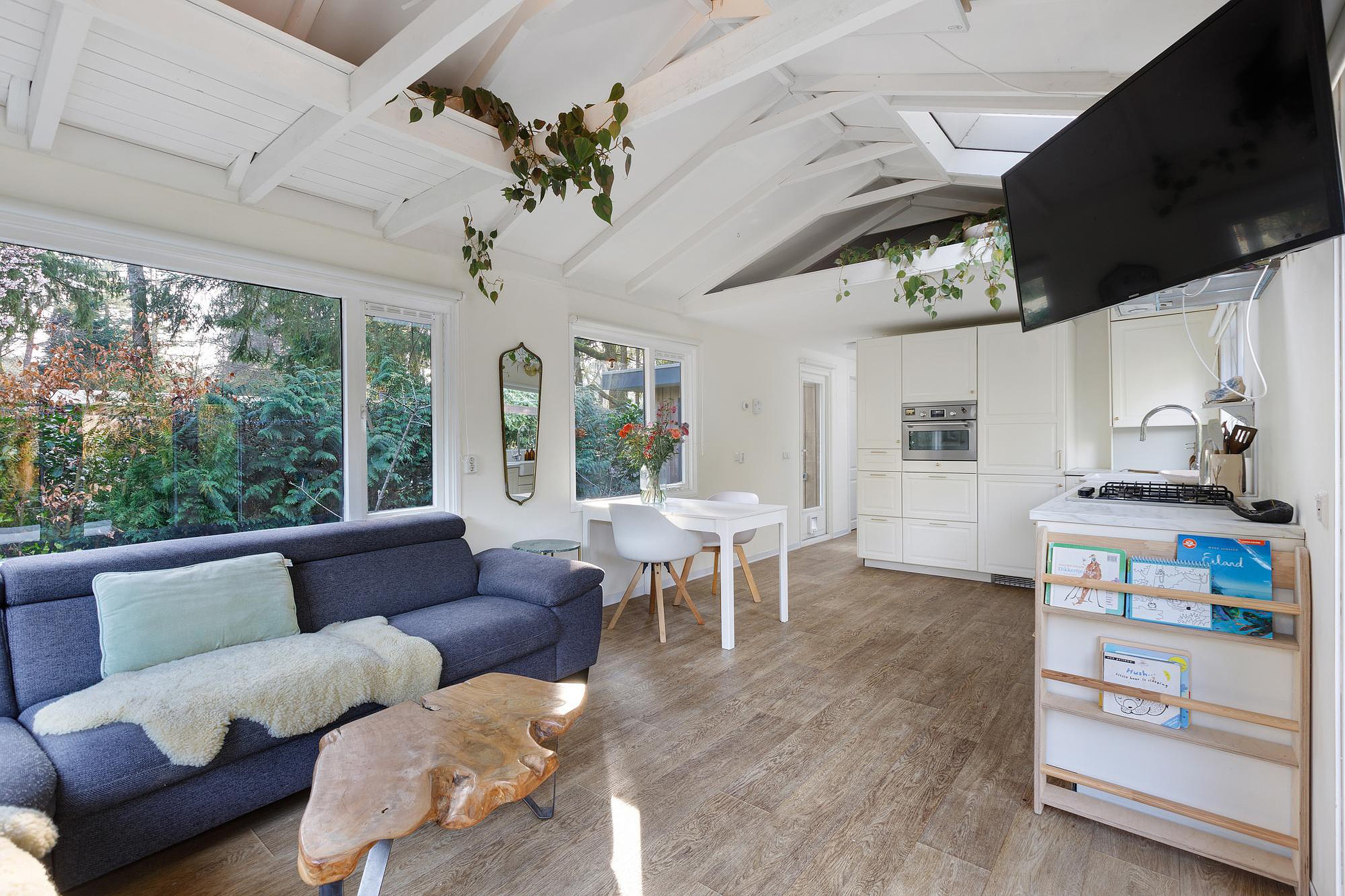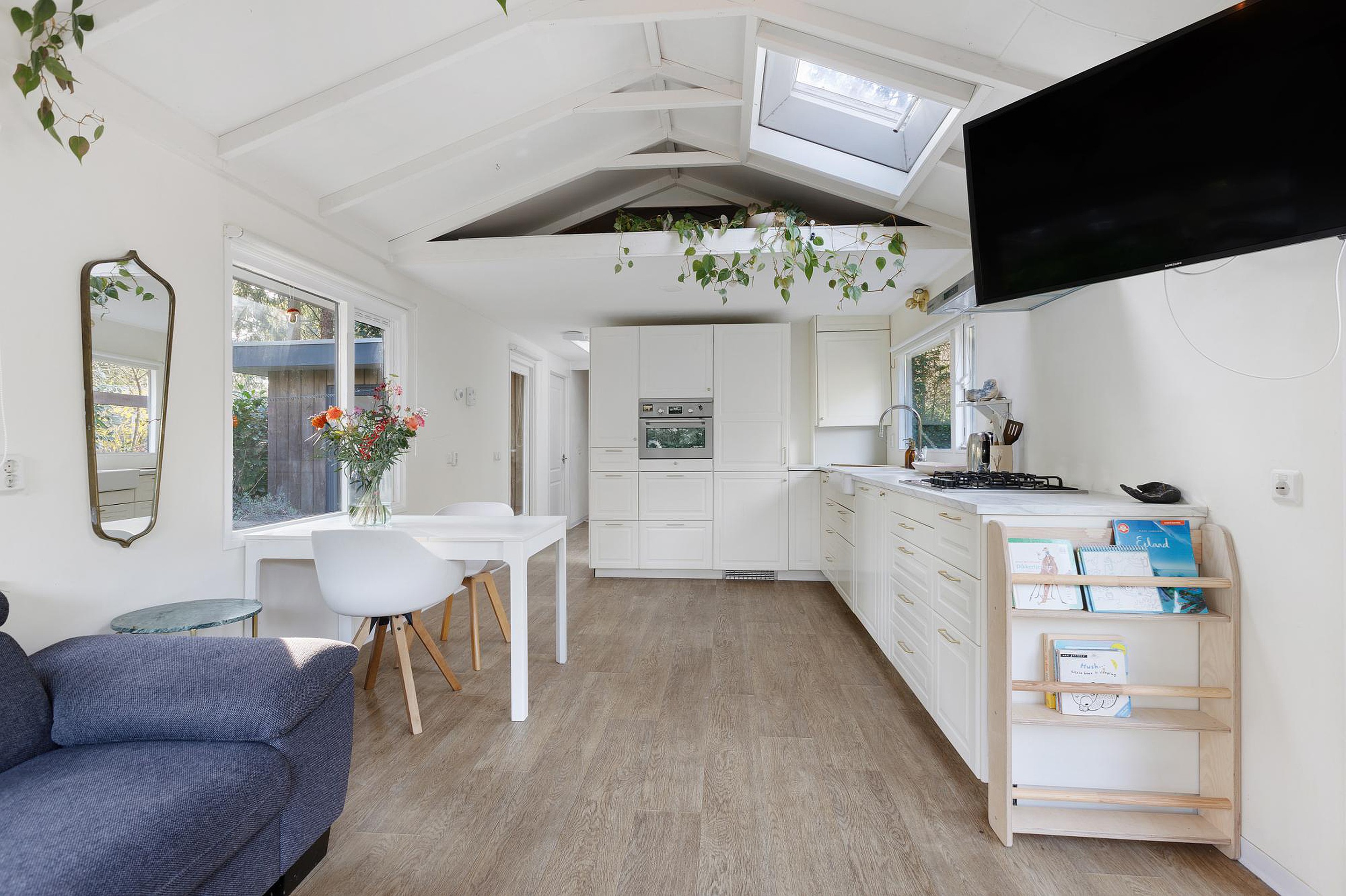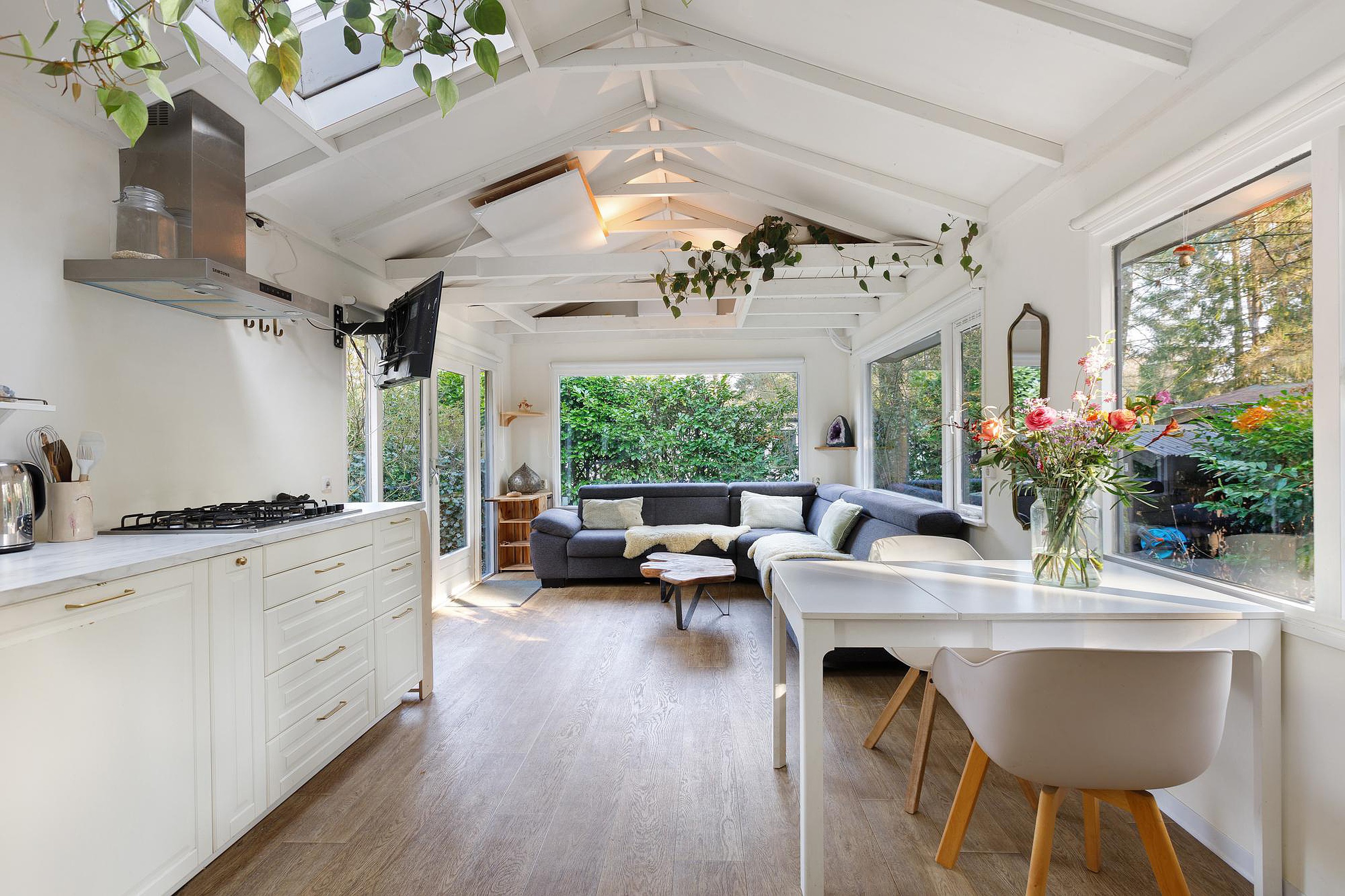 Bij binnenkomst stap je direct de lichte en sfeervolle woonkamer in, waar de hoge dakconstructie en grote raampartijen zorgen voor een ruimtelijk gevoel en veel natuurlijke lichtinval. De woning is volledig voorzien van vloerverwarming, wat bijdraagt aan extra comfort in alle seizoenen. Vanuit de woonkamer loopt de ruimte vloeiend over naar de open keuken, die is uitgerust met een nieuwe vaatwasser en extra lichtinval dankzij de aanwezige dakramen.